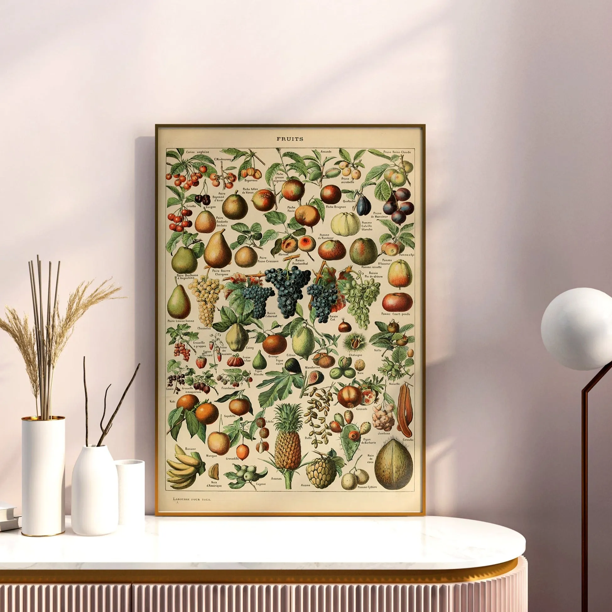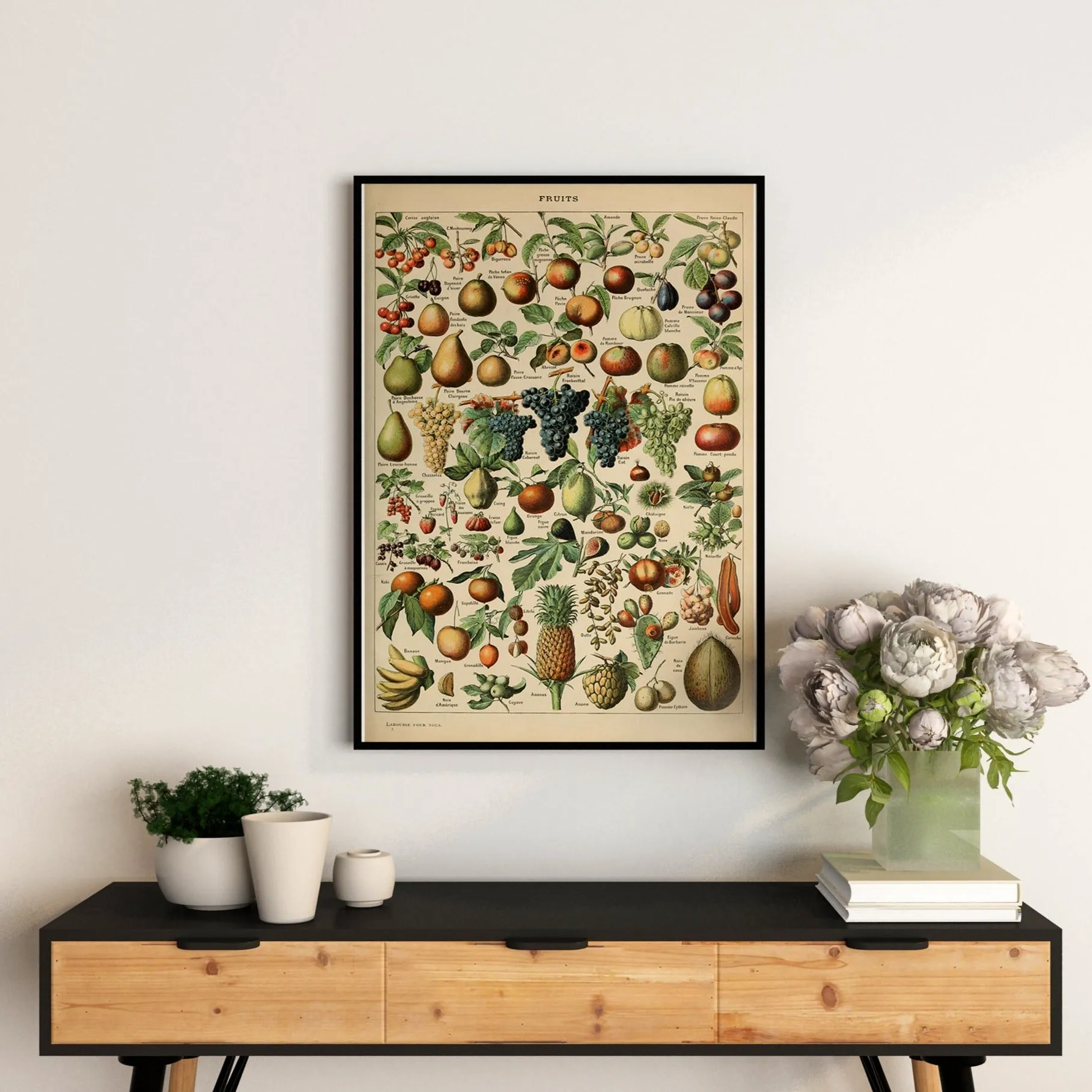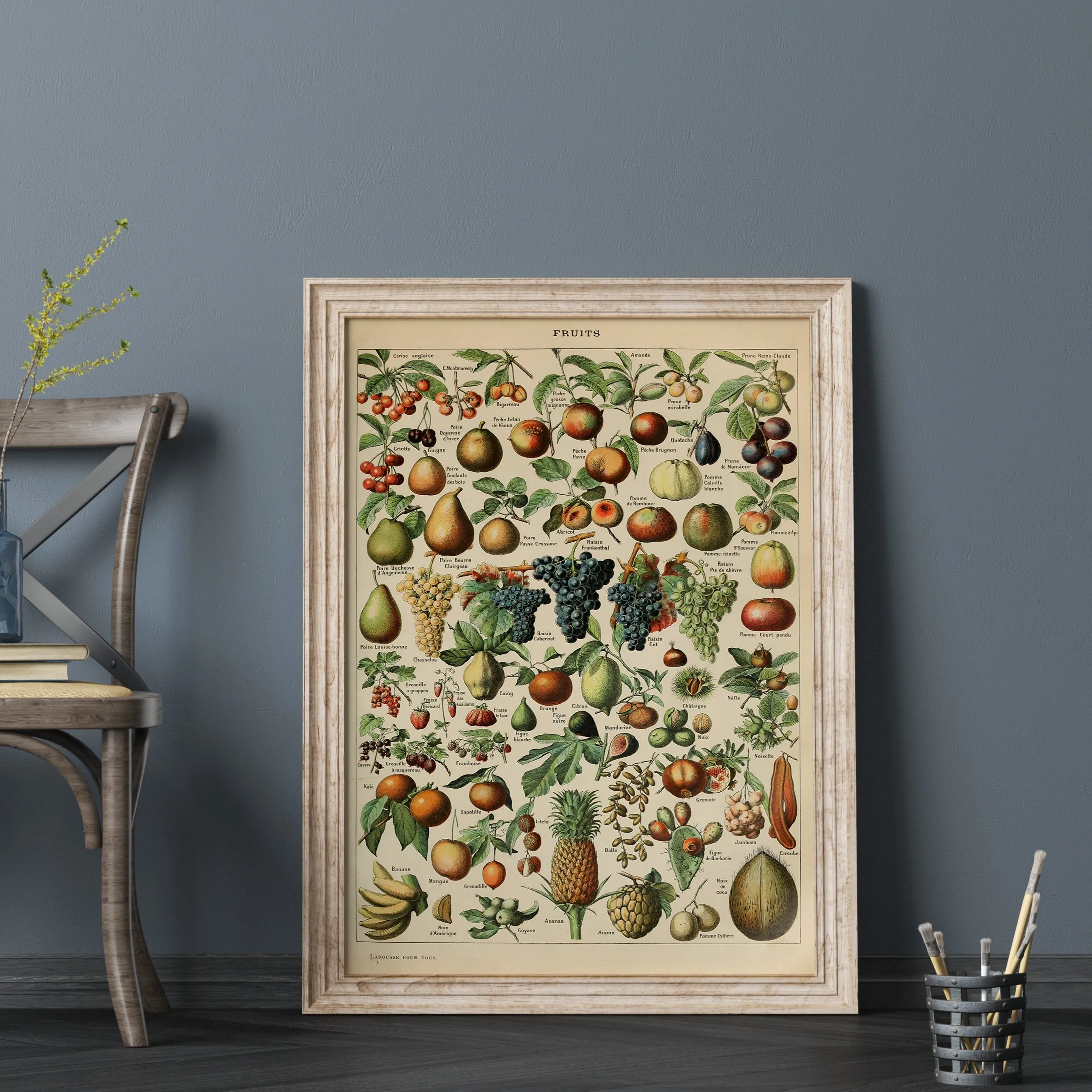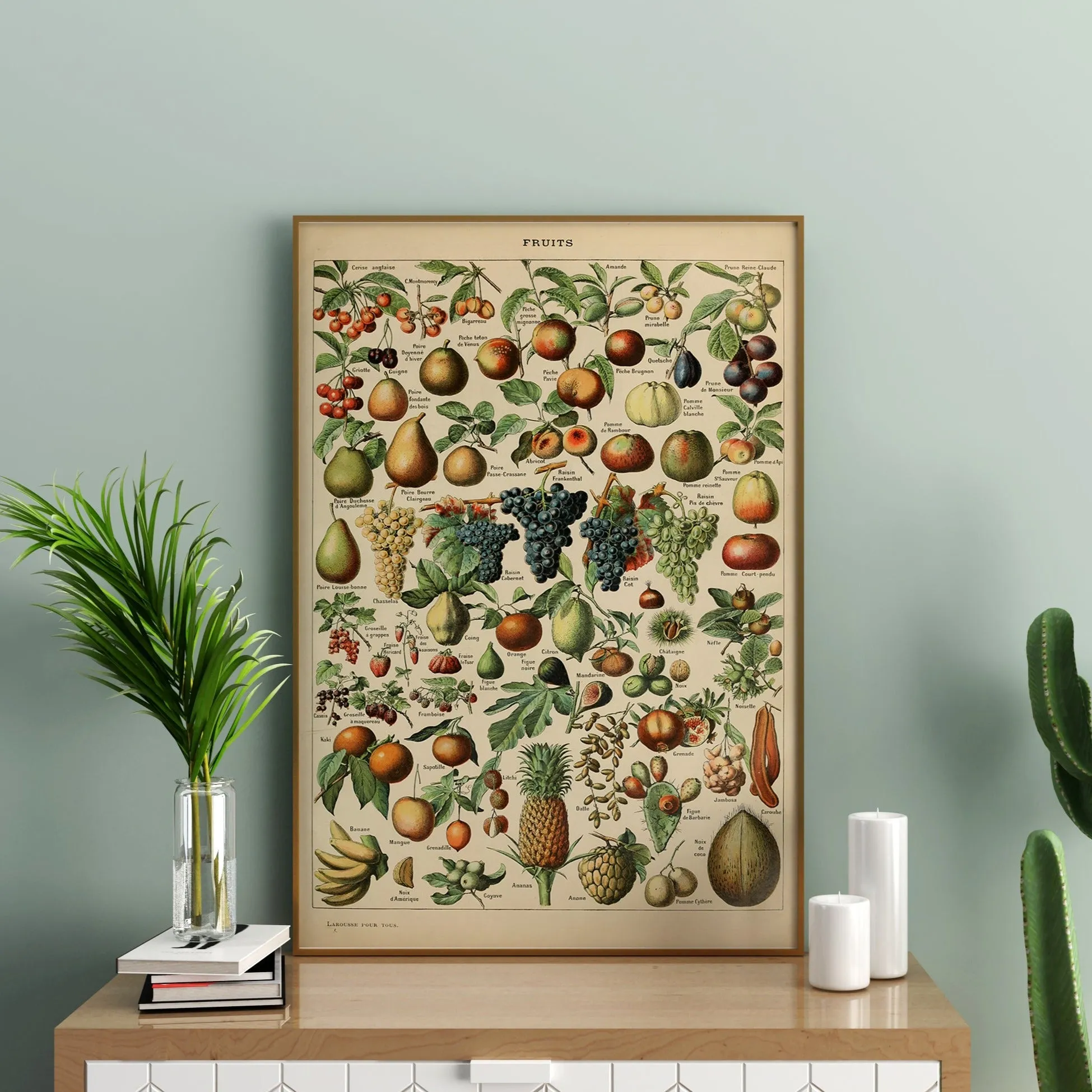 A detailed vintage plate showcasing a variety of fruits, emphasizing their textures, colors, and natural forms. Millot’s meticulous watercolor work transforms this educational illustration into a decorative piece of art.