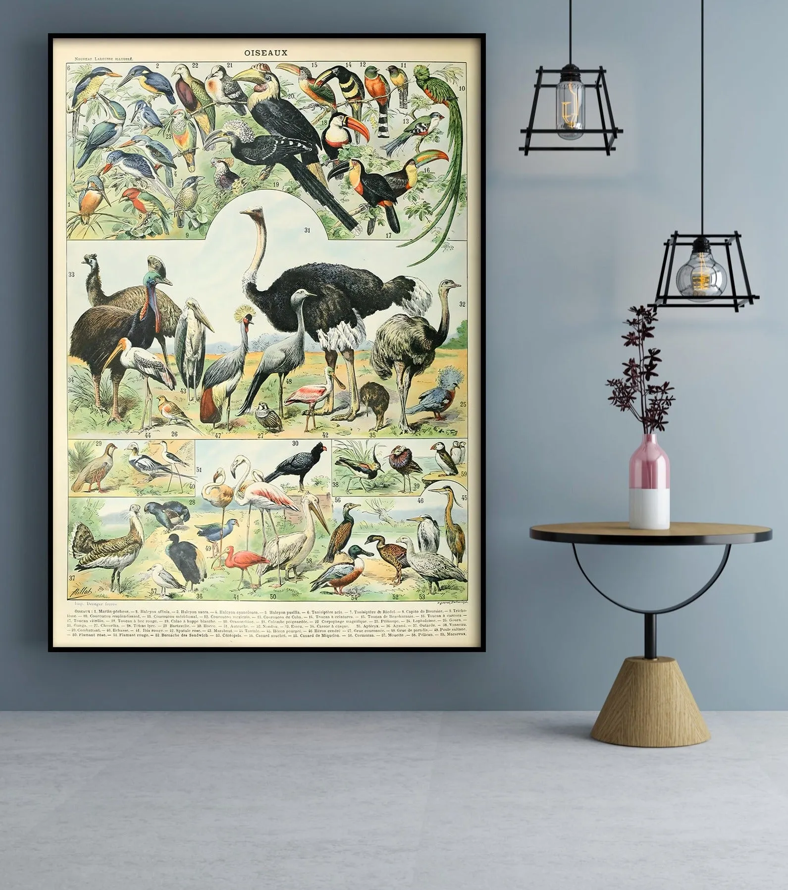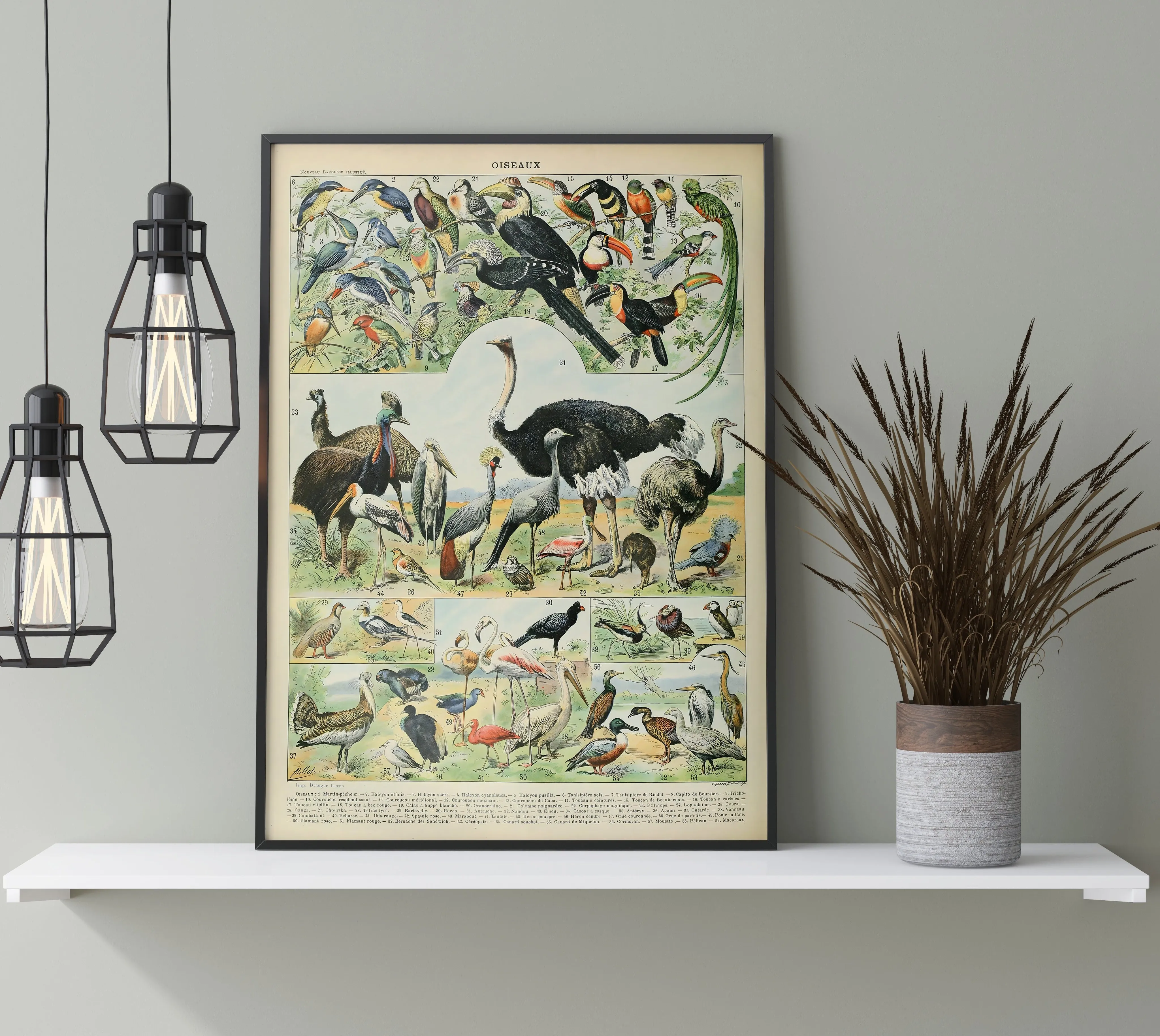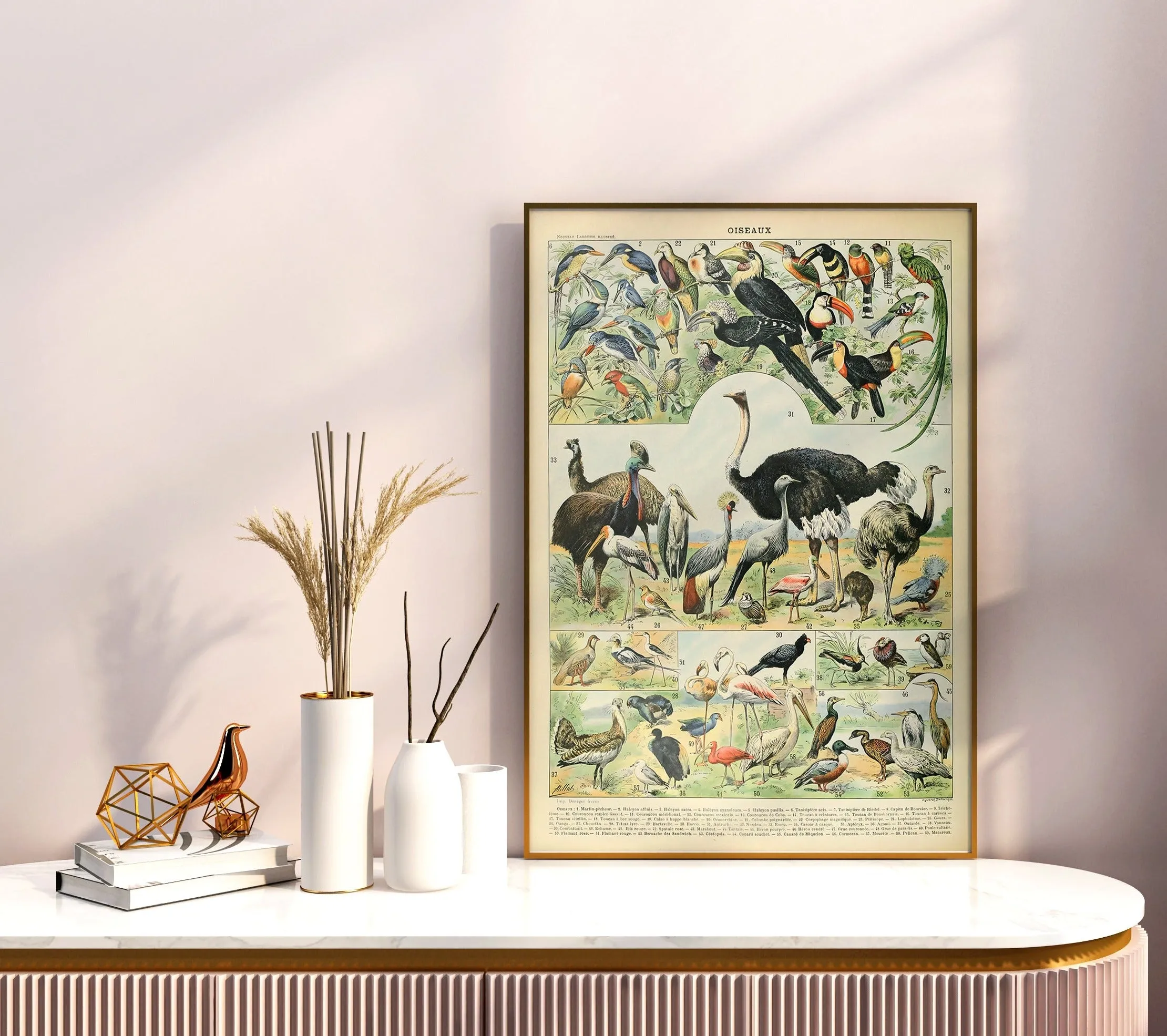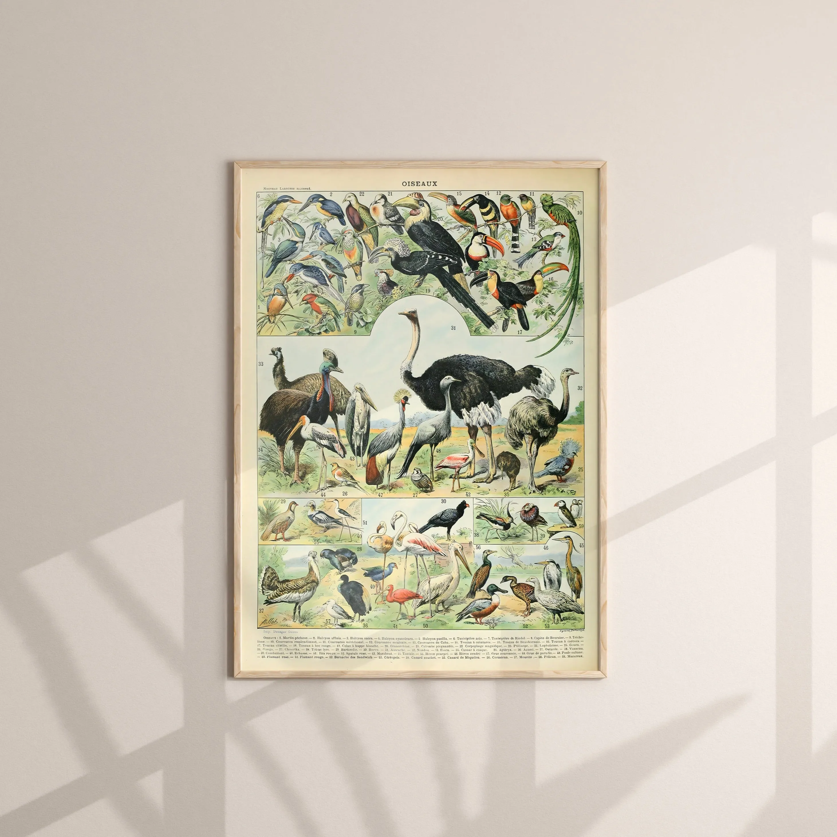 A vintage illustration celebrating the diversity of birds, with detailed depictions of plumage, posture, and species variety. Millot’s signature precision and soft watercolor tones make this print both educational and decorative, perfect for classic natural history wall decor.