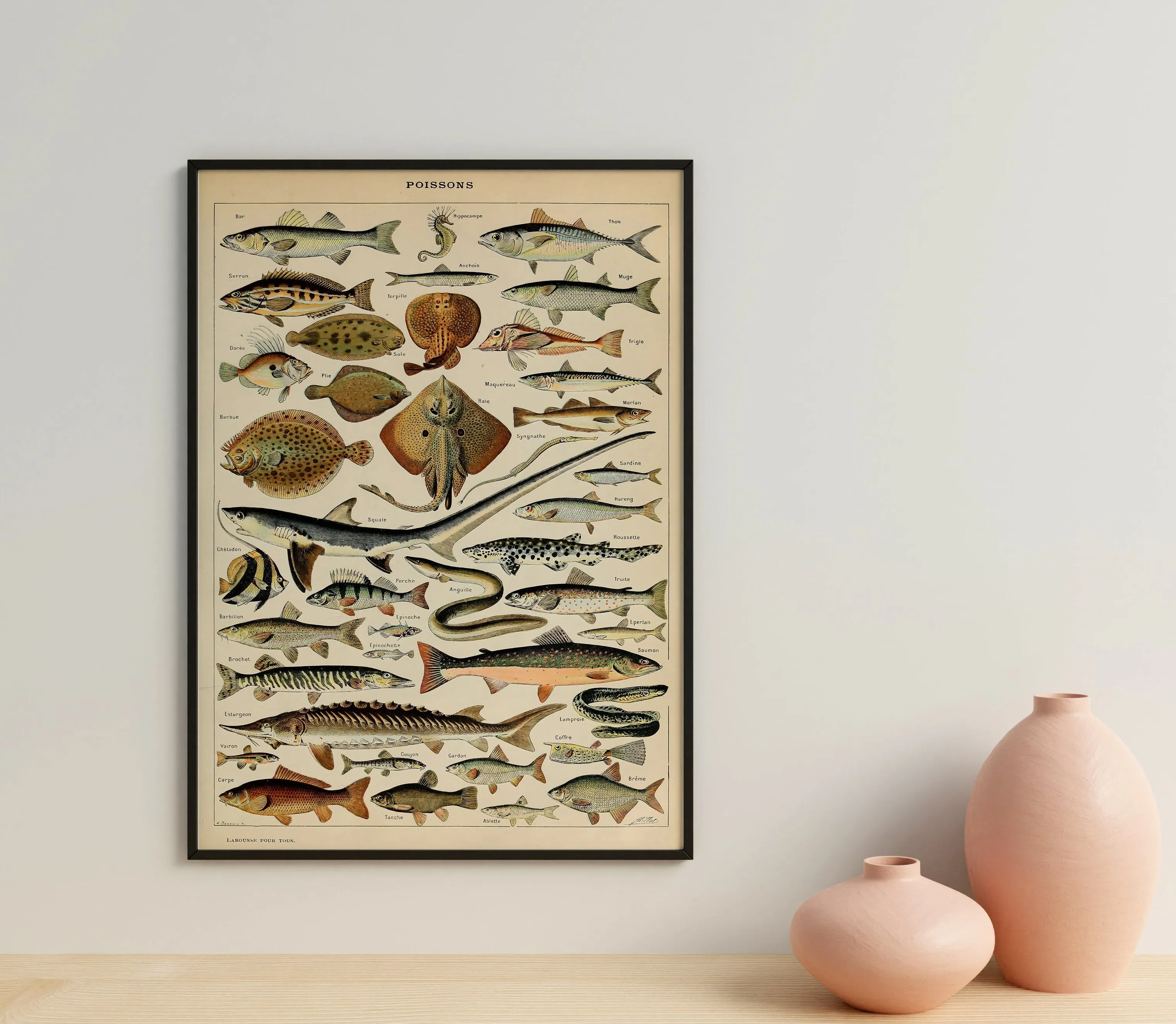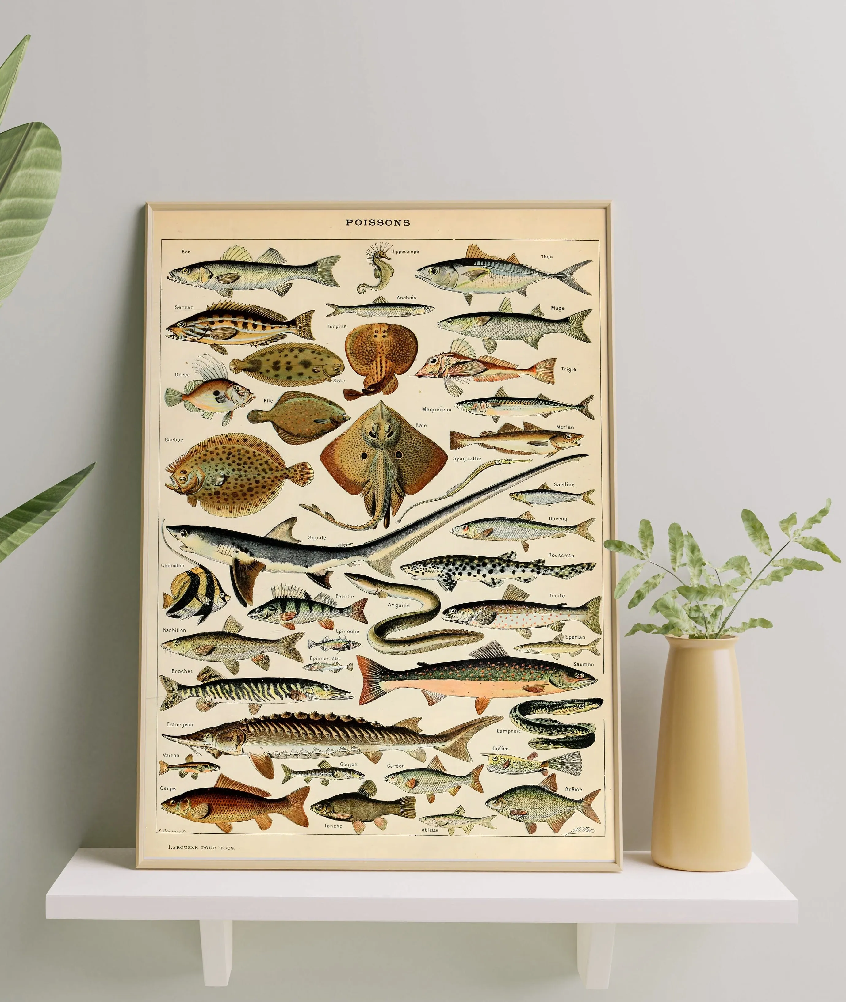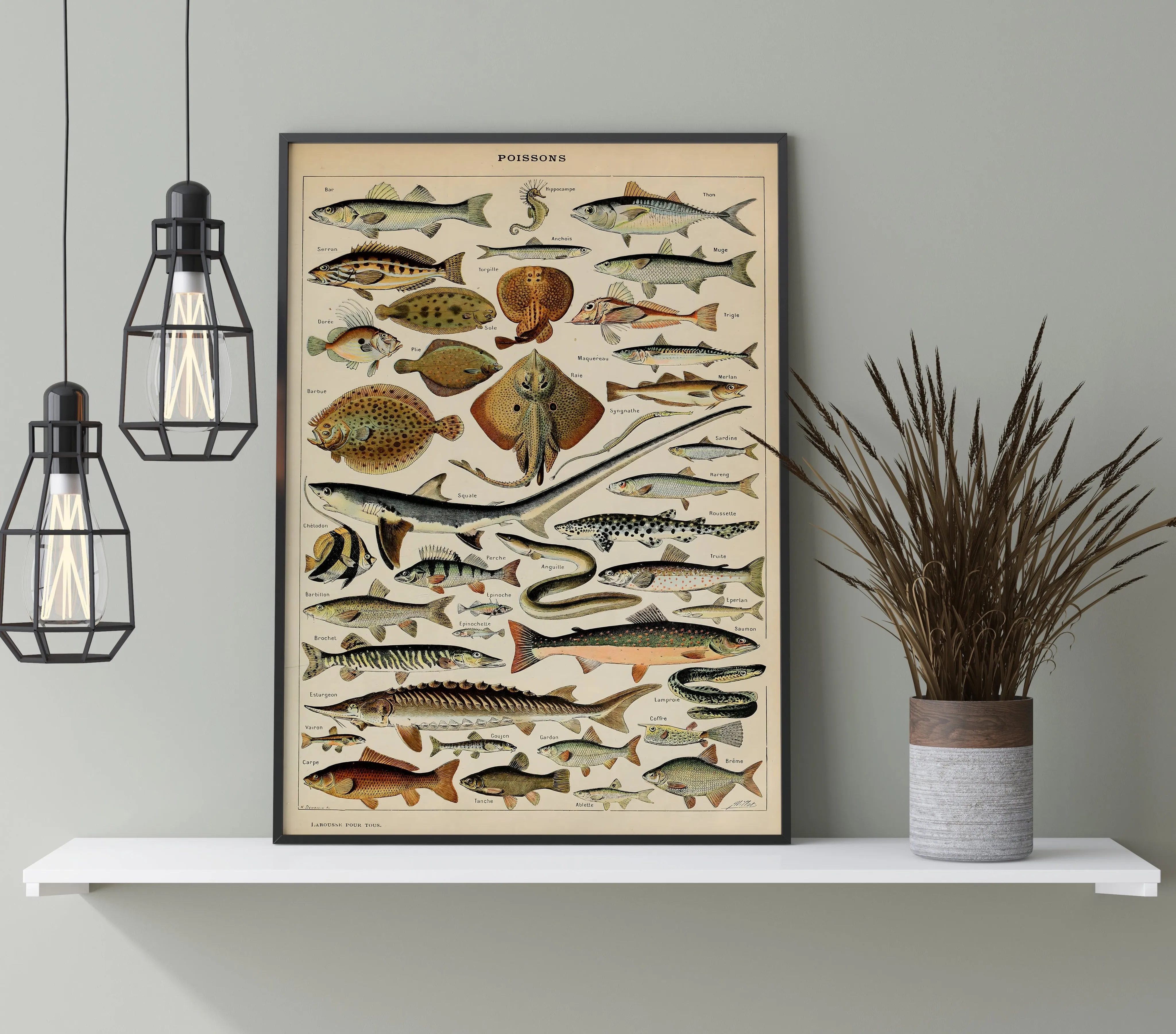 This classic 19th-century lithograph showcases a striking variety of marine fish, from elegant rays to shimmering flatfish. Millot’s delicate style makes it both educational and decorative — perfect for adding a touch of vintage marine character to any space.