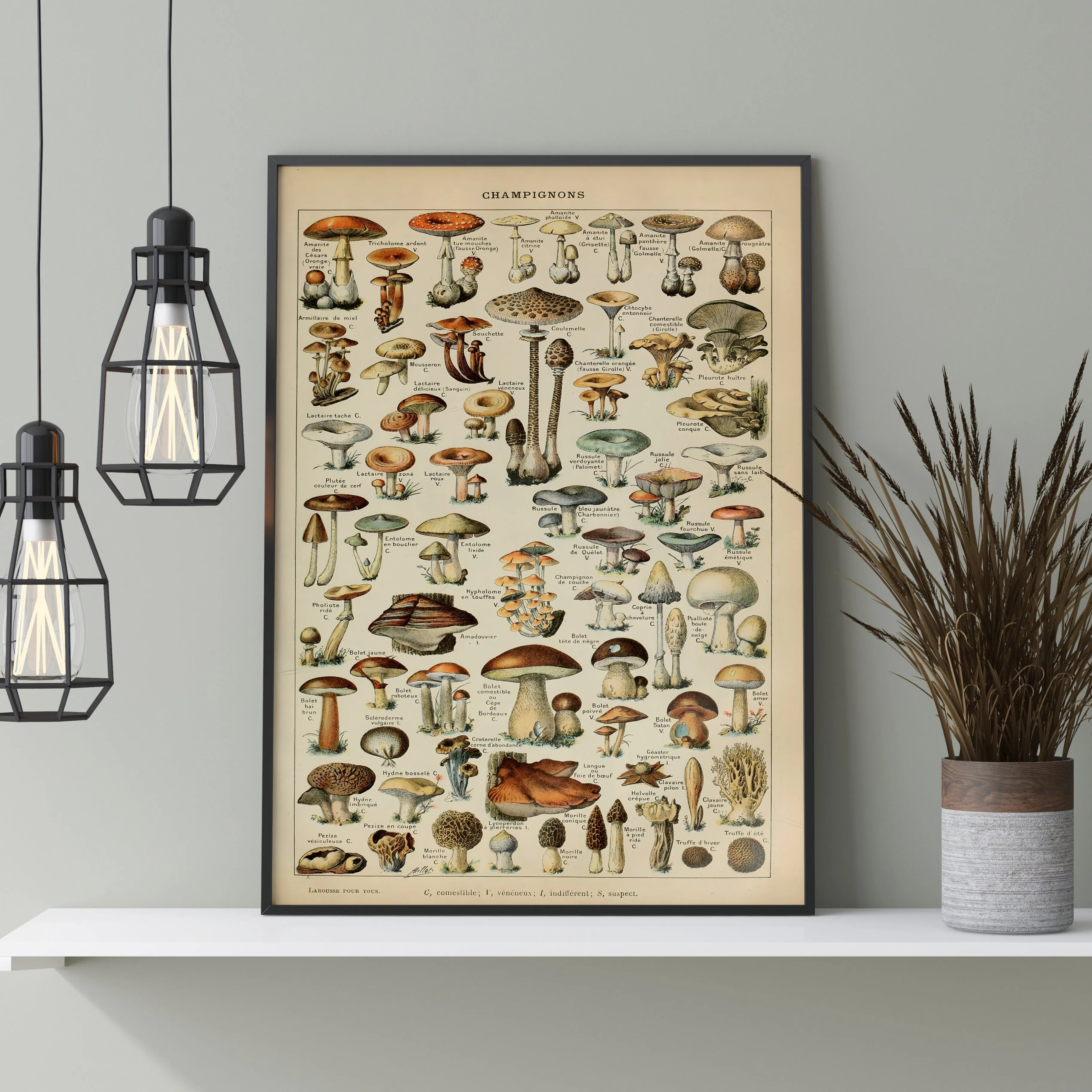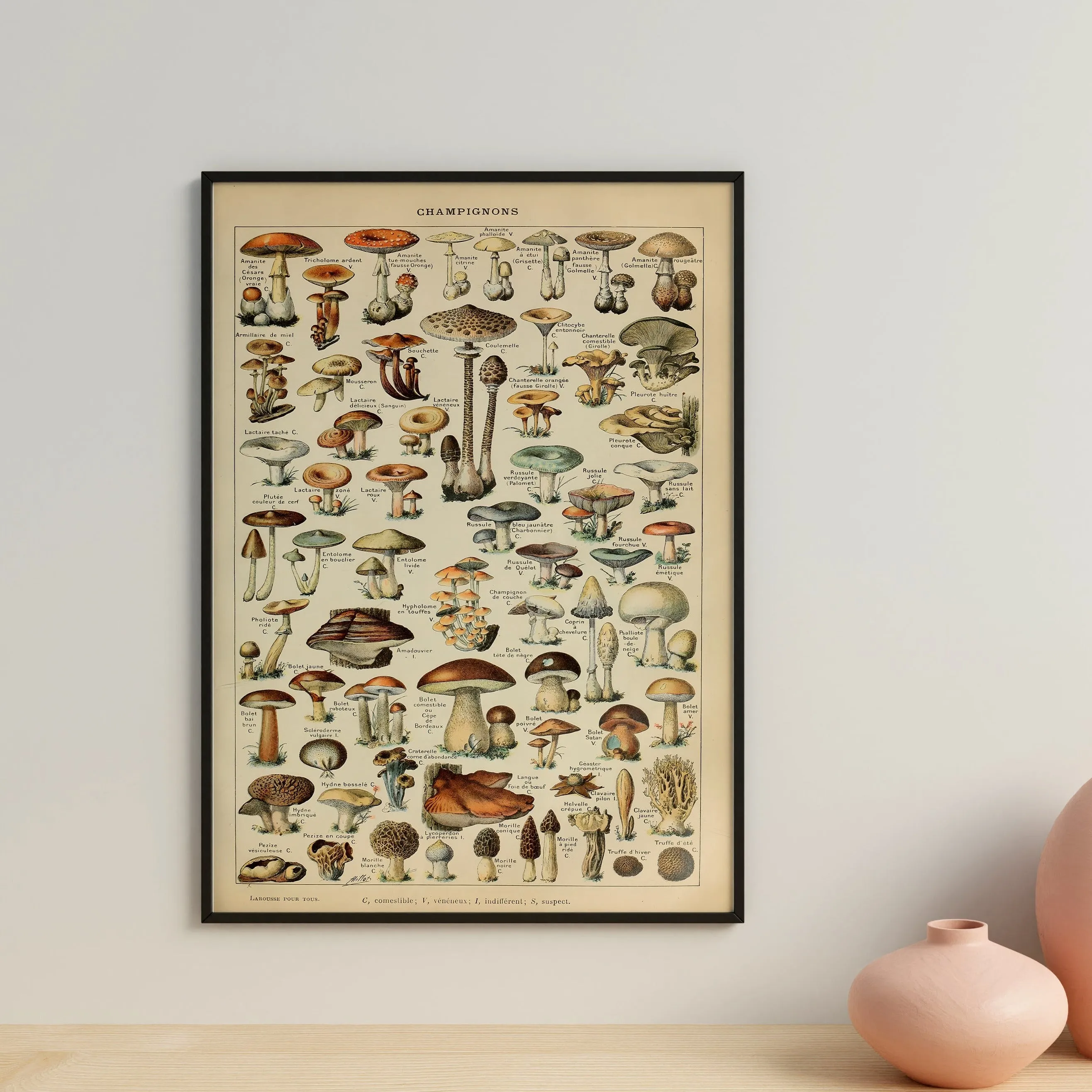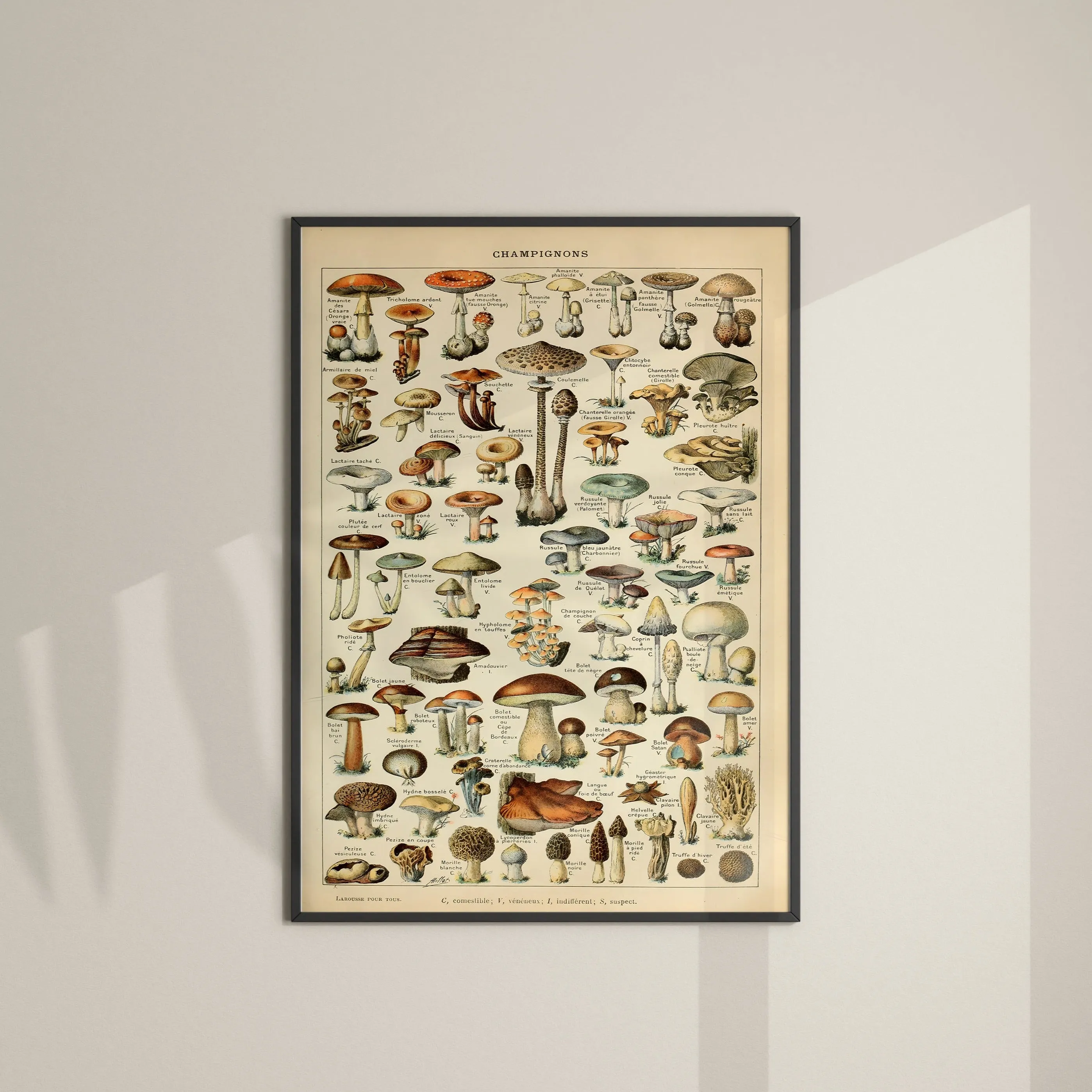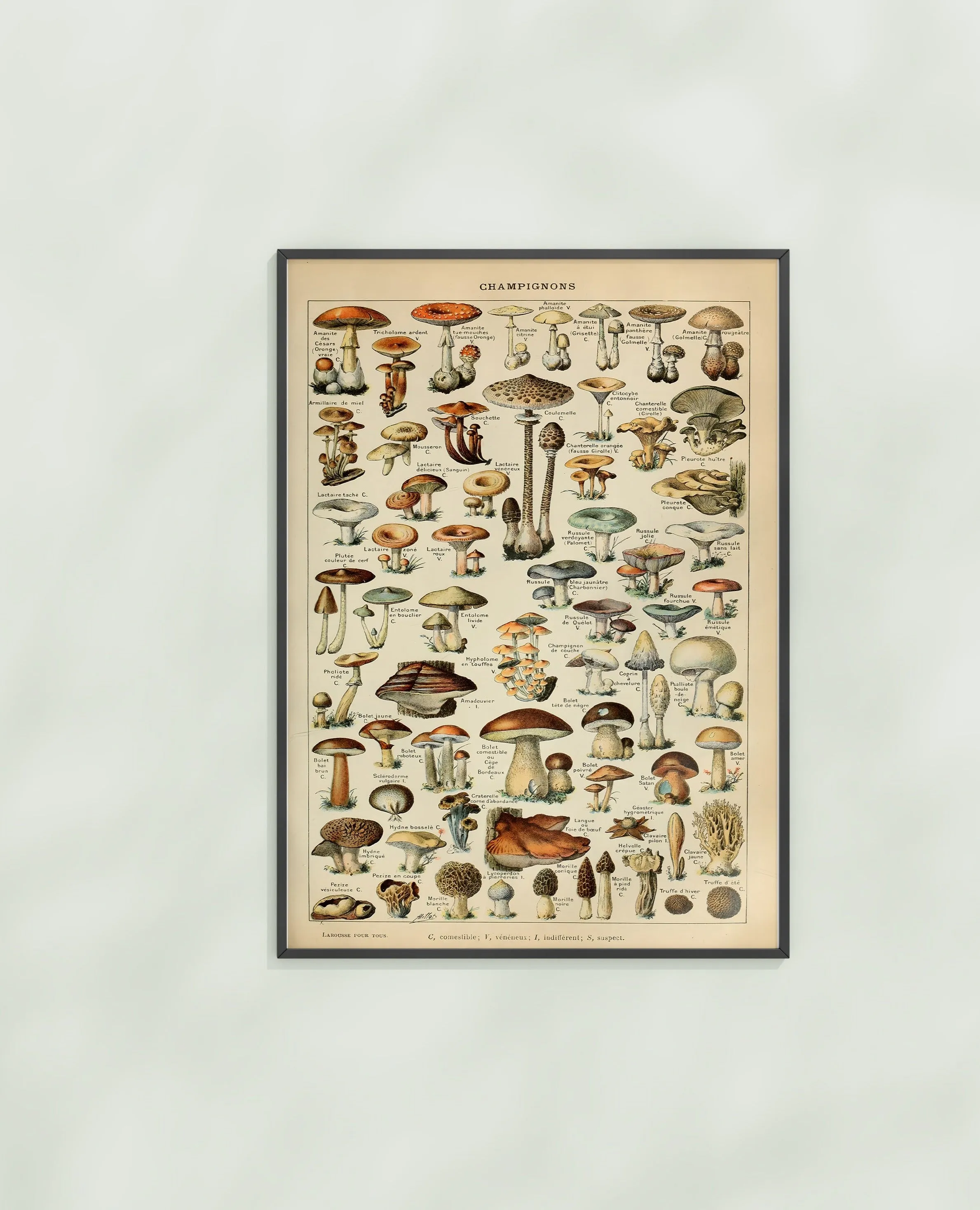 A vintage illustration of mushrooms and fungi, showcasing a variety of shapes, colors, and textures. Millot’s precise detailing and delicate watercolor style make this print both educational and decorative — perfect for adding classic natural history charm to any space.