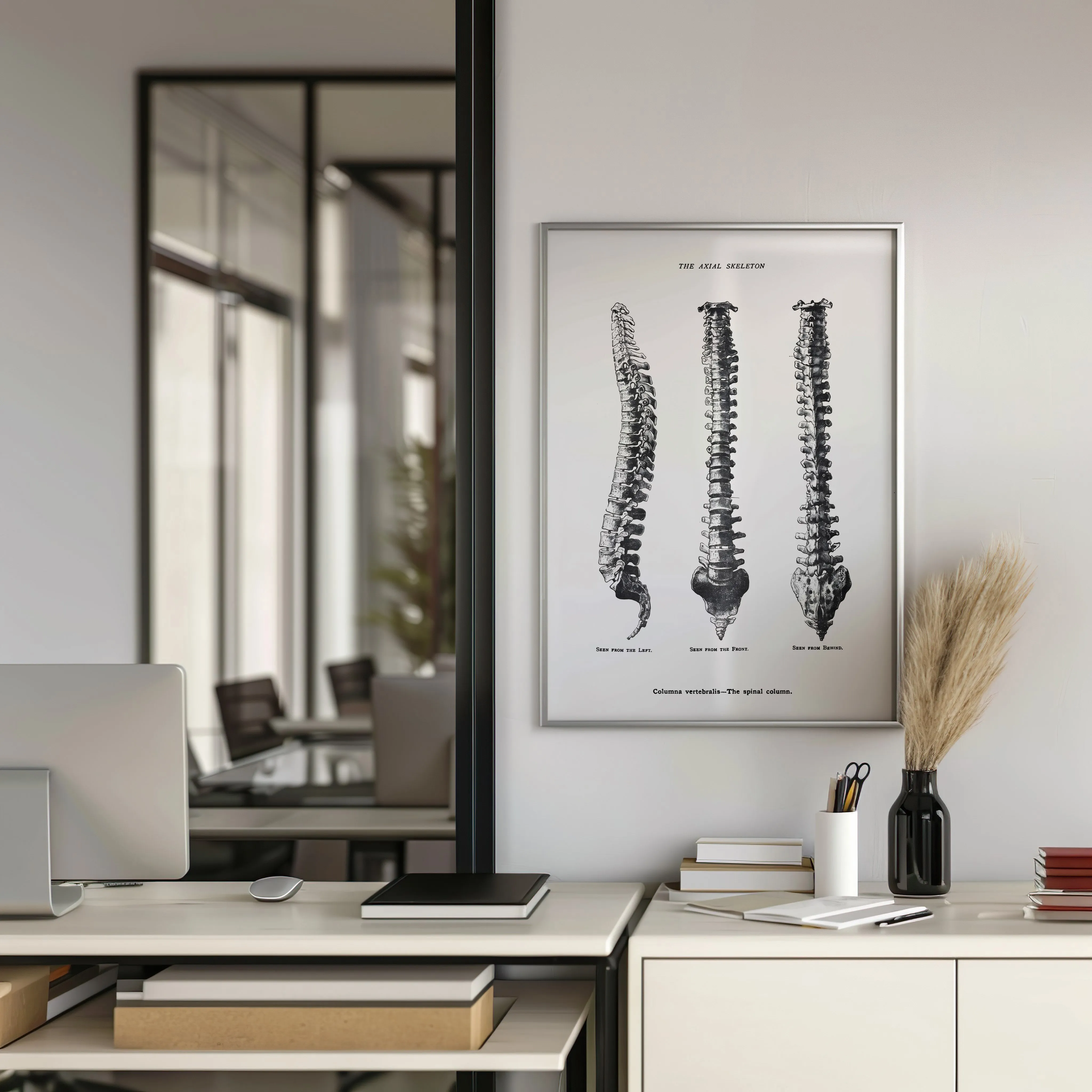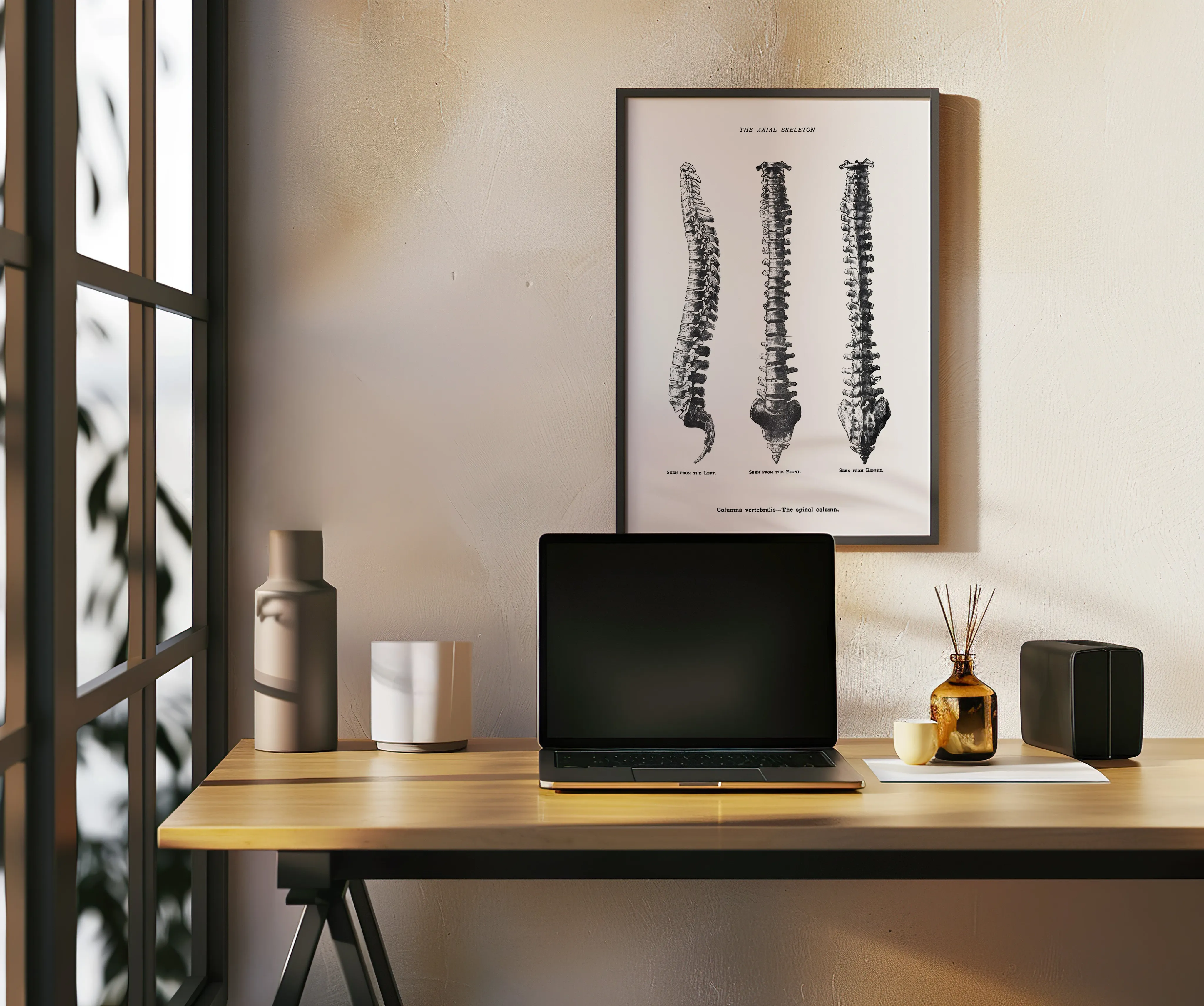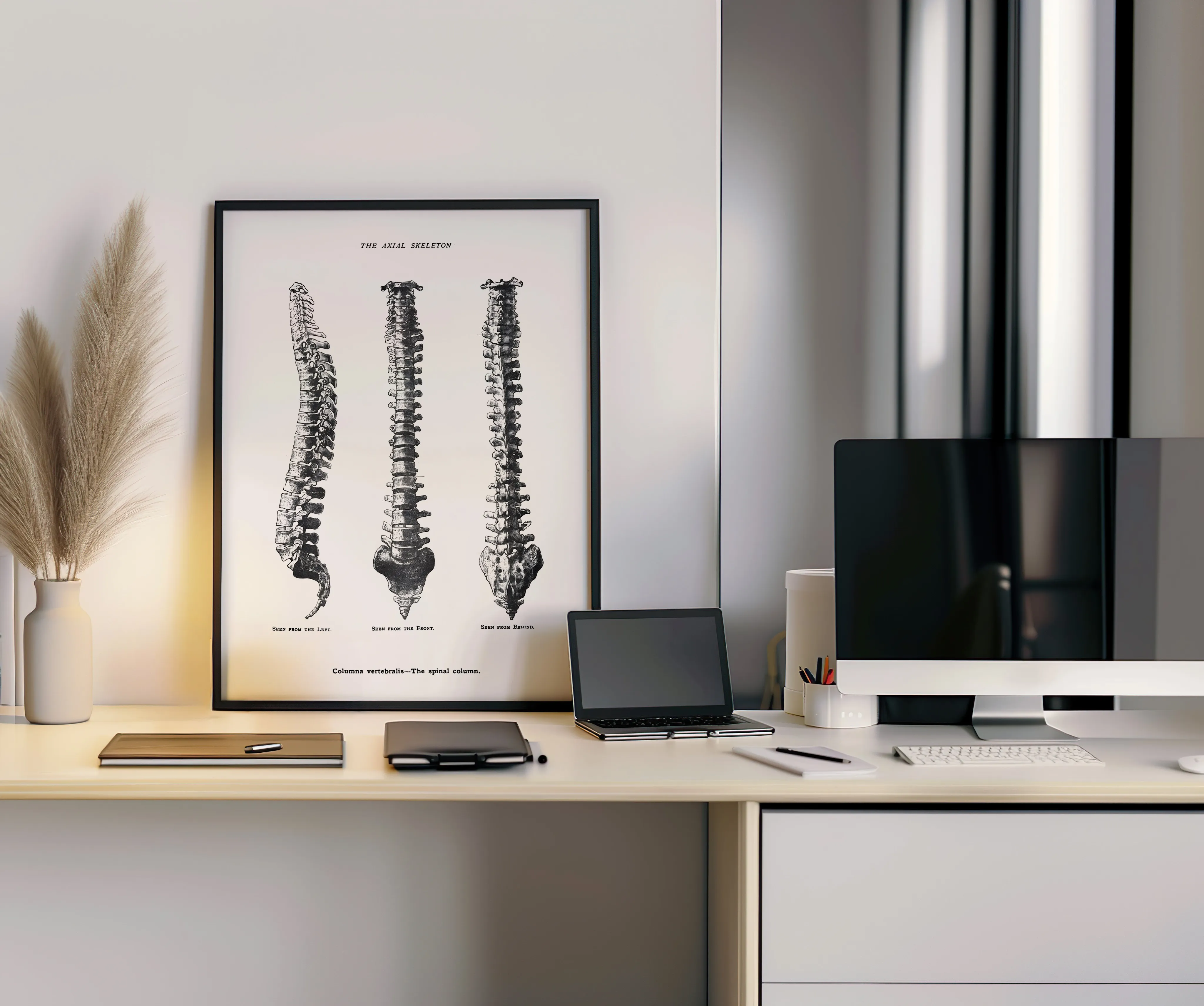 Anatomical print showing the frontal, lateral, and posterior views of the human spinal skeleton