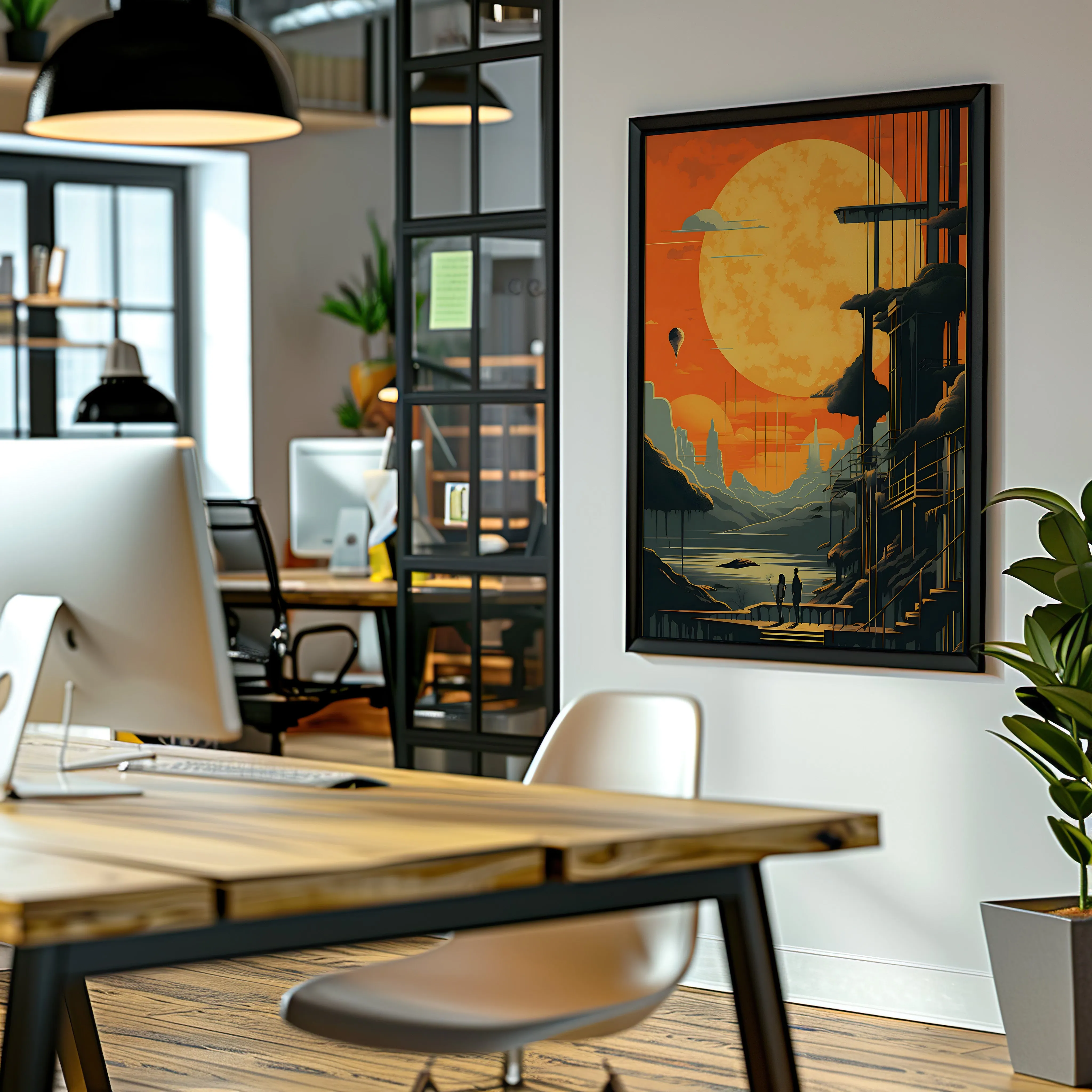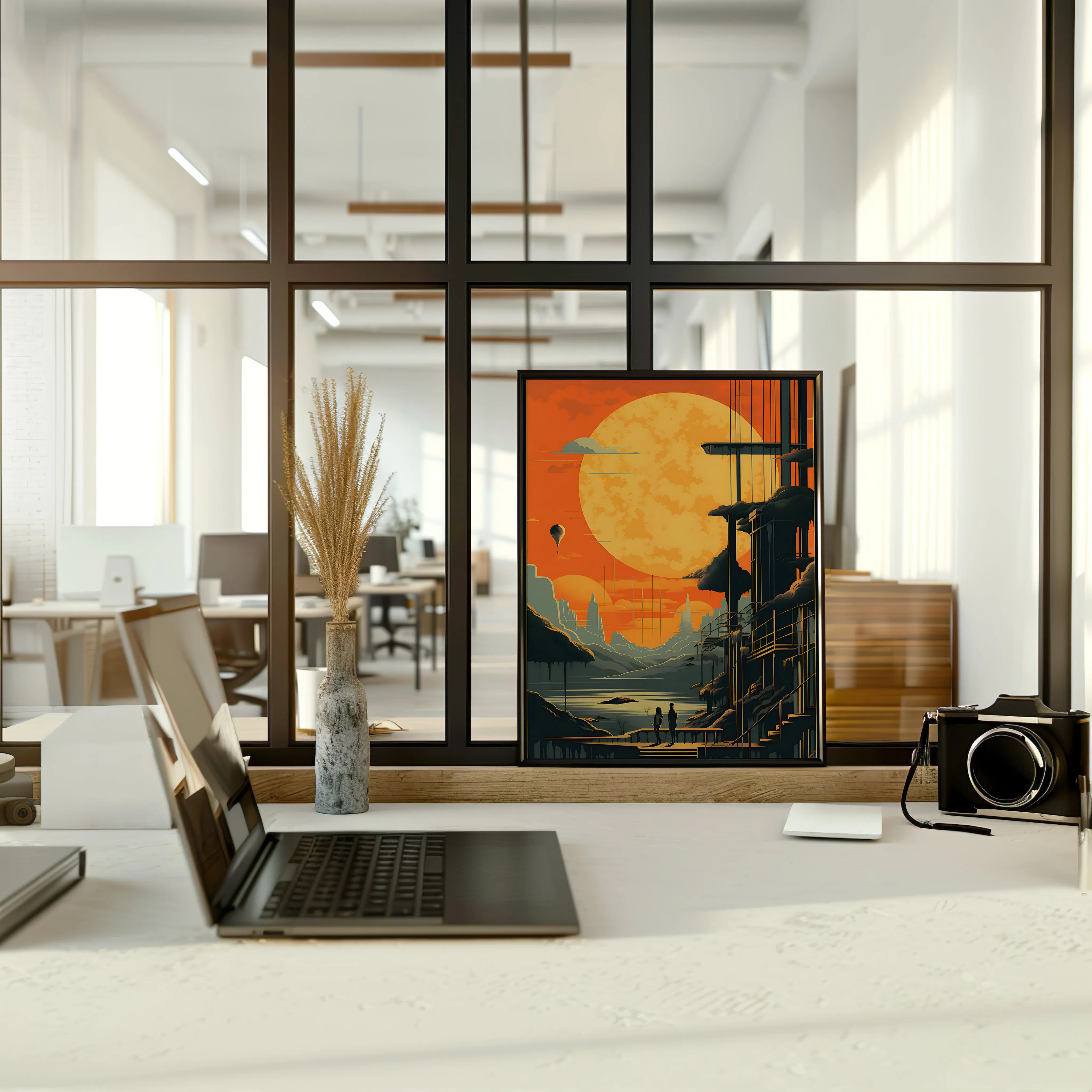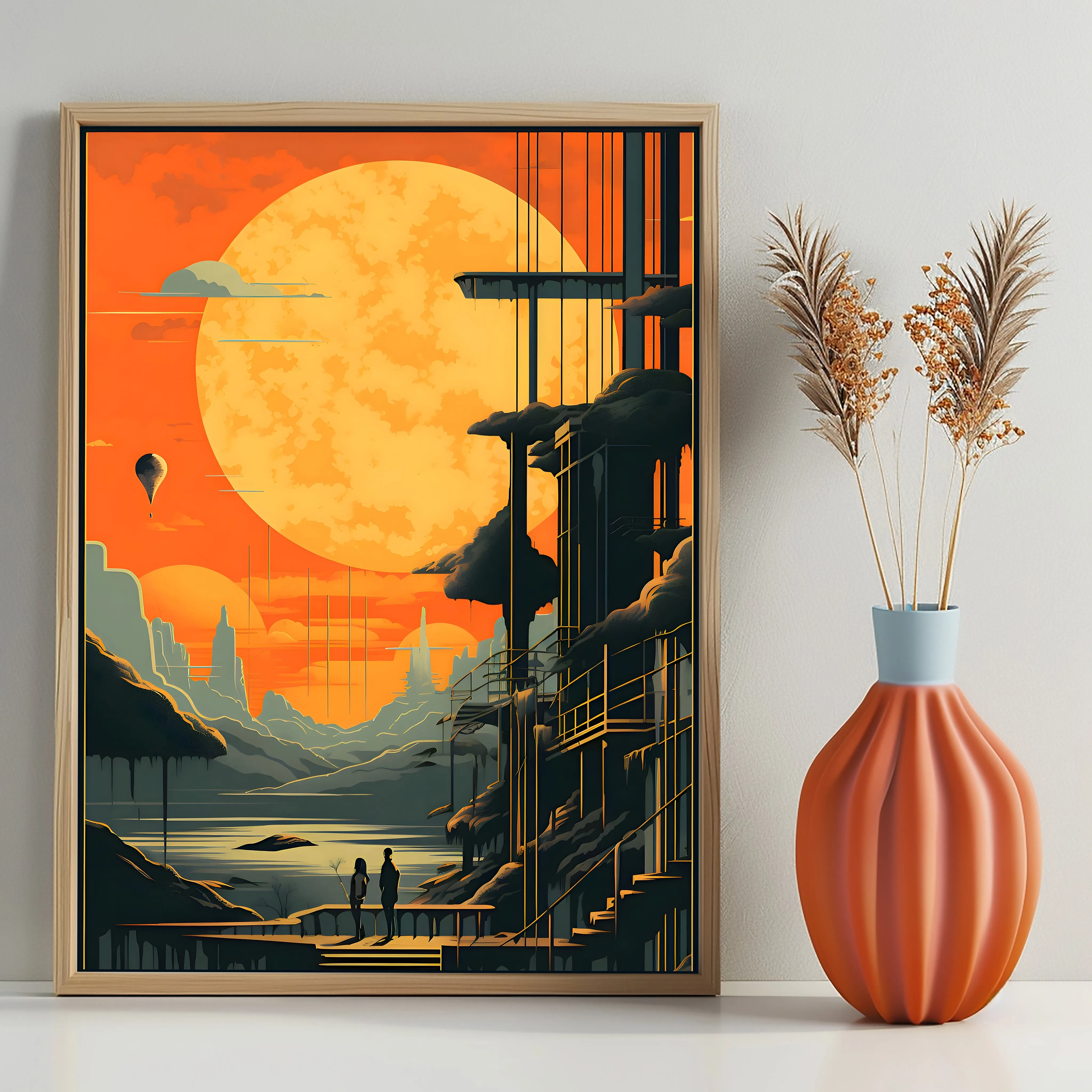This artwork features a dramatic palette of fiery orange, golden yellow, deep teal, and dark charcoal, creating a powerful and atmospheric landscape. The subject presents a futuristic canyon-like environment with layered structures and stairways overlooking a calm lake, while two small figures stand together watching a massive glowing sun dominate the sky, adding a sense of scale and wonder. A distant floating balloon and surreal vertical elements enhance the dreamlike sci-fi setting. The piece is created using digital illustration with bold silhouettes, geometric forms, and smooth gradient lighting, giving it a cinematic retro-futuristic style. Because of its striking colors and imaginative scene, this artwork fits beautifully in spaces such as a living room, office, studio, hallway, or gaming room, especially for sci-fi lovers and fans of atmospheric landscapes