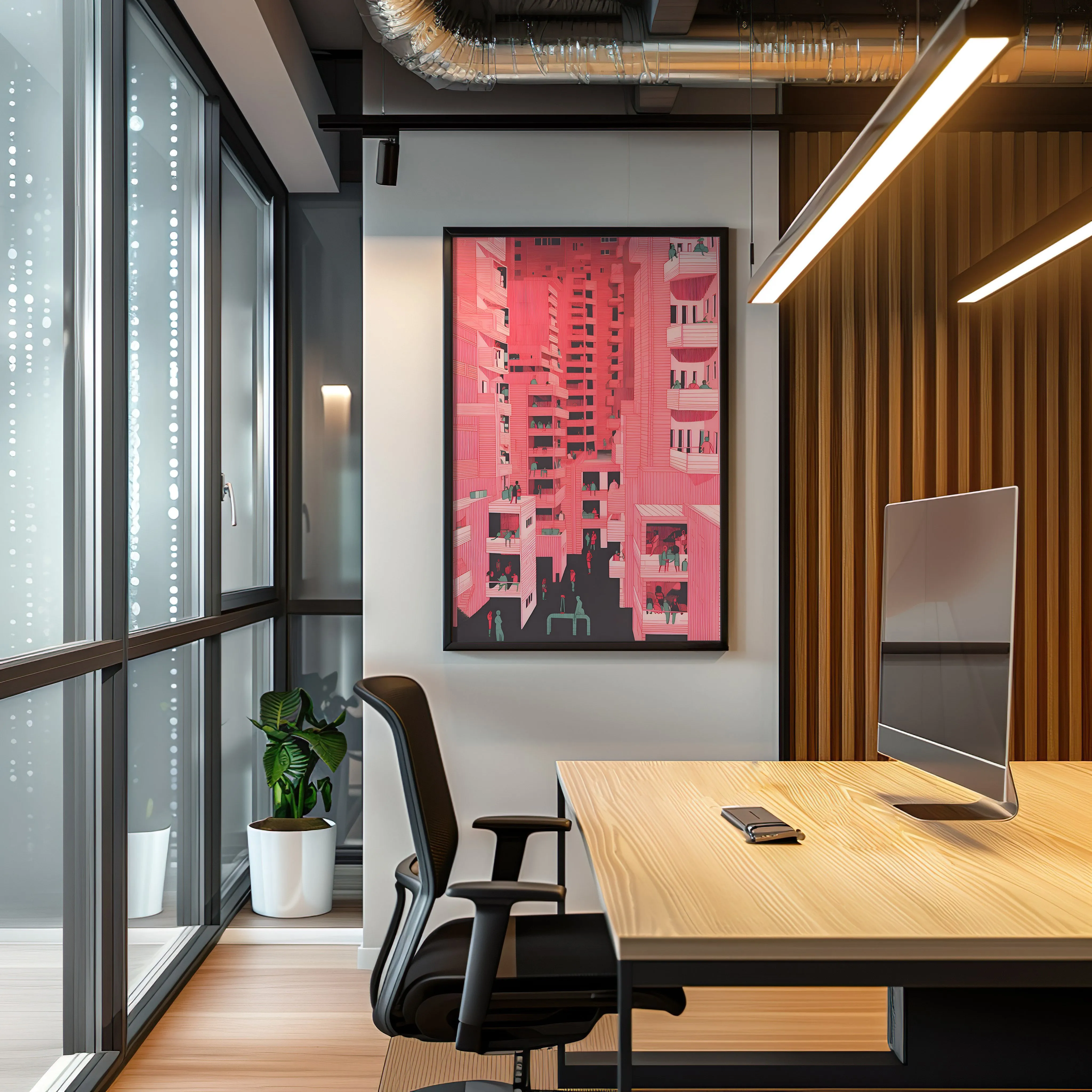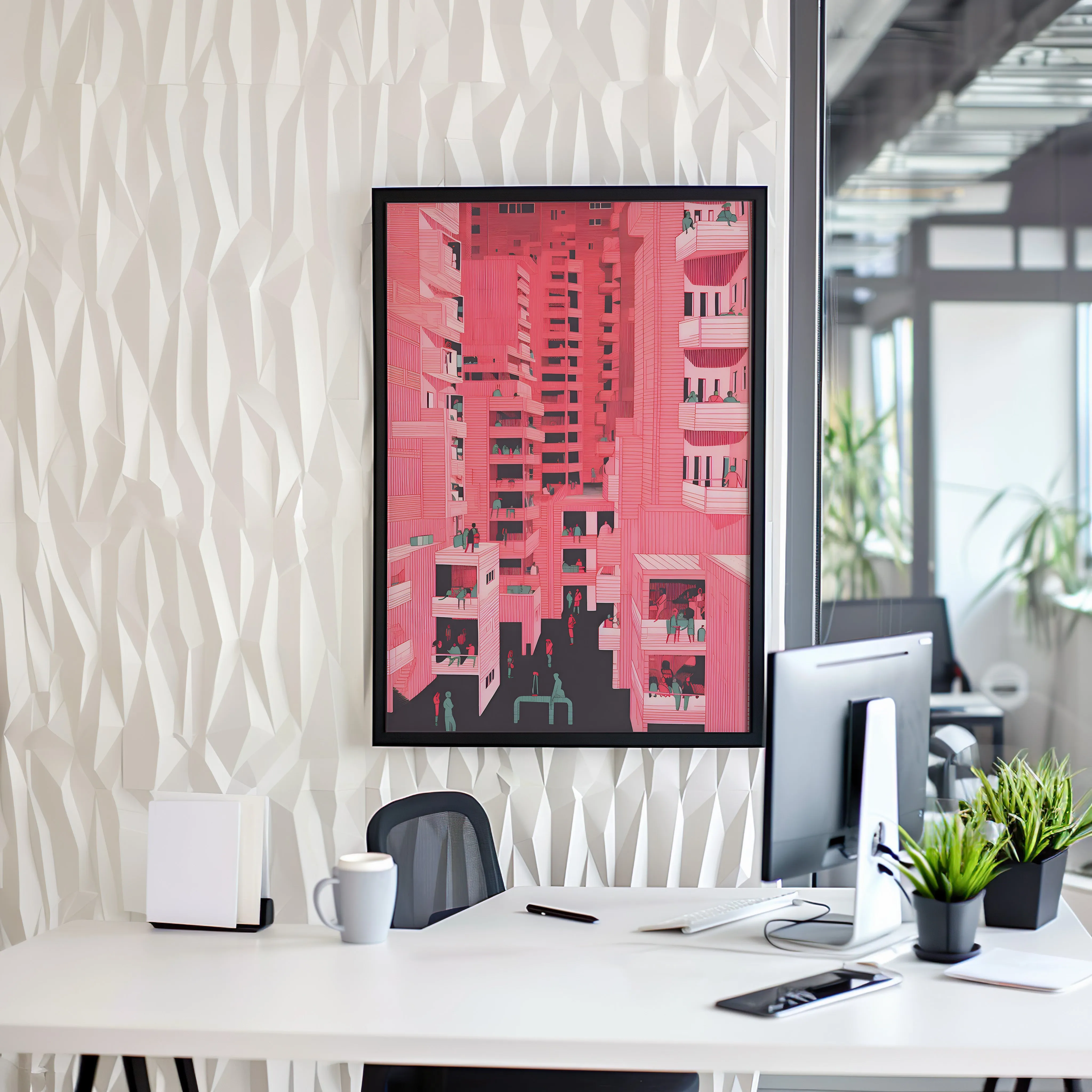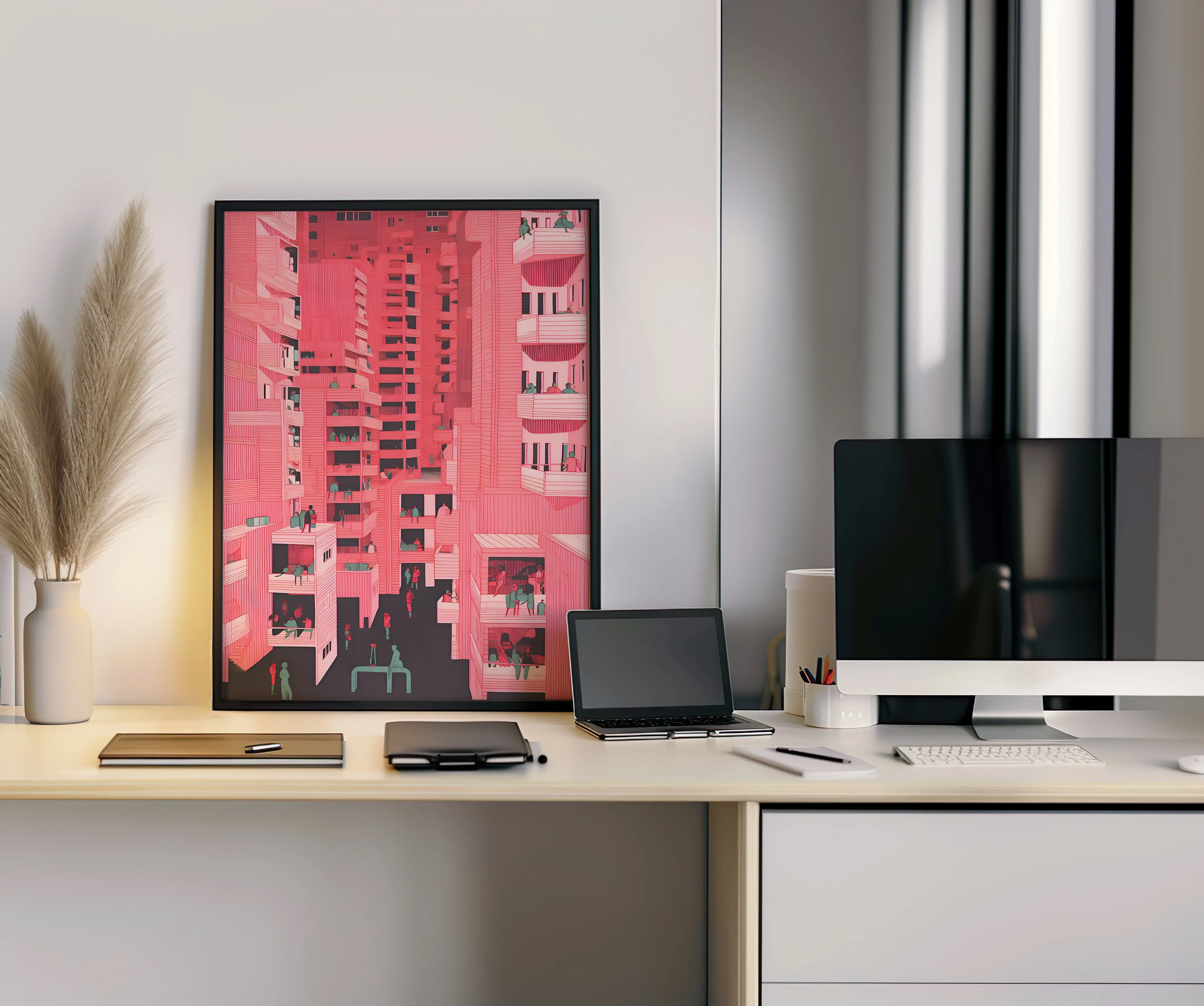 This artwork features a bold palette of vibrant coral pink, soft rose, muted teal, and deep charcoal, creating a lively and graphic urban atmosphere. The subject depicts a dense cityscape of stacked apartment buildings filled with balconies, windows, and small scenes of everyday life, where people gather, talk, relax, and move through narrow streets between towering structures. The piece is created using digital illustration with fine linework, repetitive architectural patterns, and flat color layers, giving it a contemporary graphic and slightly surreal urban style. Because of its dynamic composition and social urban theme, this artwork fits beautifully in spaces such as a living room, office, studio, hallway, or creative workspace, especially for architecture lovers and fans of modern city life.