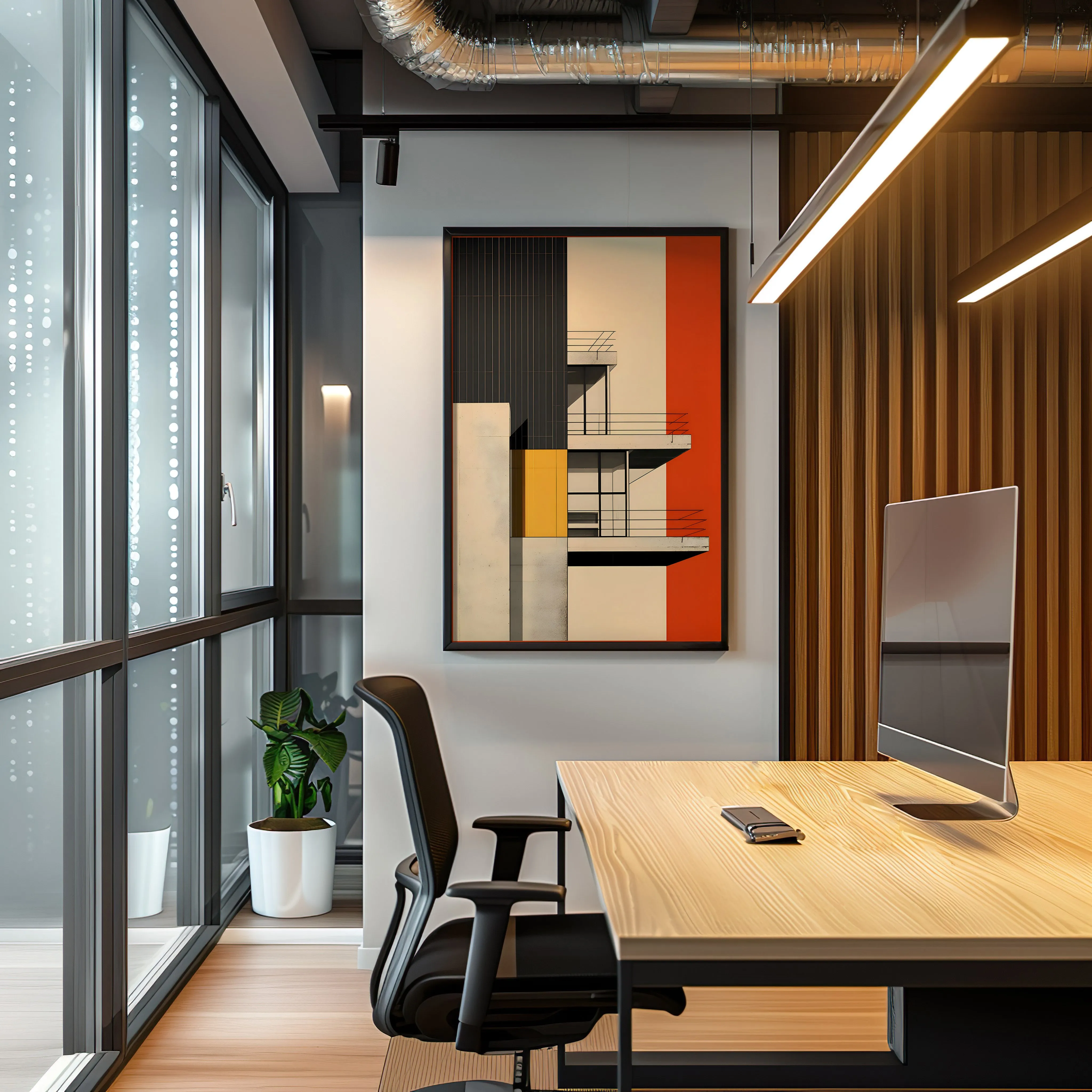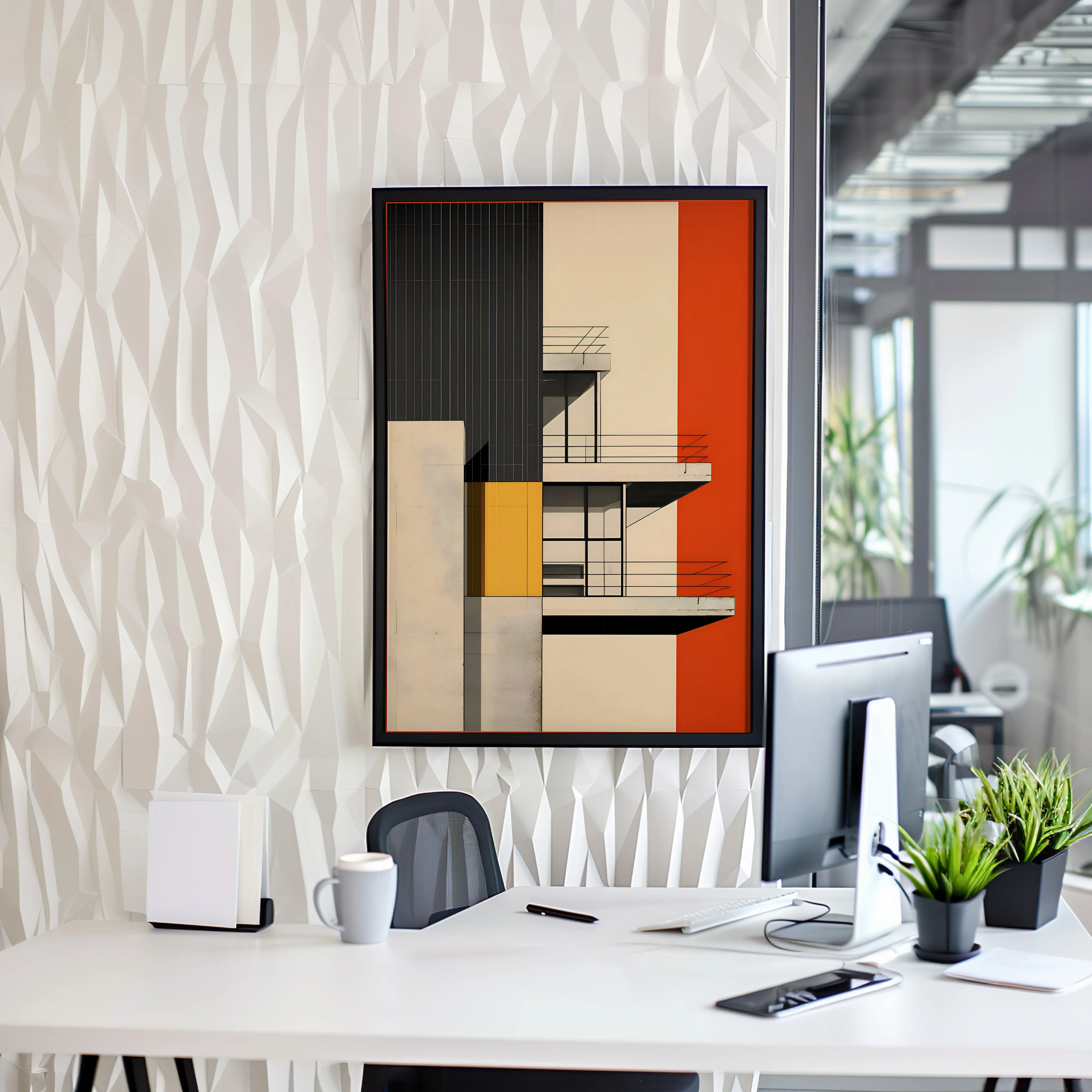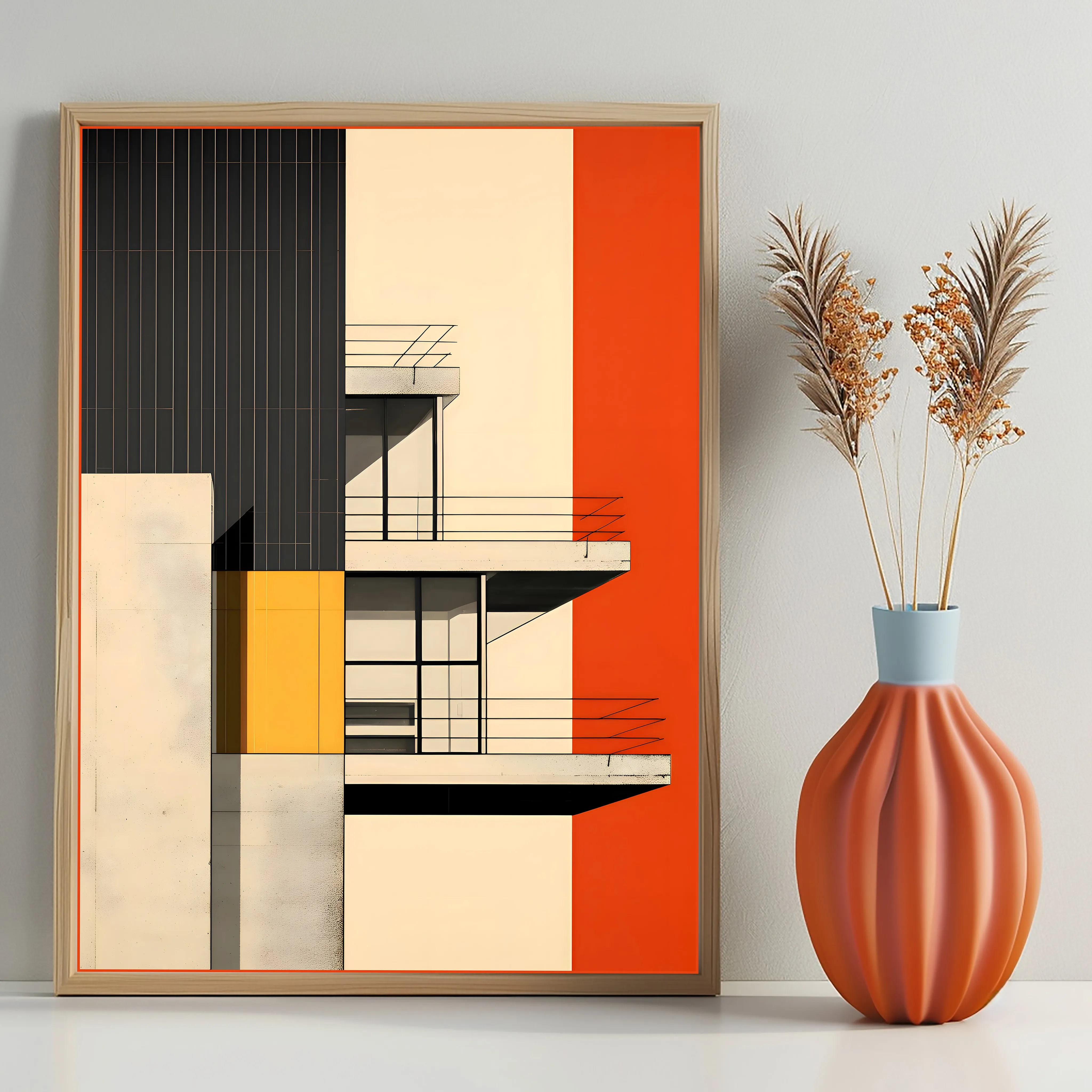 This artwork features a striking palette of warm red, deep charcoal, soft cream, and vibrant yellow, creating a bold contrast between color and architectural form. The subject highlights a modernist building facade with clean balconies, glass windows, and strong geometric volumes, emphasizing balance, symmetry, and minimalist design. The piece is created using digital illustration with crisp lines, flat color blocks, and precise geometric composition, reflecting modern architectural aesthetics and contemporary graphic design. Because of its strong visual structure and vibrant colors, this artwork works beautifully in spaces such as a living room, office, studio, hallway, or modern workspace, especially for architecture enthusiasts and lovers of modern design.