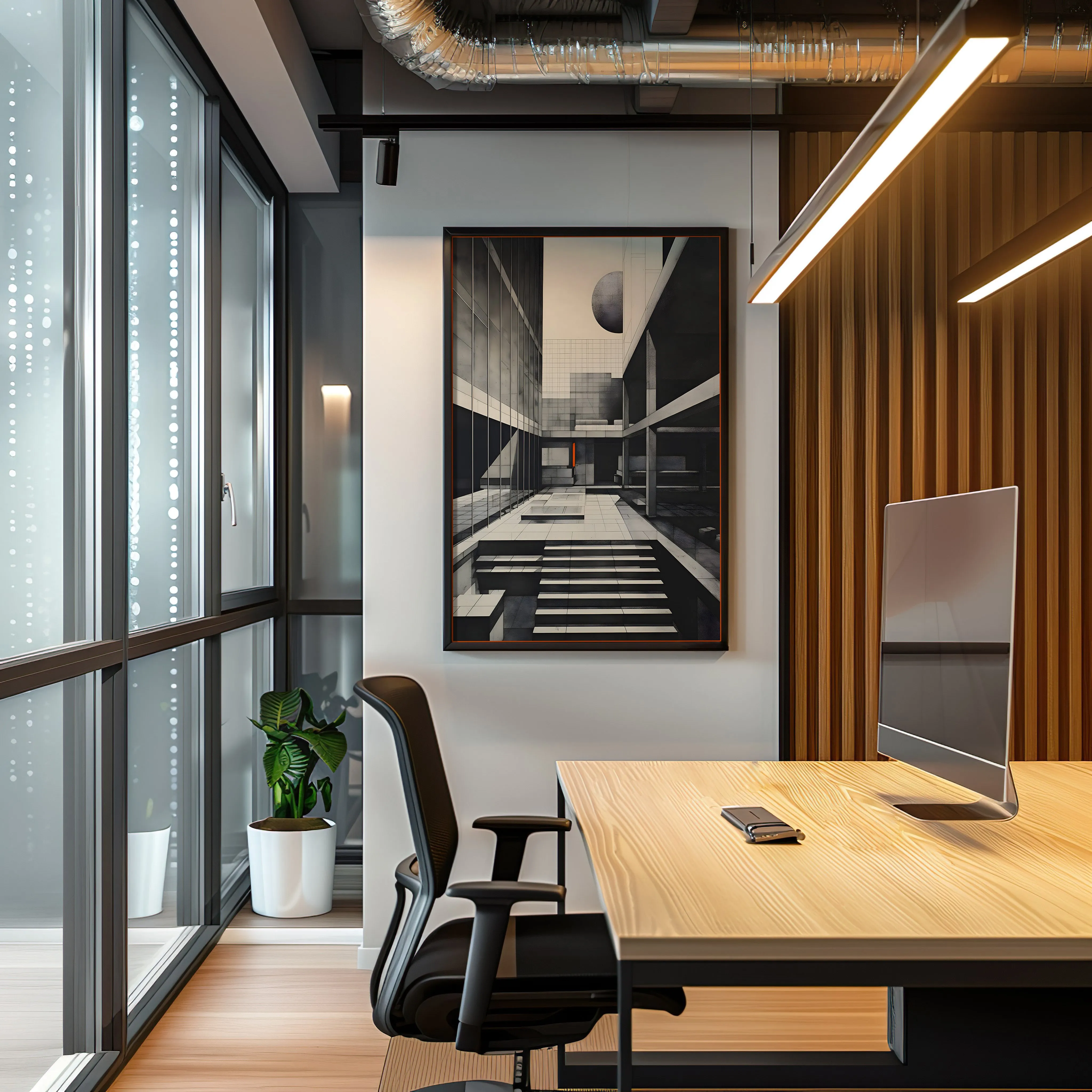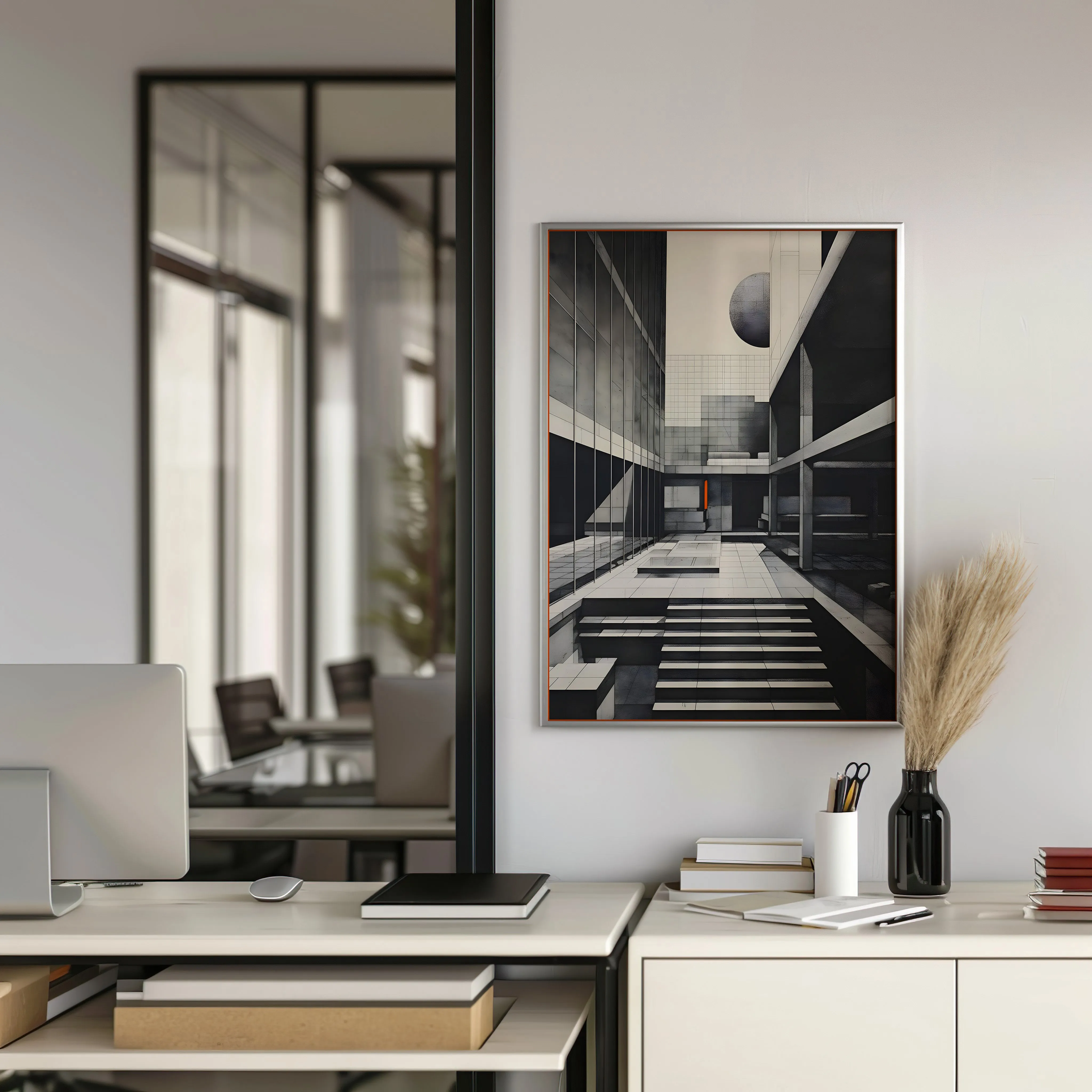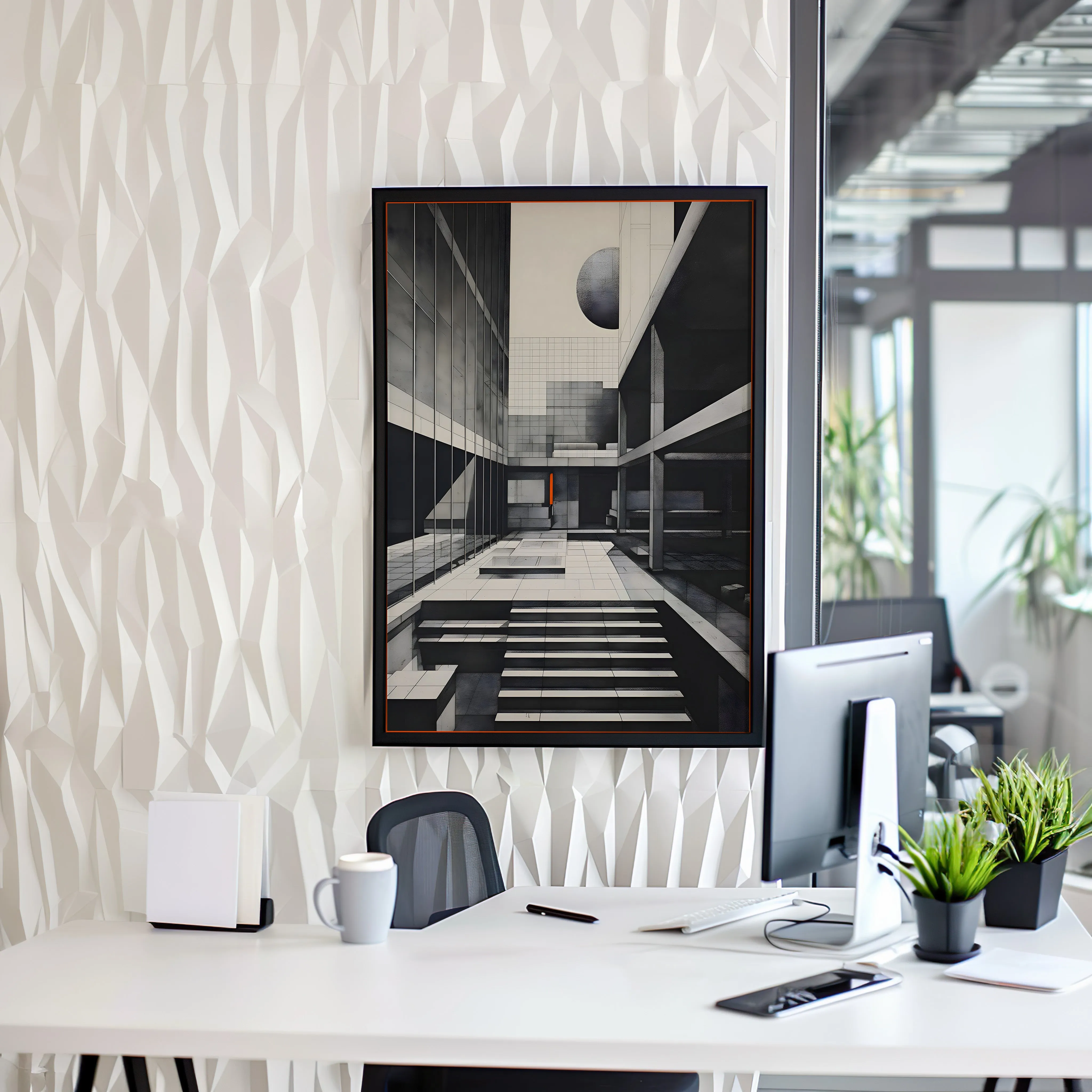 This artwork features a sophisticated palette of soft beige, cool gray, deep black, and subtle orange accents, creating a refined and contemporary atmosphere. The subject presents a modern architectural courtyard with clean concrete structures, reflective glass walls, and layered staircases connecting open spaces, emphasizing symmetry, depth, and spatial balance. The piece is created using digital illustration with precise geometric lines, smooth gradients, and minimalist architectural composition, reflecting a modern conceptual design style. Because of its elegant and structured aesthetic, this artwork is especially appealing for architecture enthusiasts and modern design lovers, and fits beautifully in spaces such as a living room, office, studio, hallway, or modern workspace.
