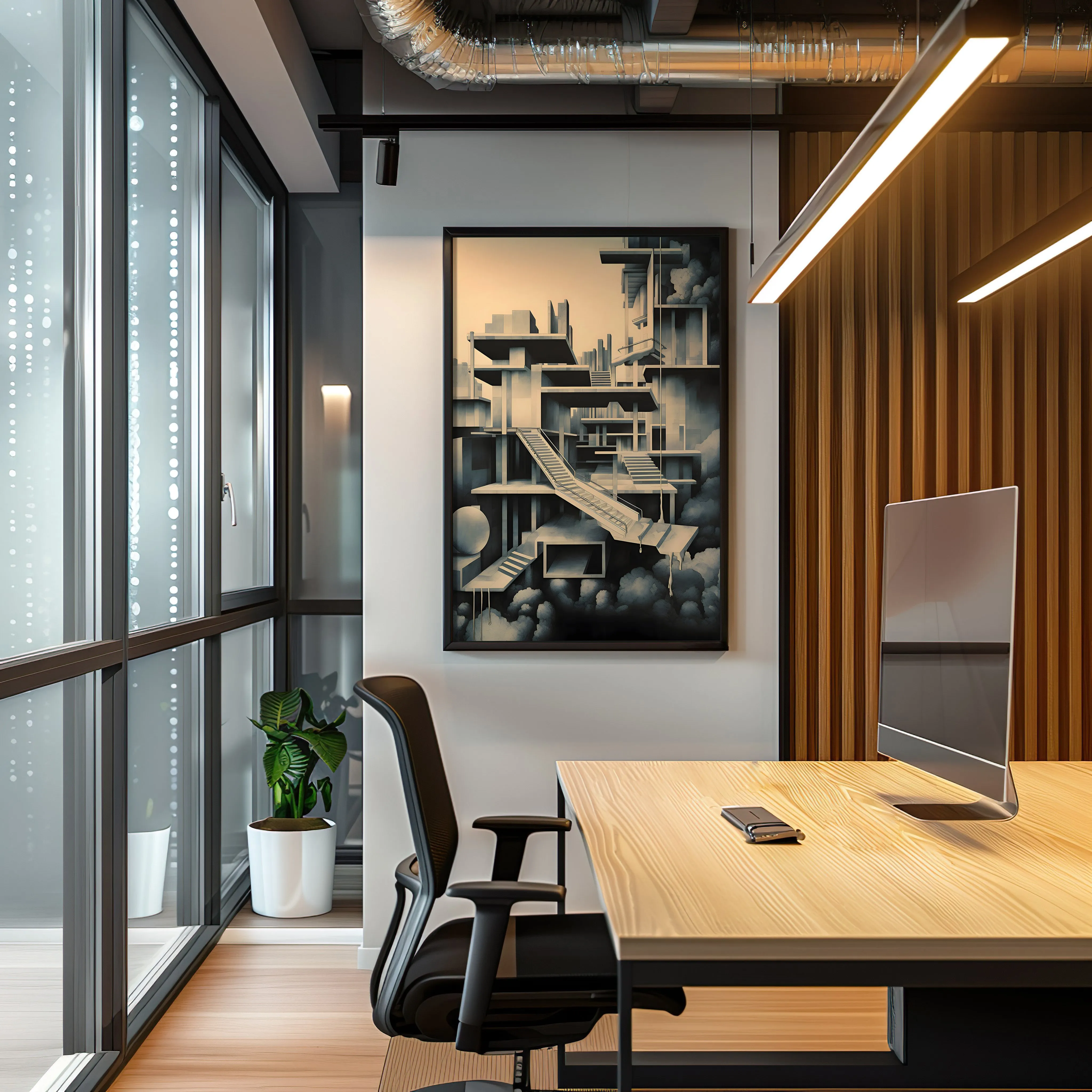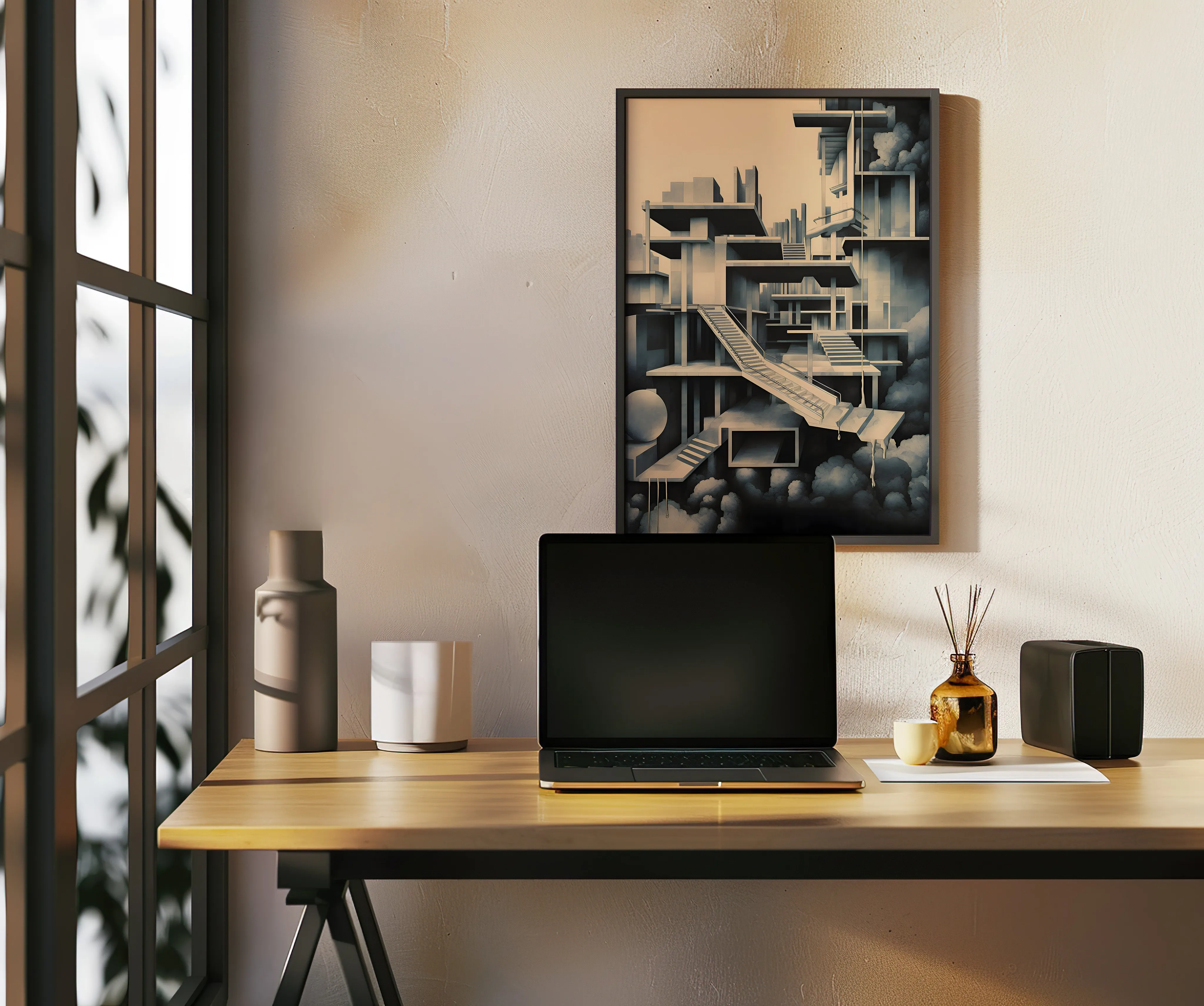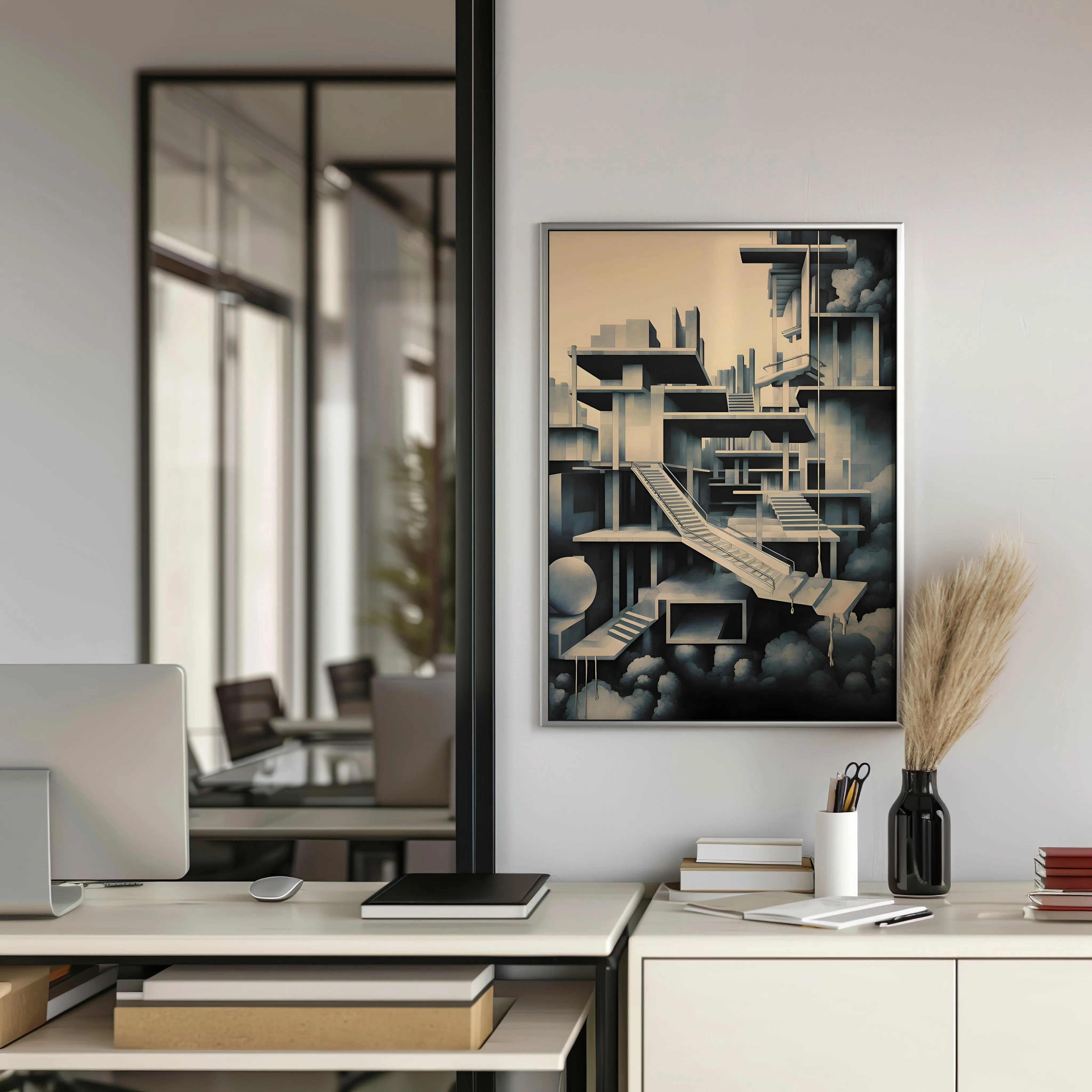 This artwork features a refined palette of soft beige, cool gray, and deep charcoal, creating a calm yet mysterious atmosphere. The subject depicts a complex architectural structure of platforms, staircases, and suspended spaces floating among clouds, forming a surreal and almost impossible labyrinth of modern design. The piece is created using digital illustration with clean geometric forms, subtle shading, and layered architectural composition, giving it a minimalist yet conceptual architectural style. Because of its abstract design and structural complexity, it is especially appealing for architecture enthusiasts, designers, and art lovers, and fits beautifully in spaces such as an office, studio, living room, hallway, or modern workspace.