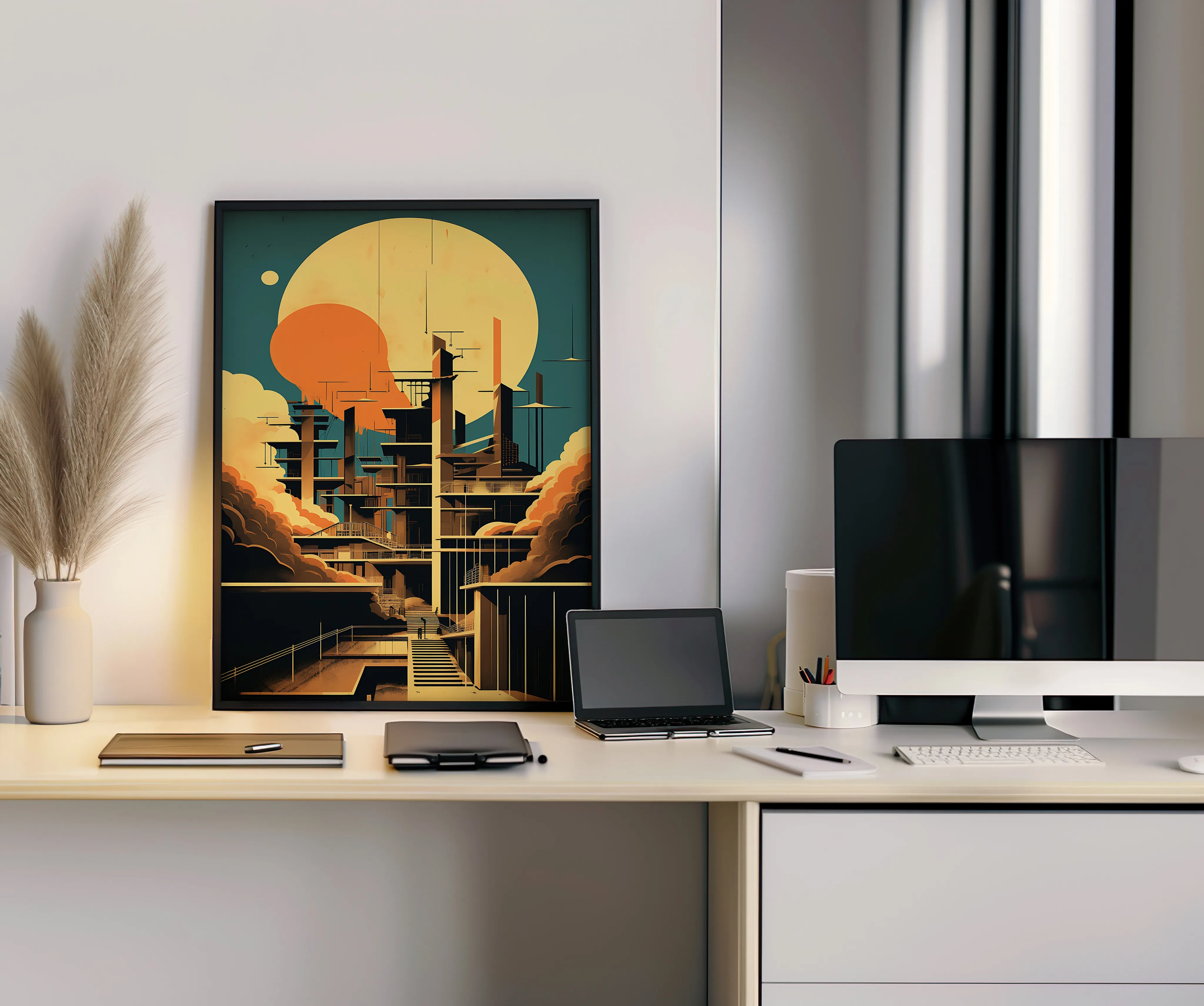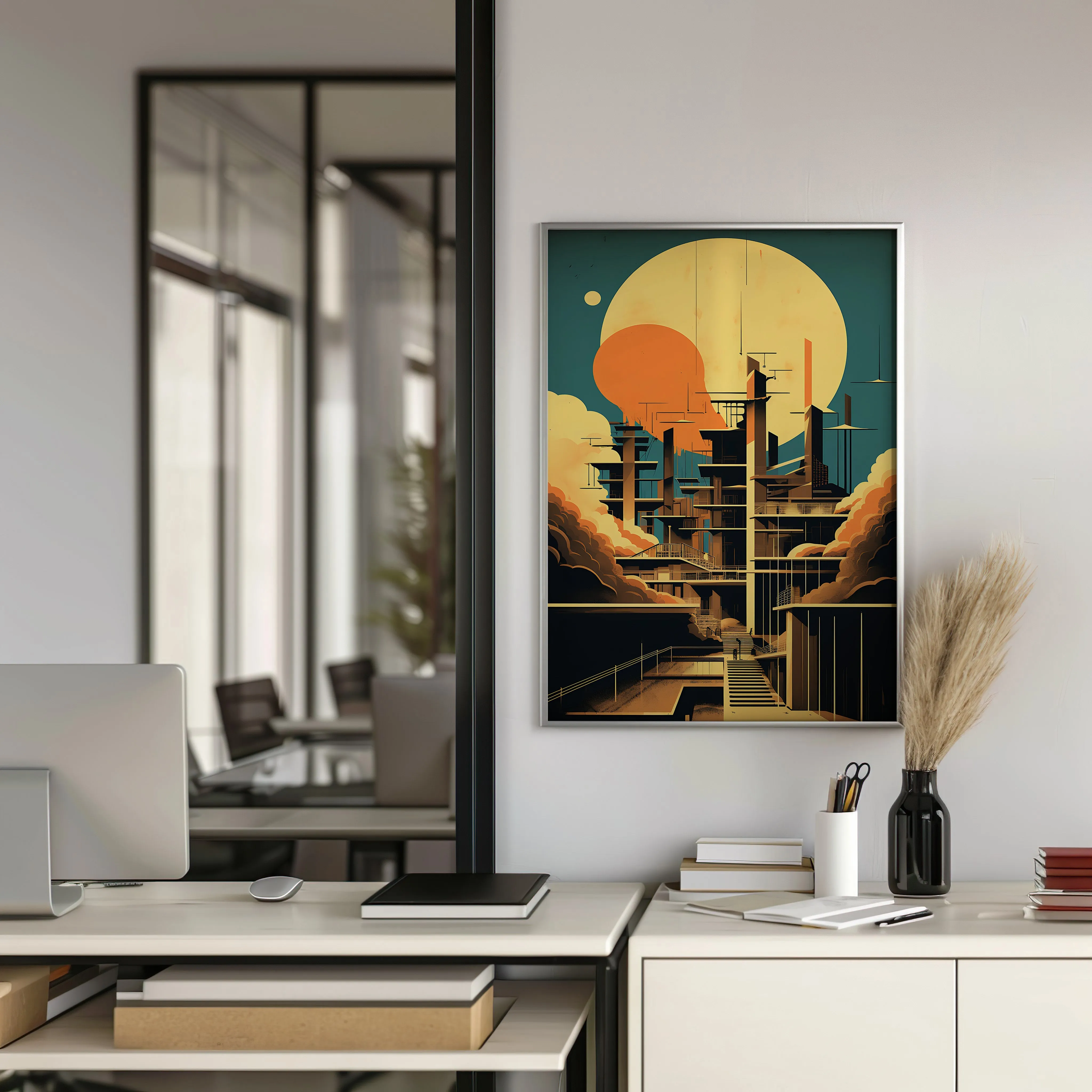 This artwork features a dramatic palette of deep teal, warm orange, golden yellow, and dark brown, creating a powerful and futuristic atmosphere. The subject presents a visionary architectural cityscape made of layered platforms, towers, bridges, and stairways, set against a massive glowing sun rising behind the structures. The piece is created using digital illustration with strong geometric forms, clean lines, and layered architectural composition, giving it a modern sci-fi and architectural concept style. Because of its bold design and futuristic theme, this artwork is especially appealing for architecture enthusiasts, design lovers, and sci-fi fans, and works beautifully in spaces such as a living room, office, studio, hallway, or modern workspace.