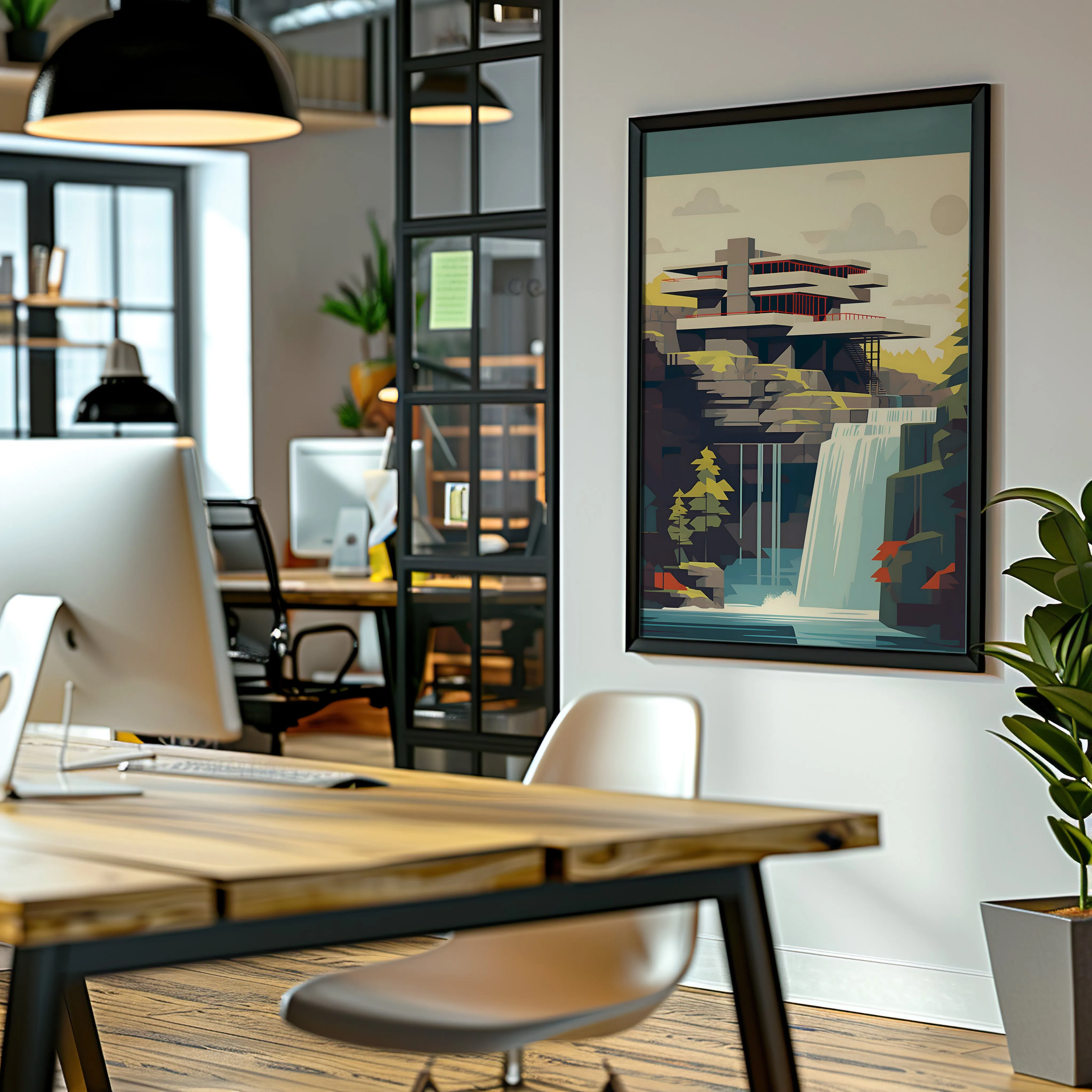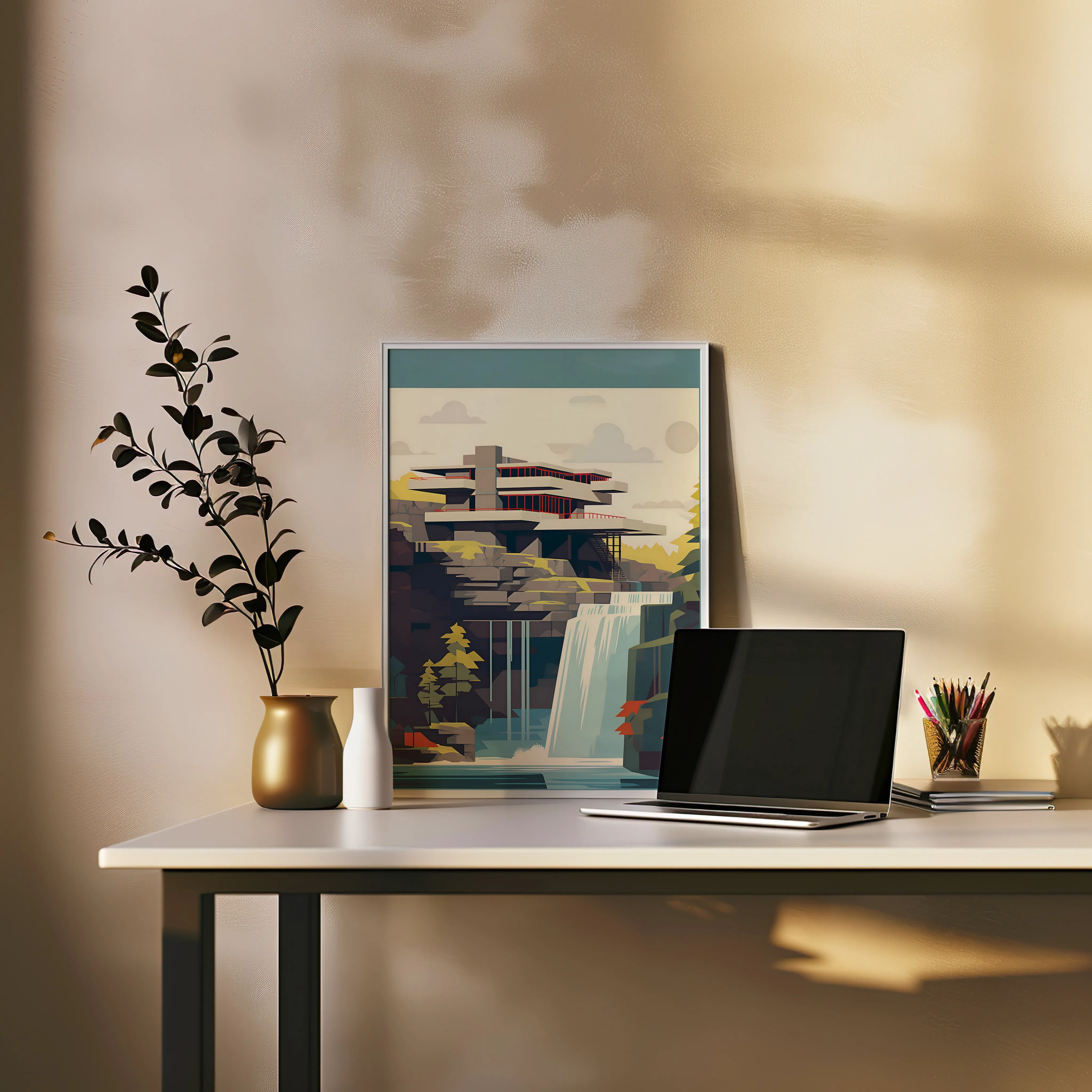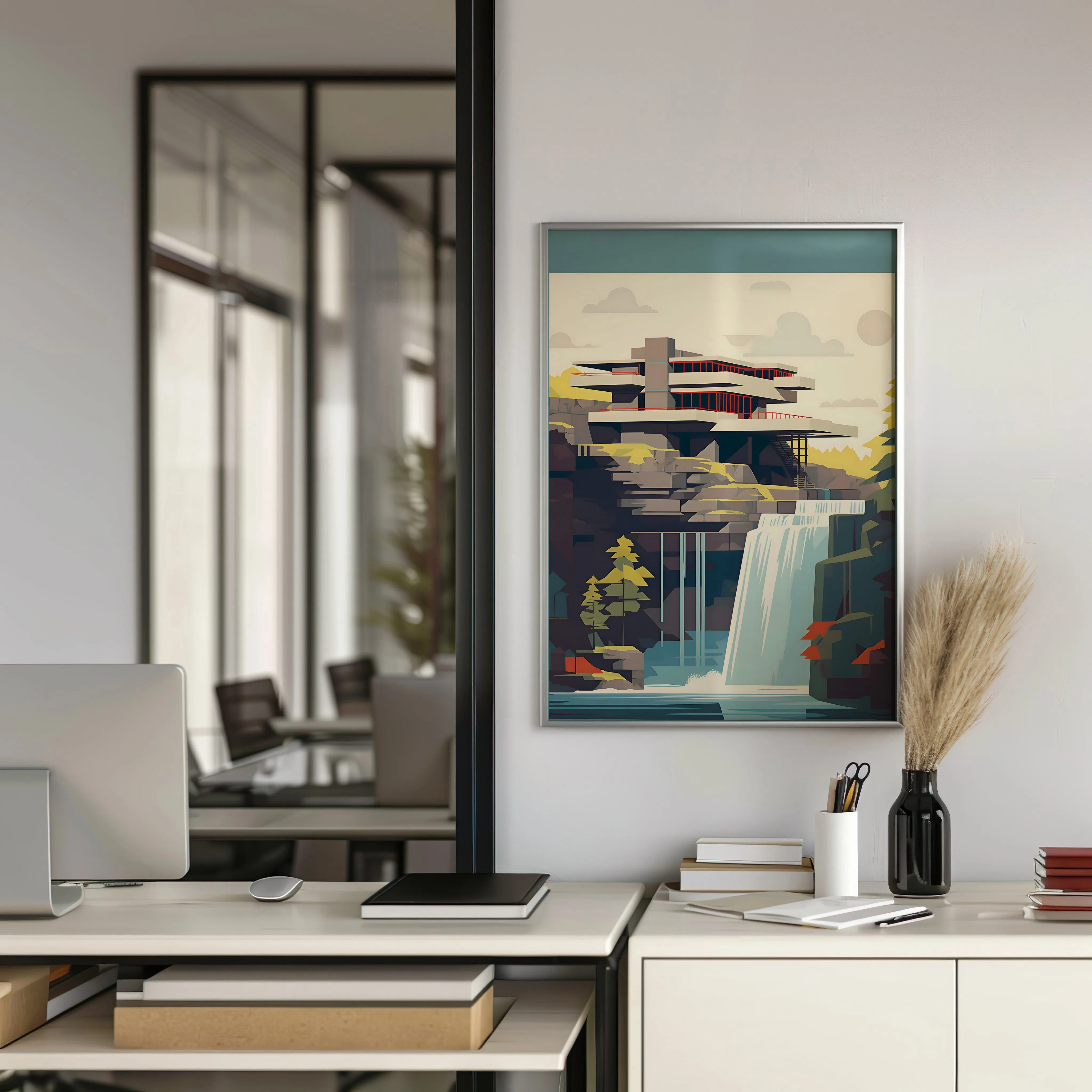 This artwork portrays a striking modern residence built directly above a flowing waterfall, inspired by the legendary Fallingwater designed by architect Frank Lloyd Wright. The composition captures dramatic cantilevered terraces extending over rugged rock formations, blending architecture with the surrounding forest and cascading water. Soft natural tones—muted greens, warm stone colors, and cool blues—create a calm yet powerful landscape atmosphere. The illustration uses clean geometric forms, layered shapes, and balanced color blocks to emphasize modernist architectural design and harmony with nature. This piece works beautifully in spaces such as a living room, office, studio, hallway, or architecture-inspired interior, especially for admirers of modern architecture and iconic design.