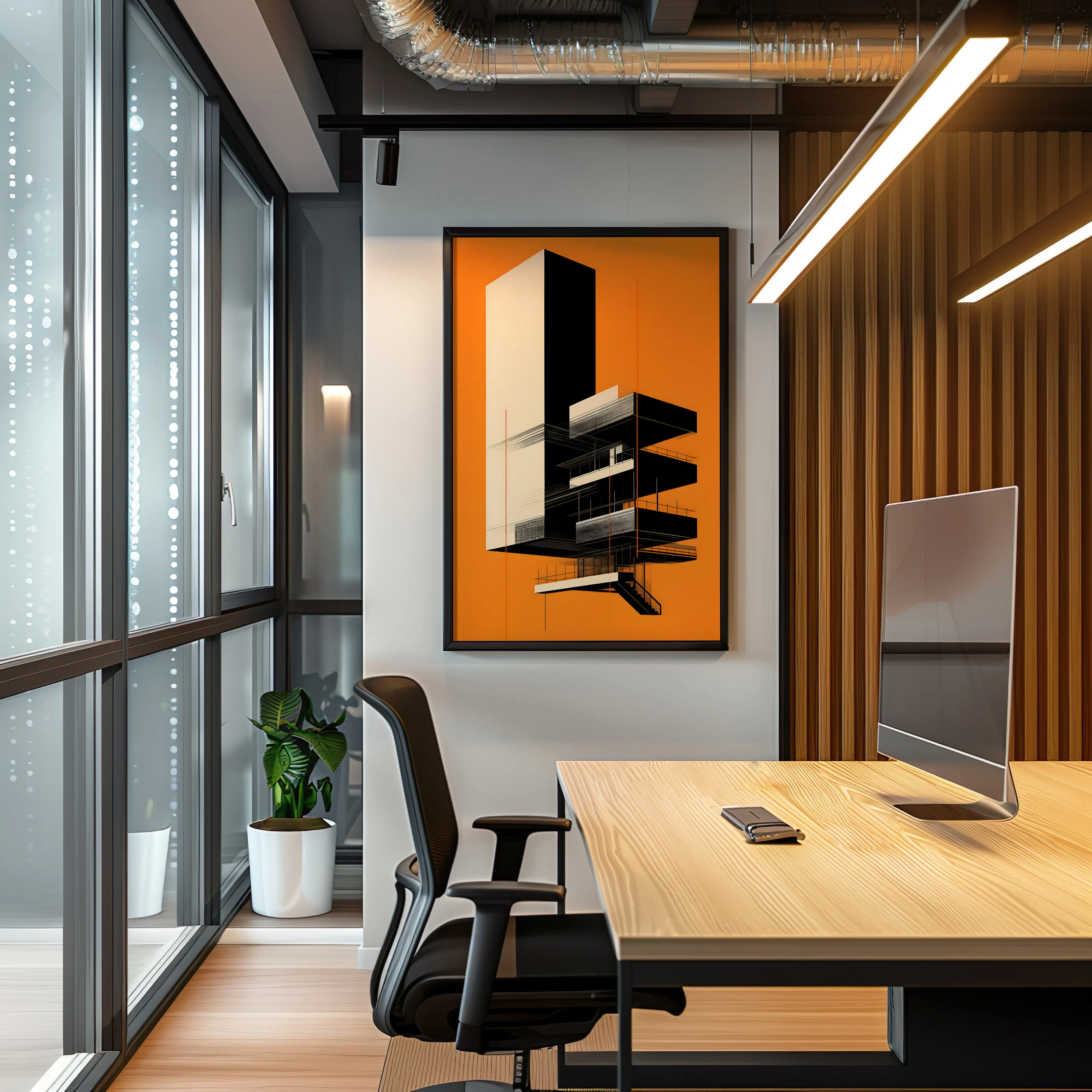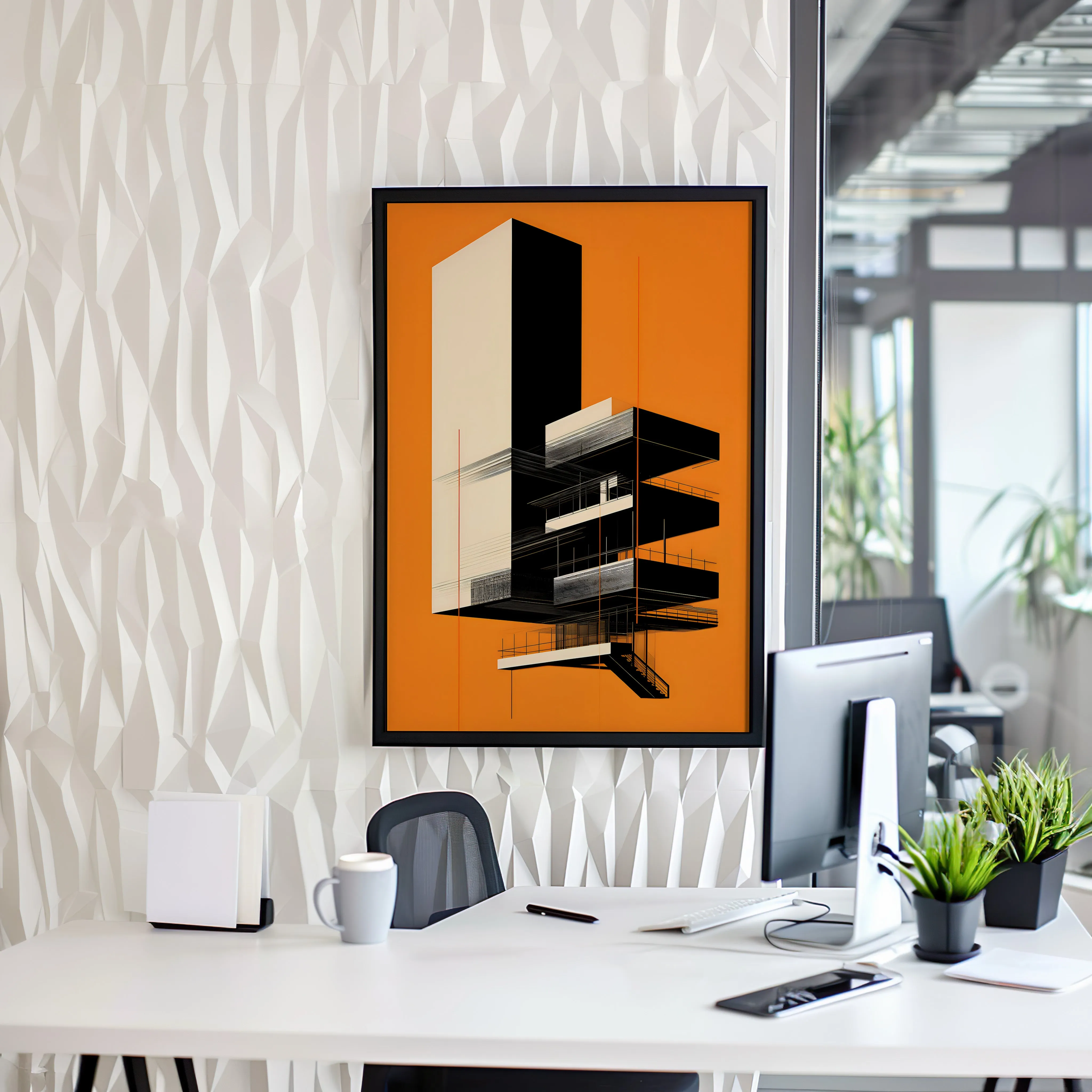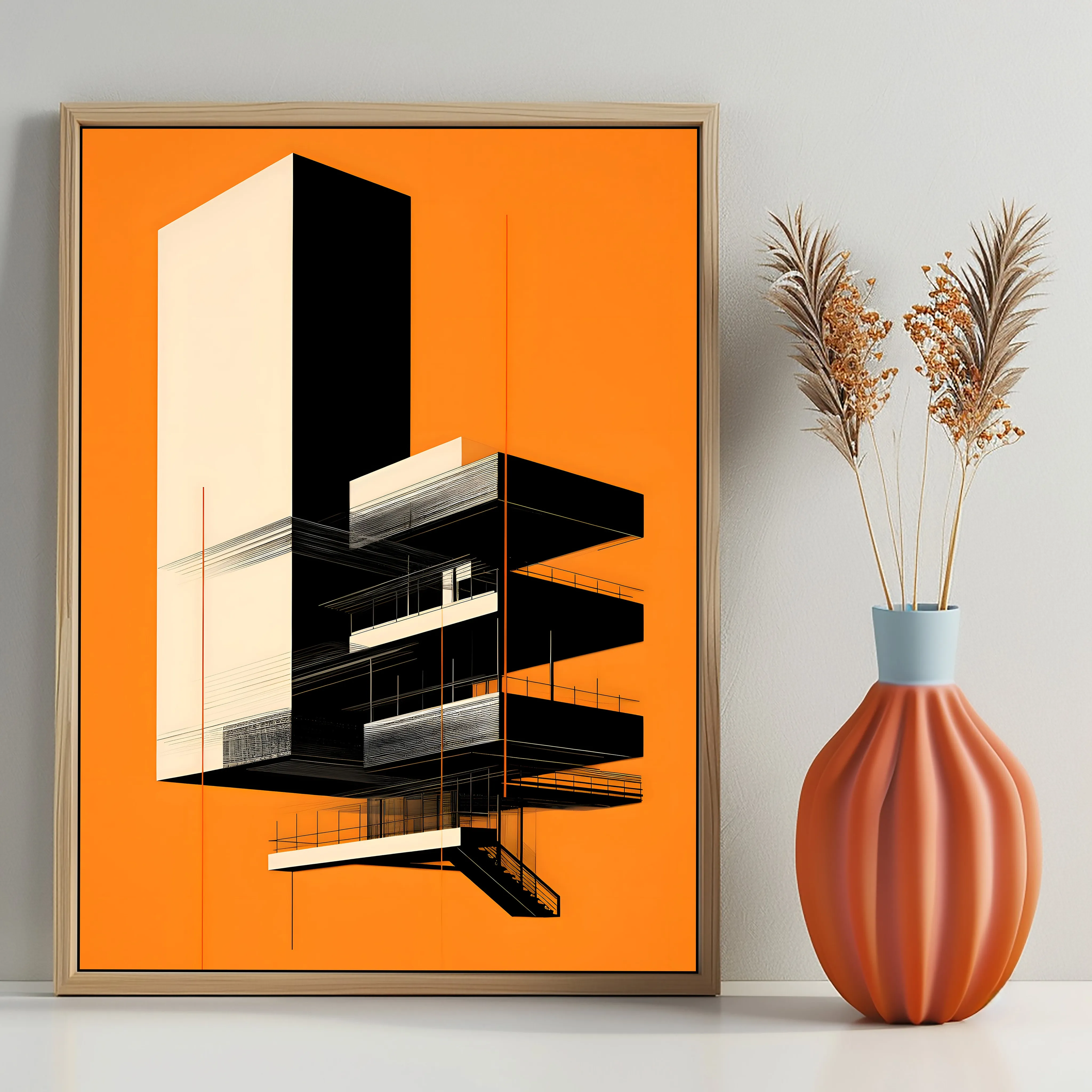 This artwork features a striking palette of bright orange, deep black, and soft beige, creating a bold and high-contrast modern aesthetic. The subject depicts a floating architectural structure composed of stacked platforms, balconies, and a tall vertical tower, emphasizing balance, structural layers, and futuristic design. The piece is created using digital illustration with sharp geometric lines, layered architectural forms, and minimalist shading, reflecting a contemporary and conceptual architectural style. Because of its dramatic composition and modern design, this artwork is especially appealing for architecture enthusiasts and design lovers, and fits perfectly in spaces such as a living room, office, studio, hallway, or modern workspace.