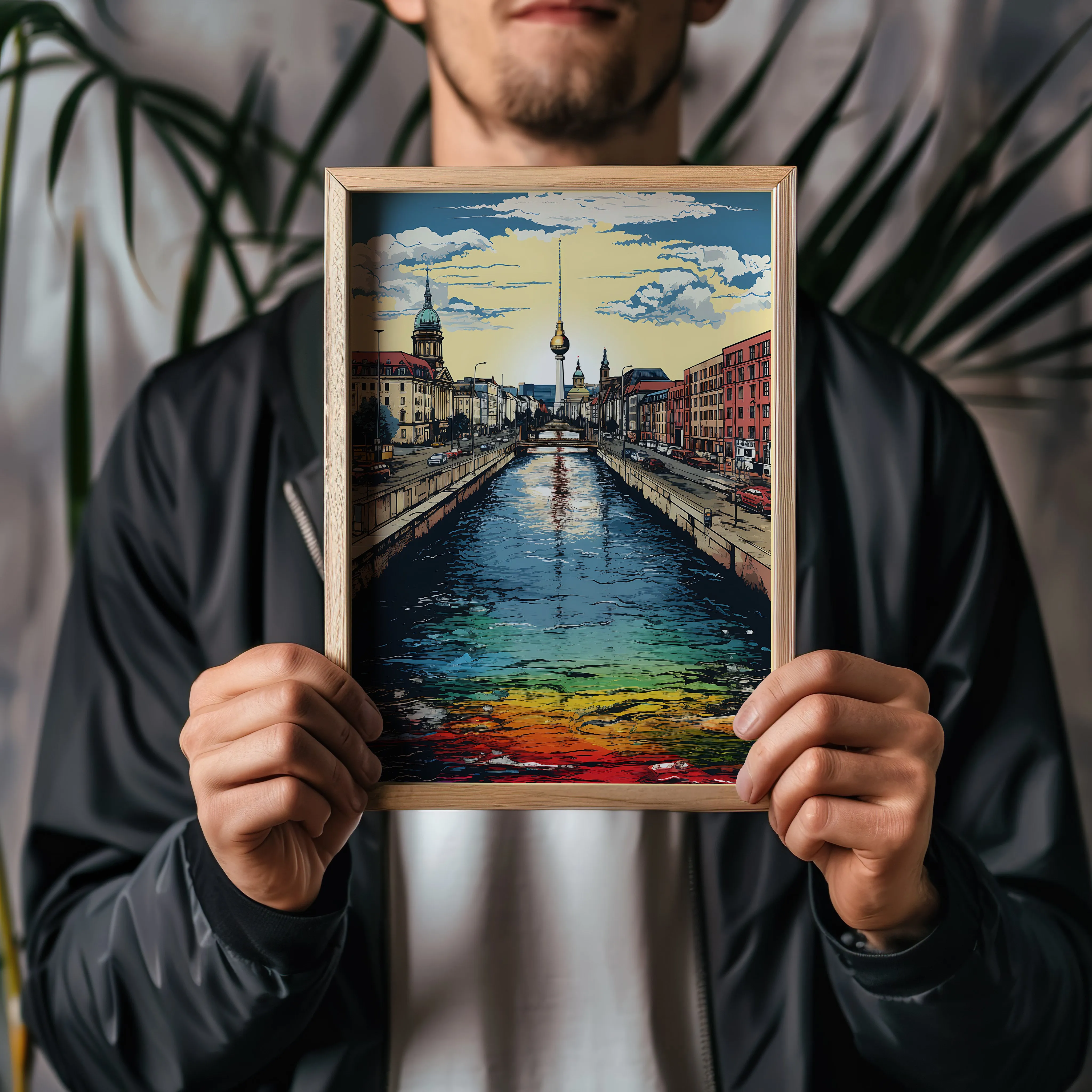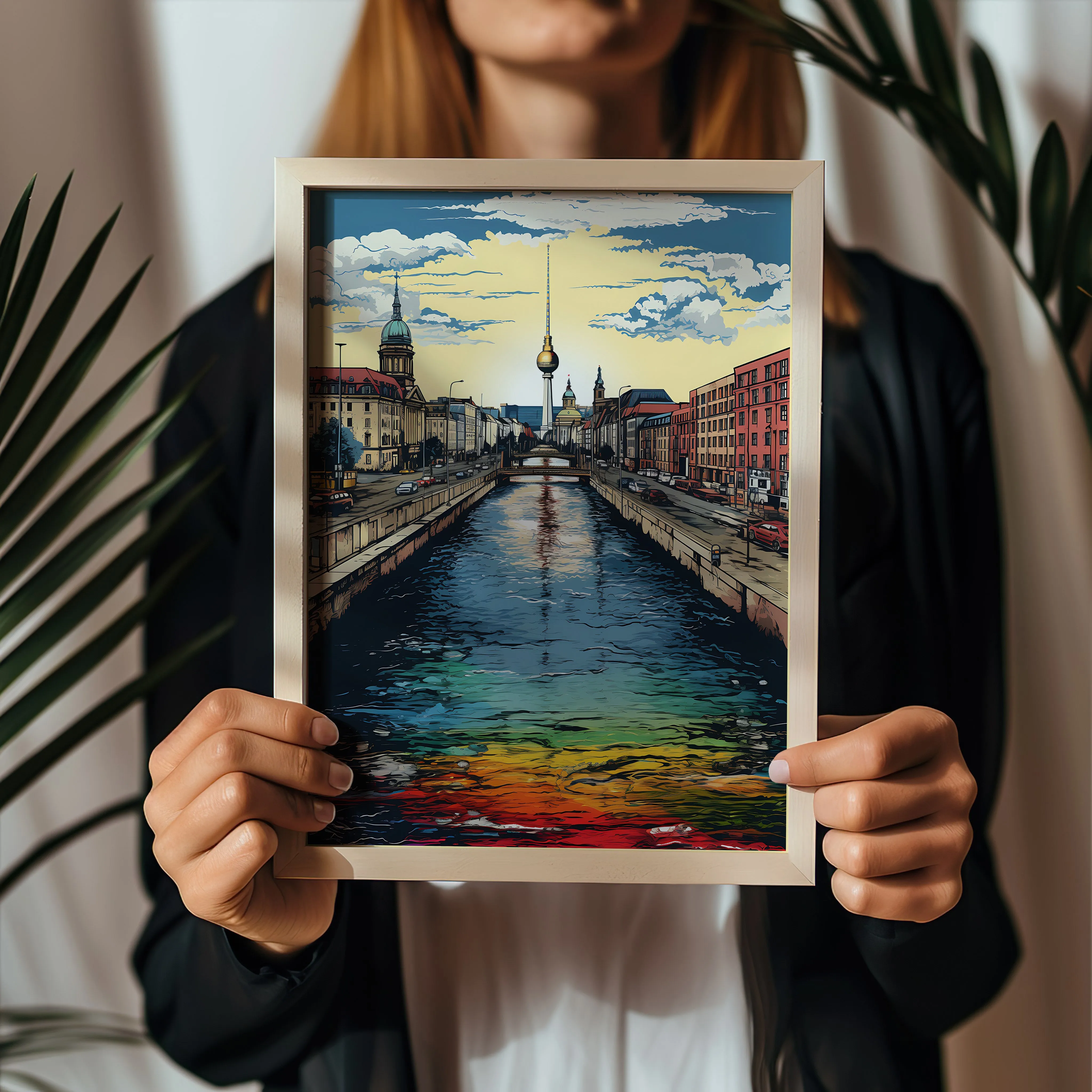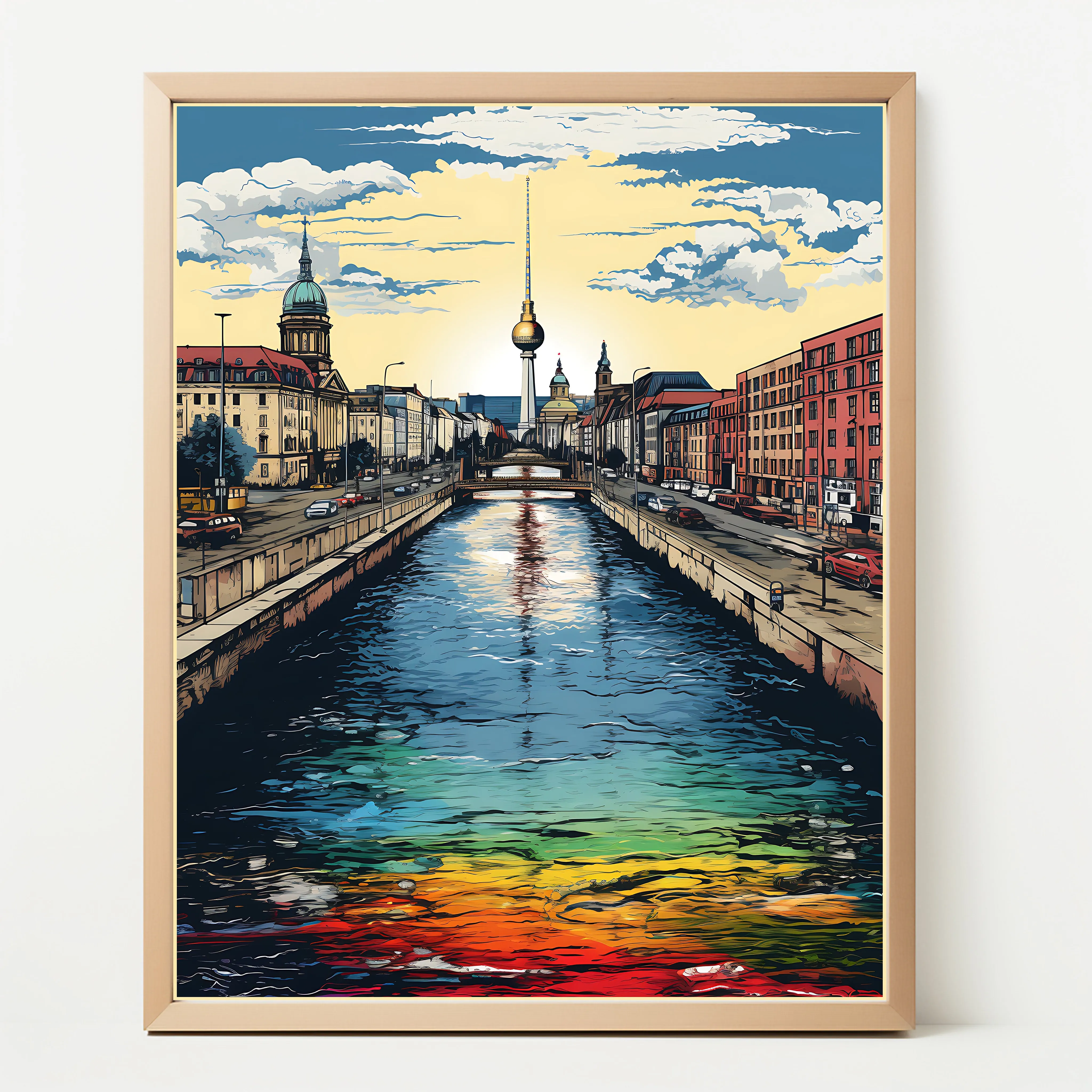 This artwork captures a vibrant Berlin cityscape along the Spree River, with the iconic Berlin TV Tower (Fernsehturm) rising above the skyline in the distance. Historic buildings and modern city streets line both sides of the canal, creating a balanced urban perspective that leads the viewer’s eye toward the heart of the city. The water reflects the sky and surrounding architecture in a striking blend of deep blues, golds, and vivid rainbow-like colors, adding movement and energy to the composition. Dramatic clouds and warm sunlight illuminate the skyline, giving the scene a dynamic atmosphere that celebrates Berlin’s unique blend of history, culture, and contemporary life. The illustration combines detailed architectural linework with bold, expressive color reflections, making it a captivating piece for living rooms, offices, studios, or modern interiors, especially for those who love Berlin, European cityscapes, and vibrant urban art.