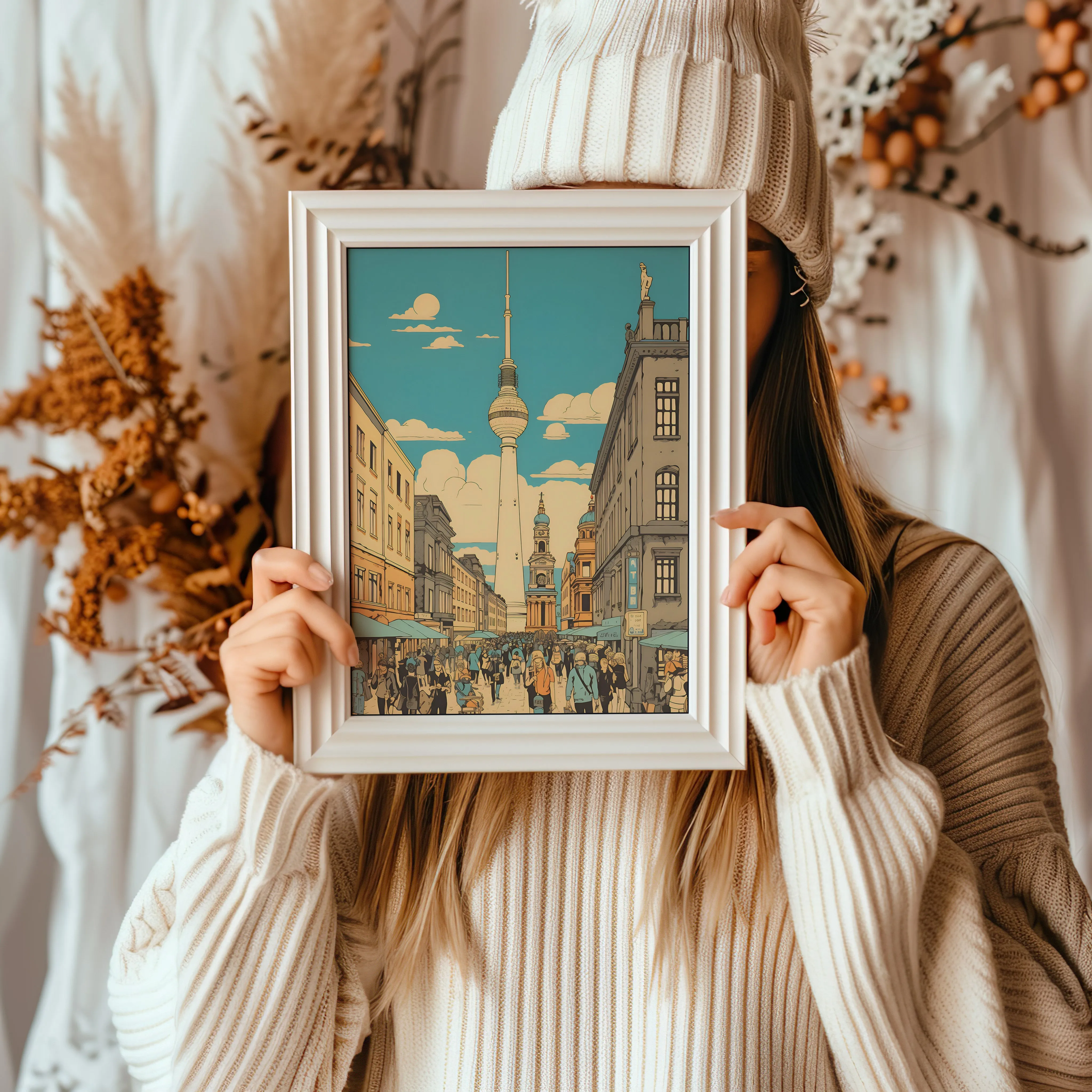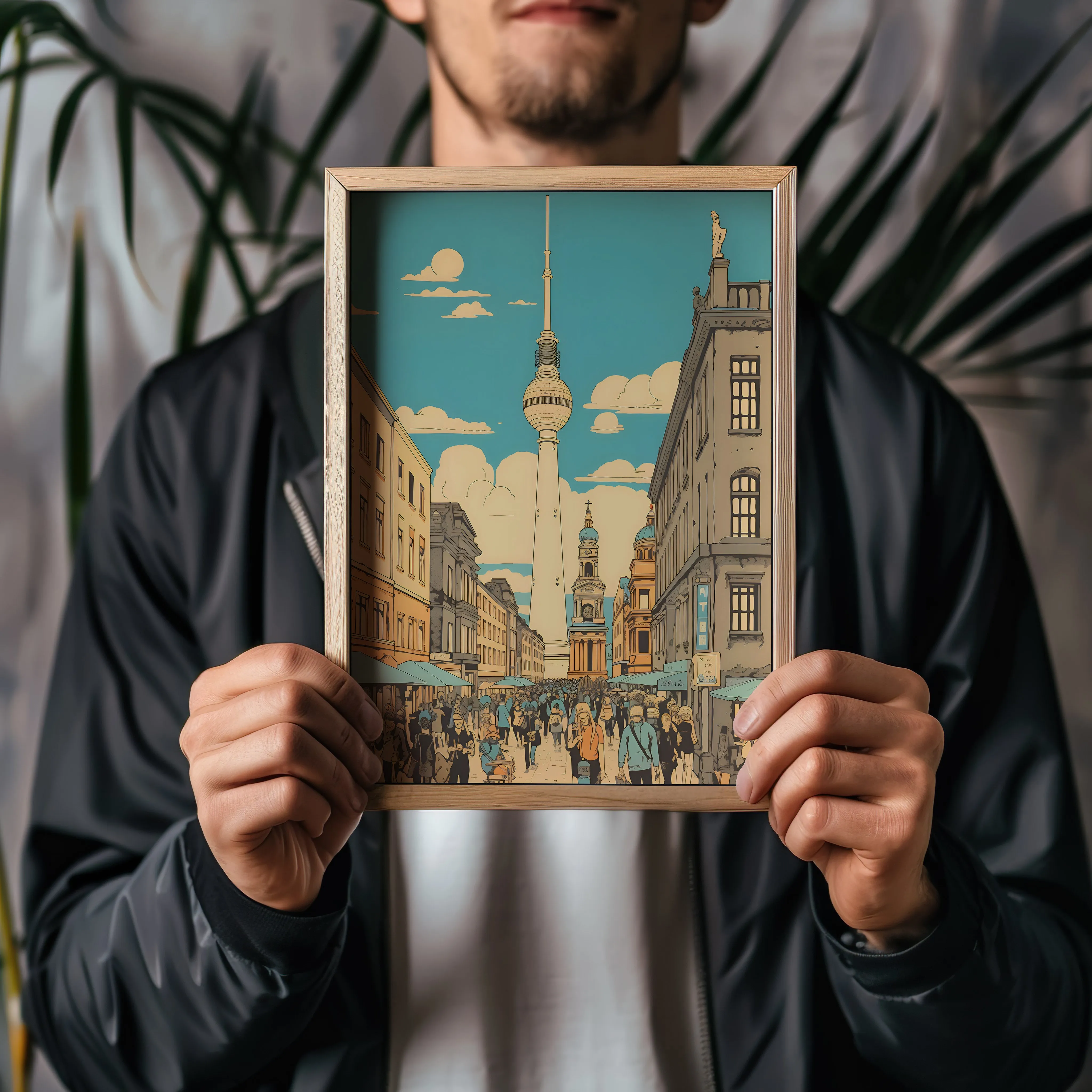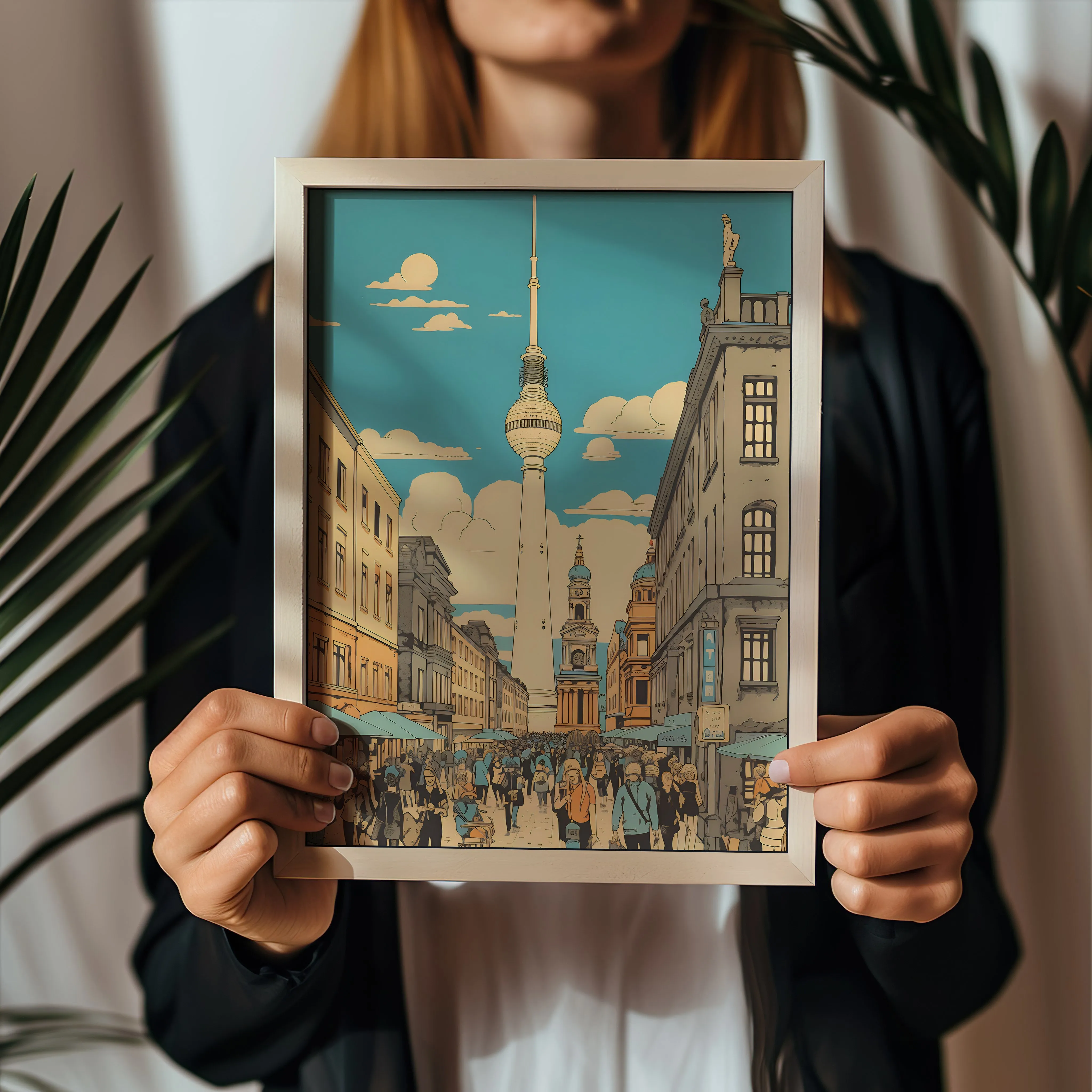 This artwork portrays a lively street scene titled “Busy Berlin,” showing crowds of people walking through a historic avenue with the iconic Fernsehturm rising in the background. The illustration uses warm beige, golden yellow, soft blue, and muted terracotta tones, creating a relaxed yet vibrant urban atmosphere. The subject highlights daily city life, architecture, and pedestrians, illustrated with clean linework and a retro-inspired digital illustration style that emphasizes perspective and architectural detail. With its energetic city character, this artwork works beautifully in a living room, office, hallway, studio, or modern apartment, bringing a dynamic Berlin city vibe to the space.