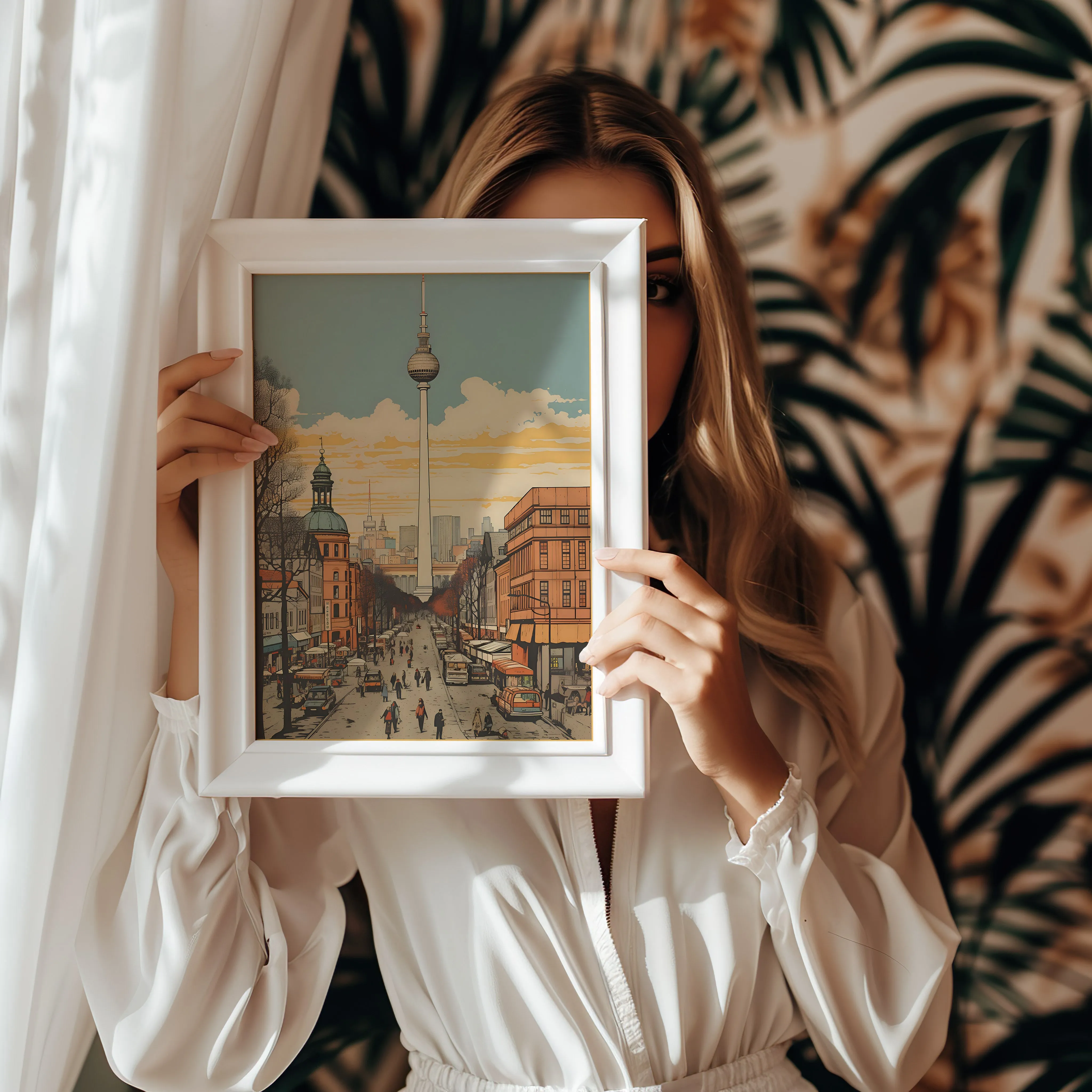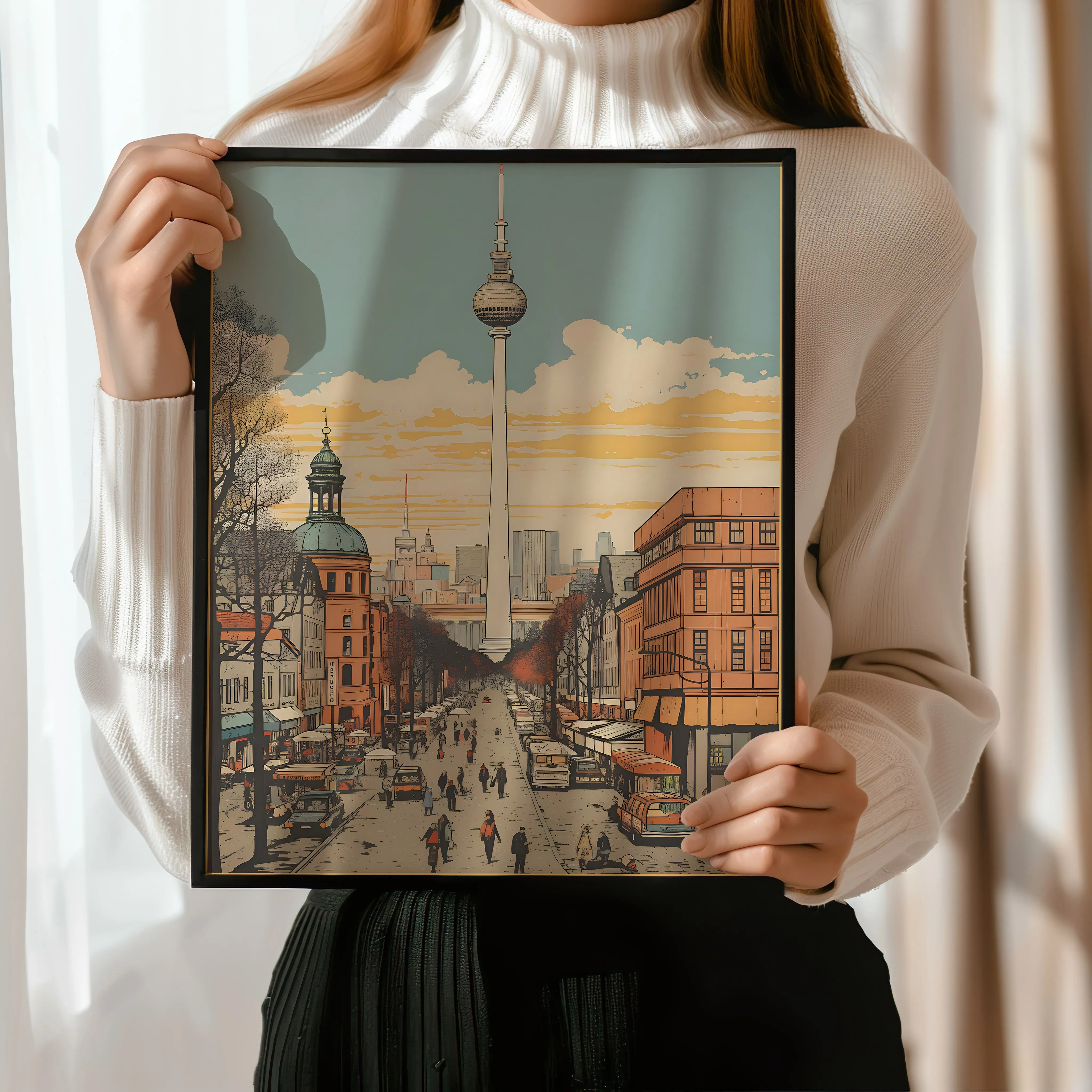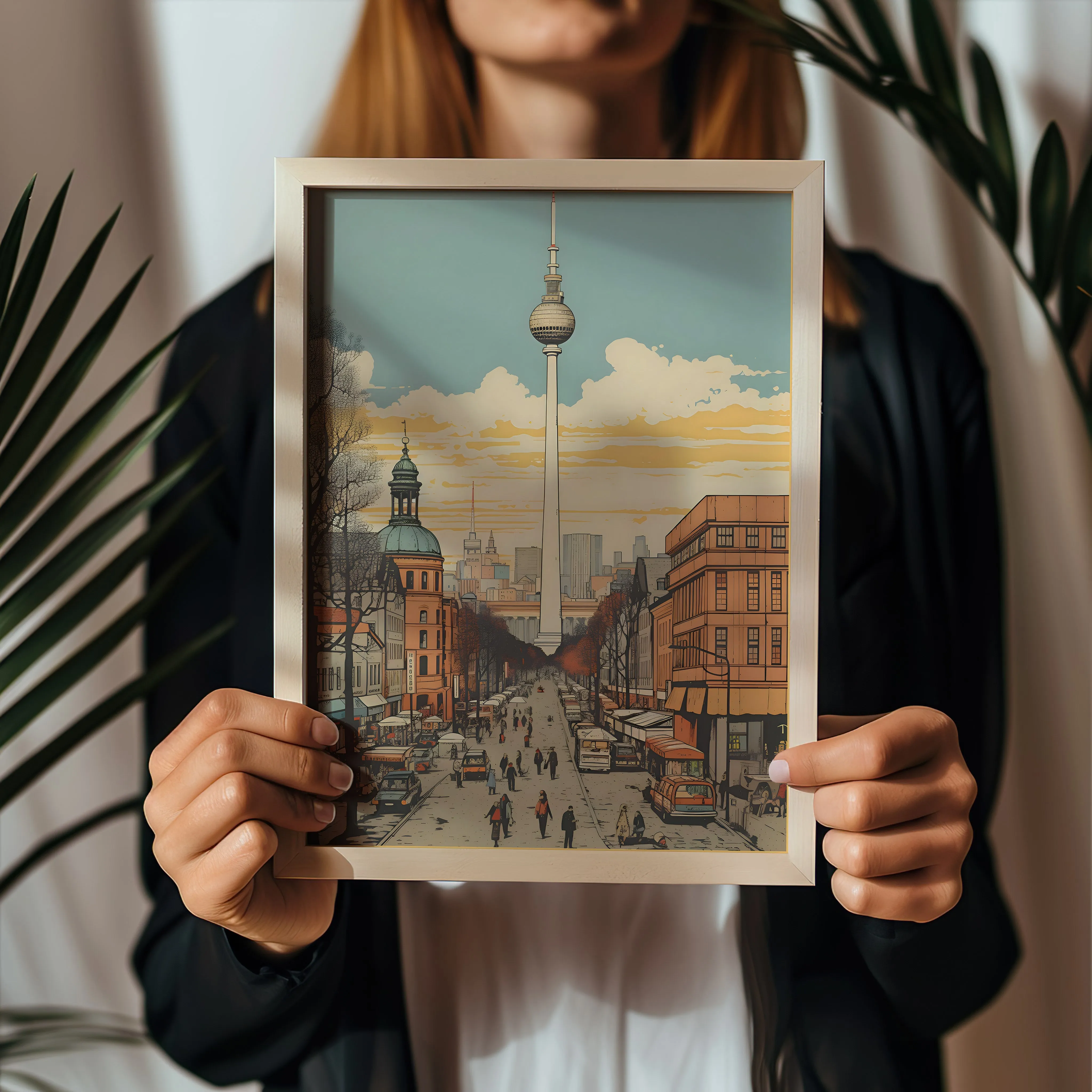 This artwork portrays a lively Berlin street scene leading toward the iconic Berlin TV Tower (Fernsehturm), which rises prominently above the city skyline. The composition uses a strong central perspective, drawing the viewer’s eye down a bustling avenue filled with pedestrians, cafés, and classic European architecture. Warm tones of terracotta, soft beige, and golden sunset hues blend with cool sky blues to create a nostalgic and welcoming atmosphere. Leafless trees line the boulevard, framing the street and adding depth to the composition while the distant skyline hints at Berlin’s blend of historic and modern architecture. The illustration combines clean architectural linework with a vintage-inspired poster style, giving the piece both character and timeless appeal. Perfect for living rooms, offices, studios, or travel-inspired interiors, this artwork celebrates the everyday charm and iconic skyline of Berlin.