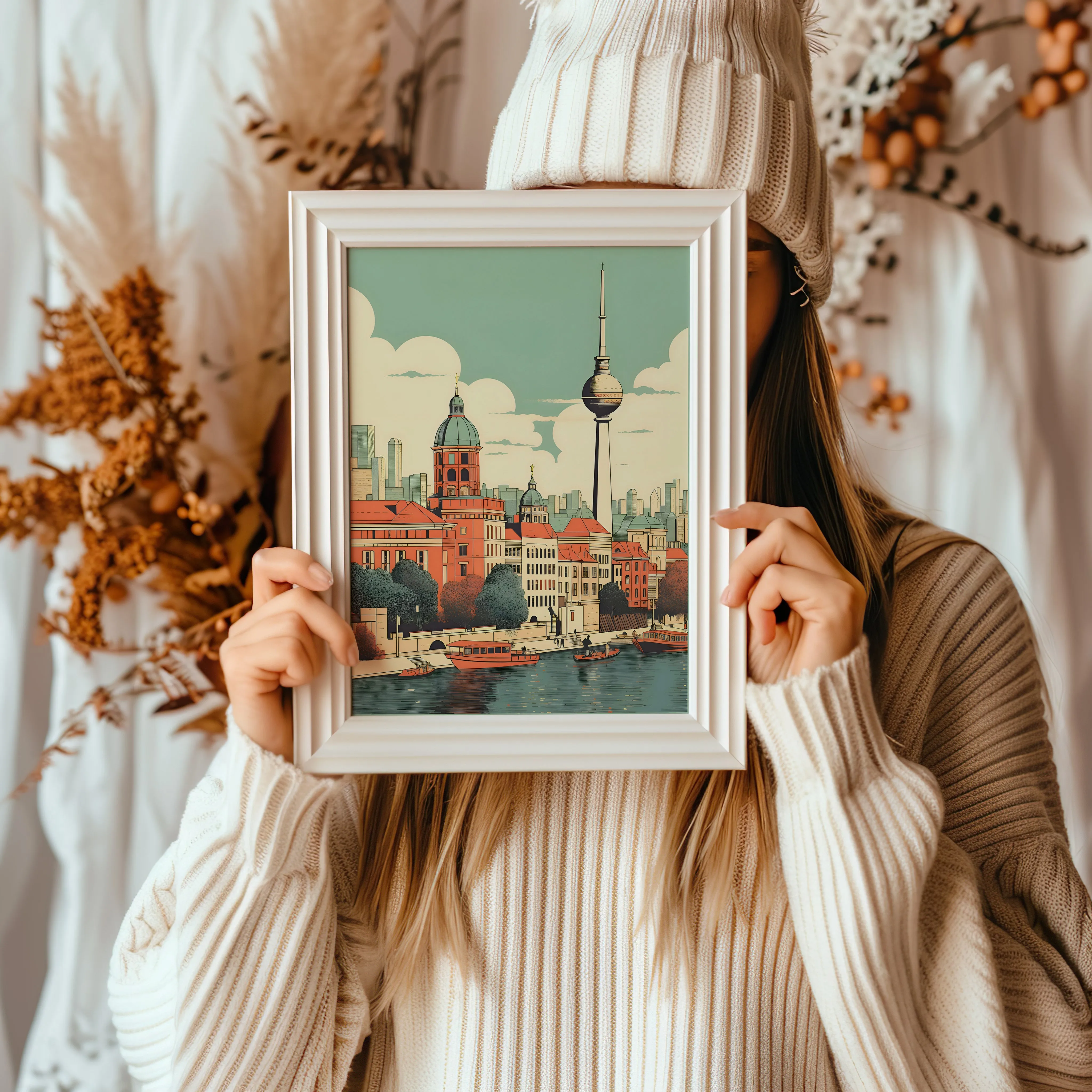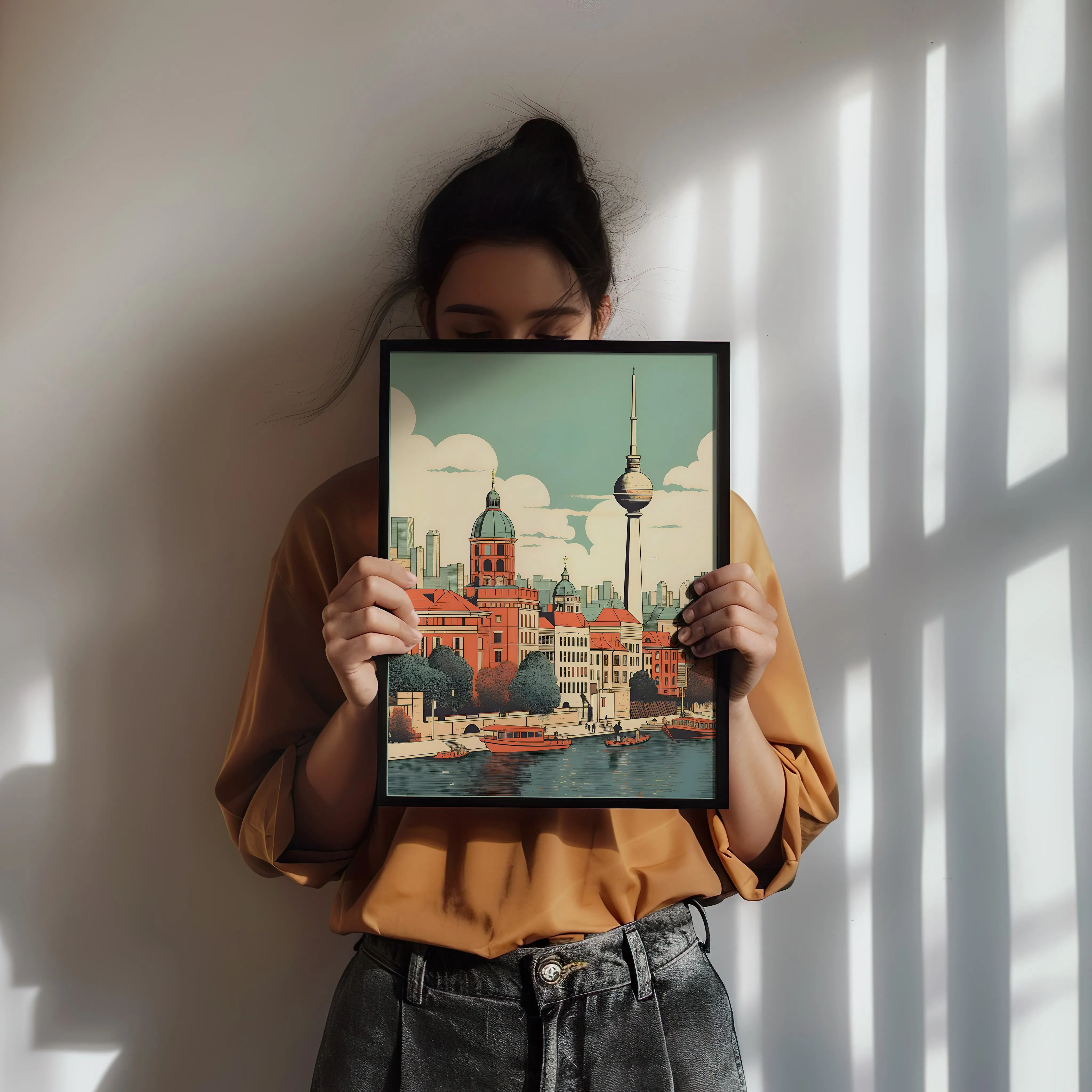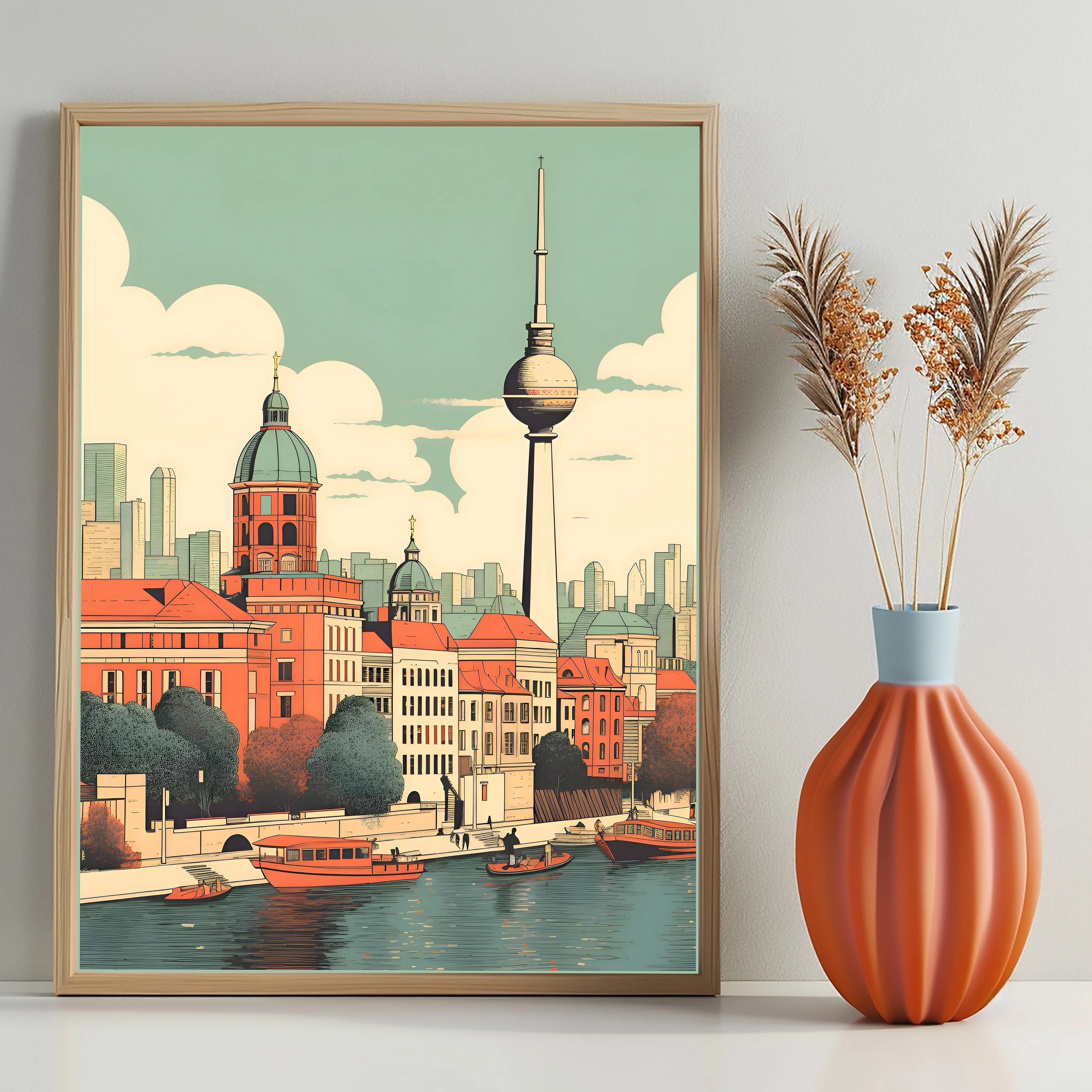 This artwork captures a charming view of Berlin along the Spree River, where historic architecture meets the modern skyline. Elegant buildings with warm terracotta roofs and classical domes line the riverbank, while the iconic Berlin TV Tower (Fernsehturm) rises prominently in the background, anchoring the city’s skyline. Boats glide across the calm water, adding movement and everyday life to the peaceful urban scene. The illustration uses a soft palette of muted greens, warm reds, cream tones, and gentle blues, giving the composition a relaxed and nostalgic atmosphere reminiscent of vintage travel posters. Carefully balanced architectural details and clean linework highlight the beauty of Berlin’s riverside districts. This artwork is ideal for living rooms, offices, studios, or travel-inspired interiors, especially for admirers of Berlin landmarks, European cityscapes, and classic illustrated posters