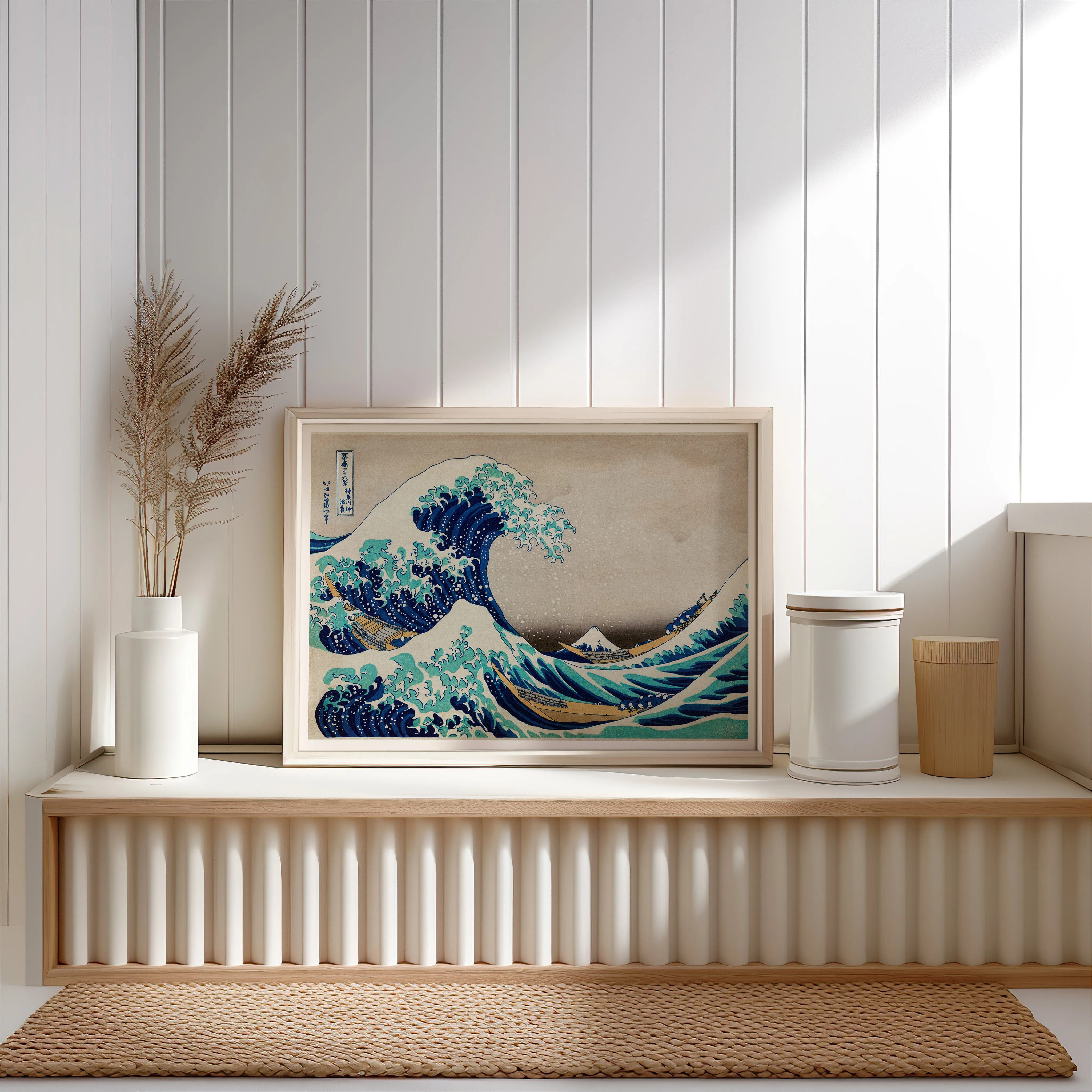 „Die große Welle vor Kanagawa“ (Kanagawa-oki nami ura), entstanden um 1831–1832 als Teil der Serie 36 Ansichten des Berges Fuji (Fugaku sanjūrokkei). Das Werk stellt eine gewaltige, schaumgekrönte Welle dar, die drohend über Fischerbooten zusammenbricht, während im Hintergrund der ruhige, schneebedeckte Fuji zu sehen ist.
