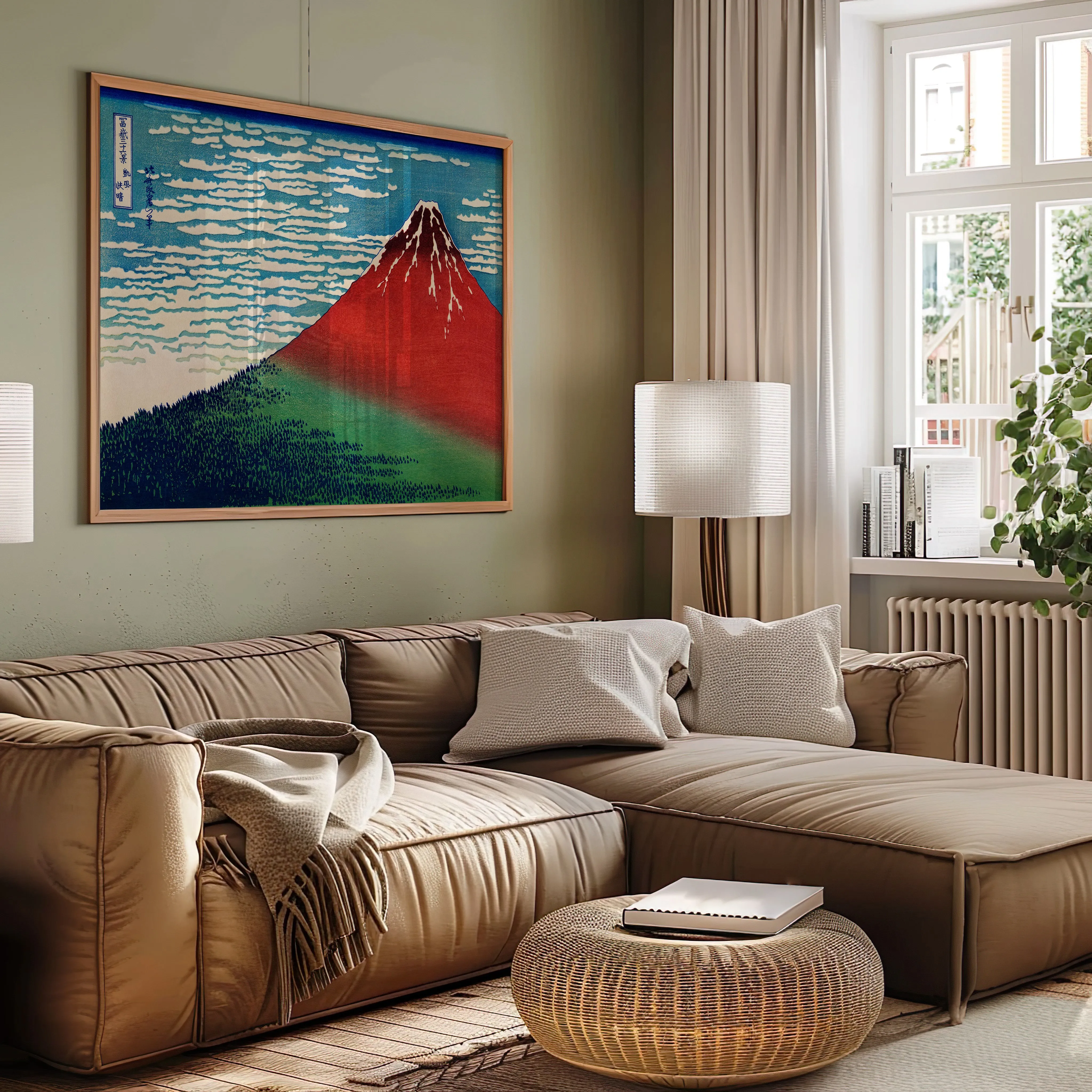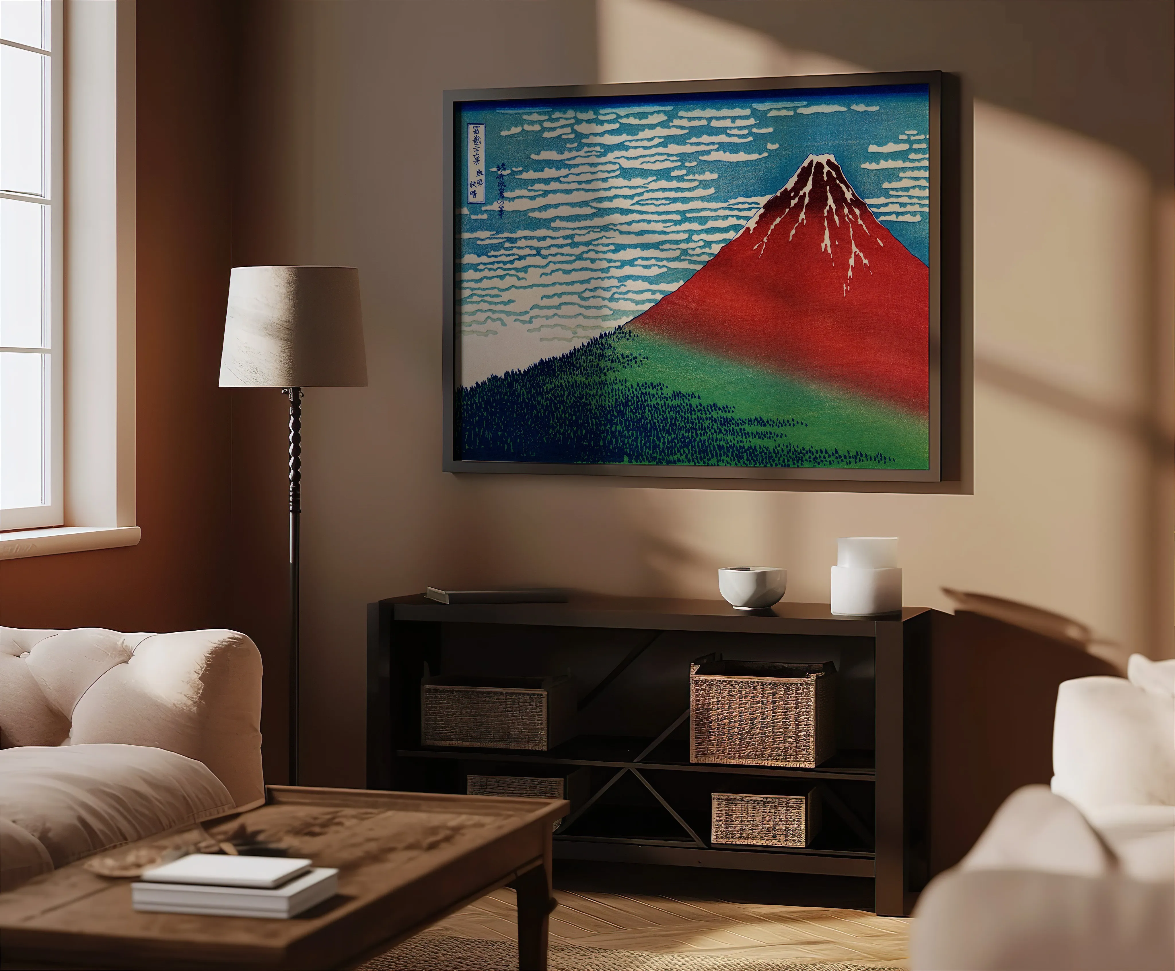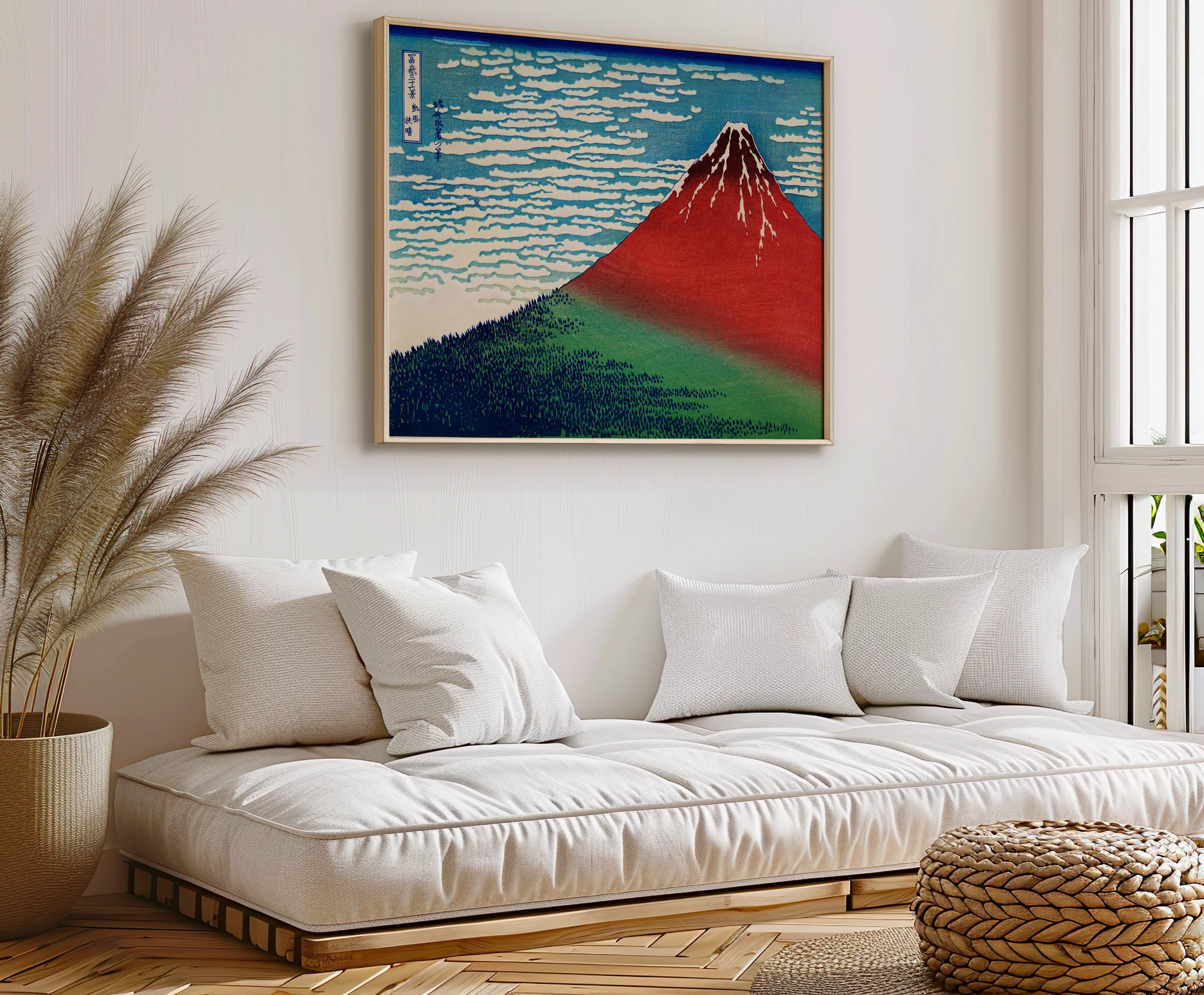 Der berühmtesten Farbholzschnitte von Katsushika Hokusai (1760–1849) aus der Serie 36 Ansichten des Berges Fuji (Fugaku sanjūrokkei, ca. 1831–1834). Die Darstellung trägt den Titel „Südwind, klarer Himmel“ (Gaifū kaisei), im Westen auch bekannt als „Roter Fuji“.