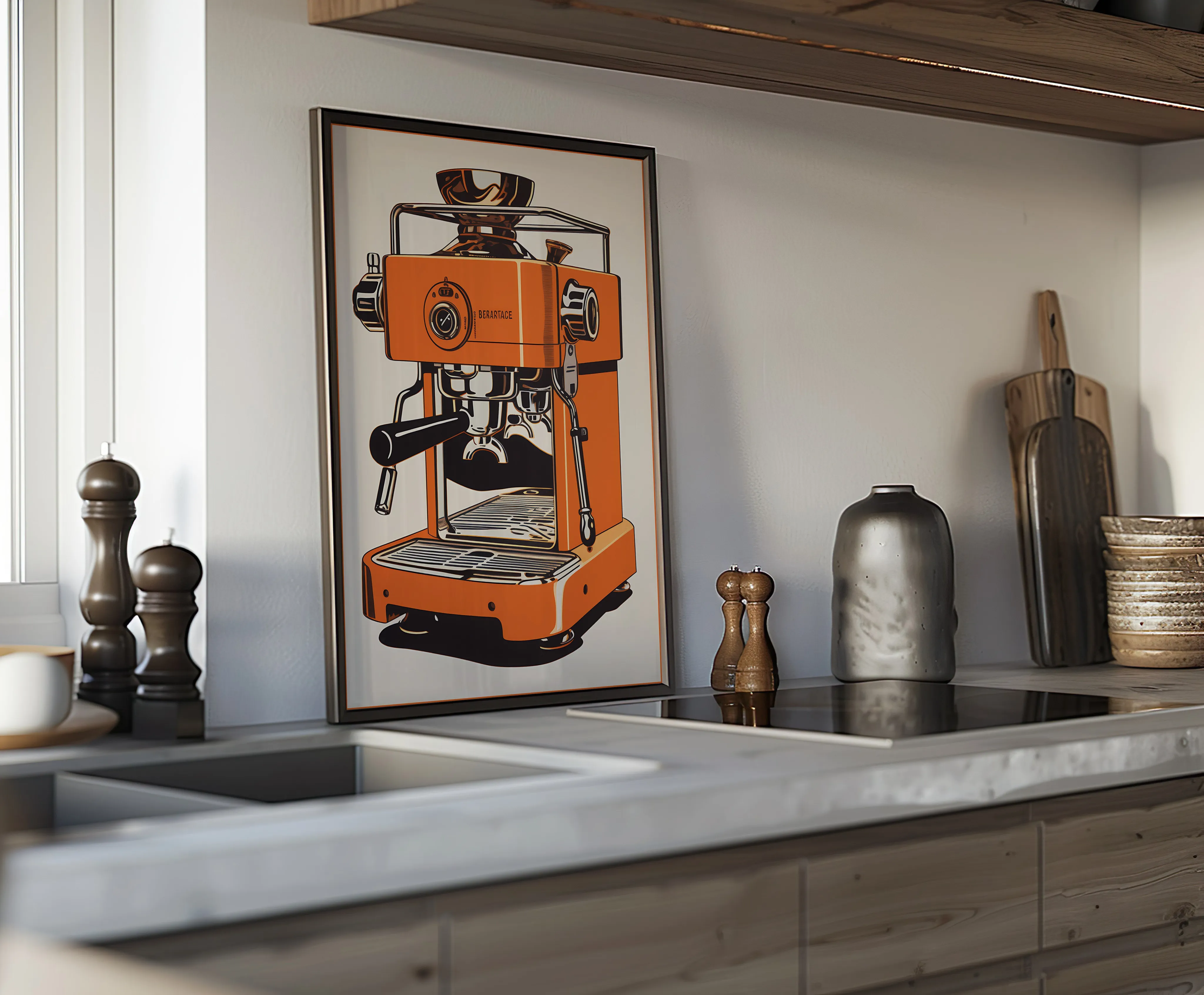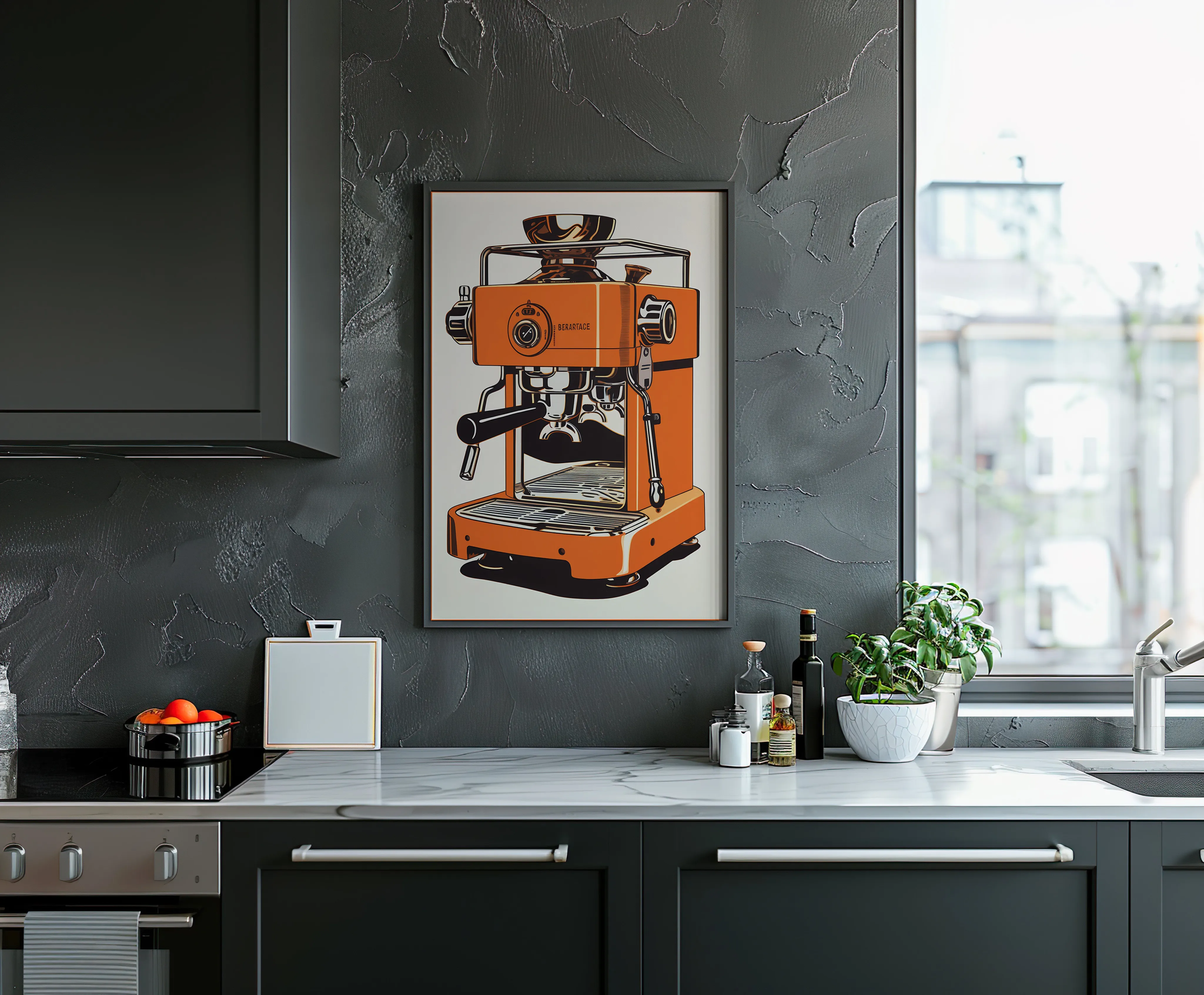 eine stilisierte Illustration einer knallorangefarbenen Espressomaschine im Retro-Look.