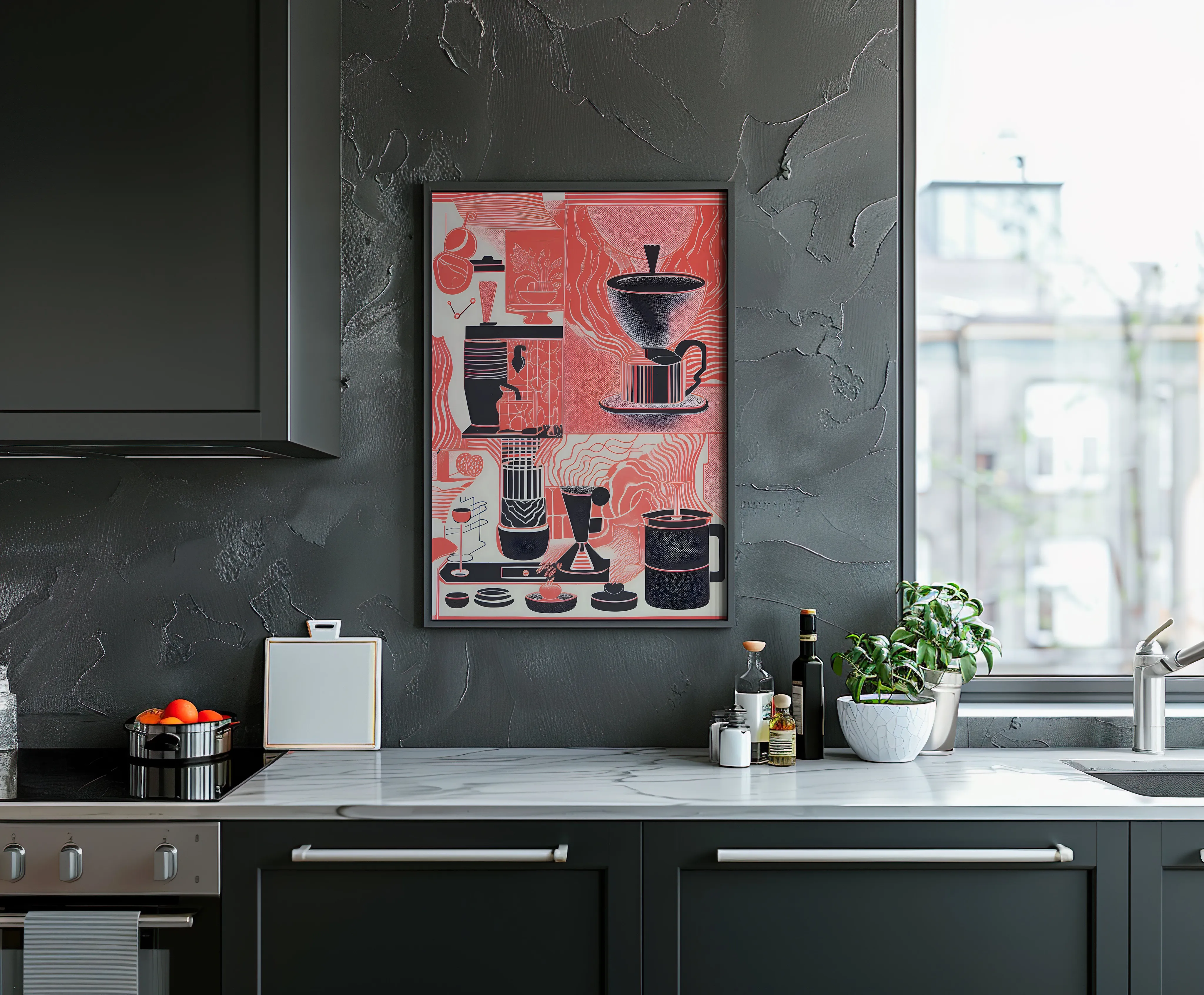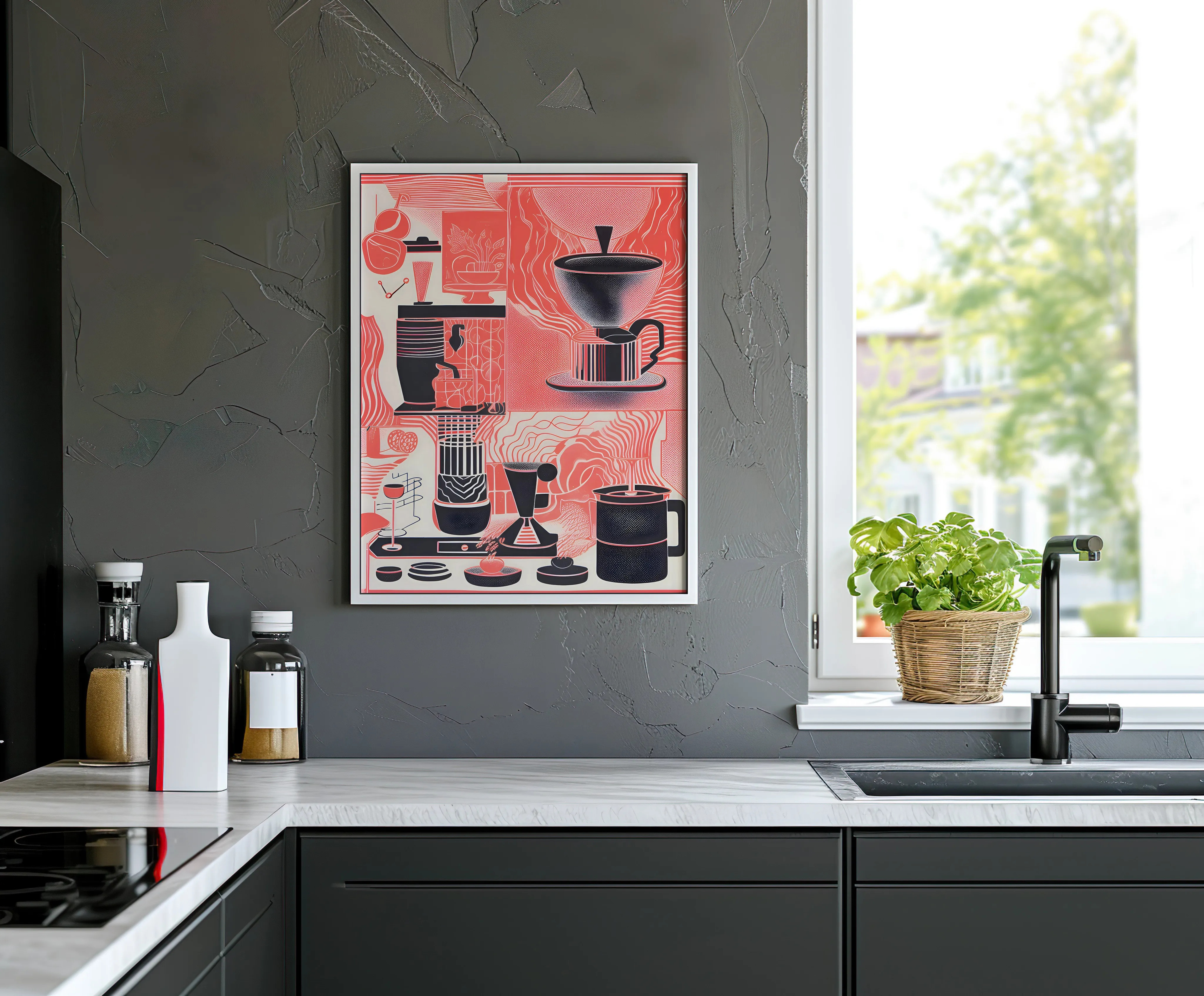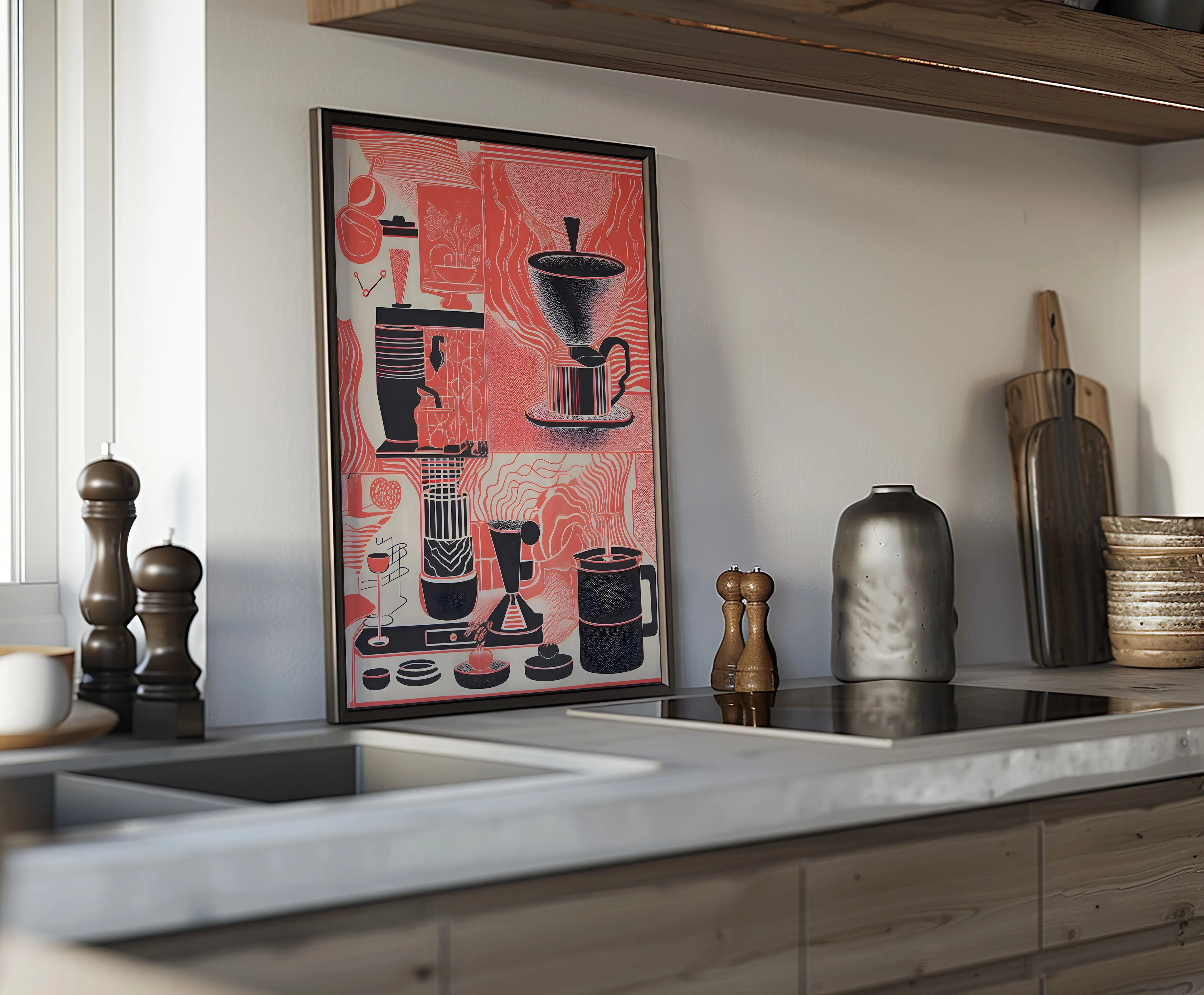eine stilisierte, grafisch-abstrakte Darstellung verschiedener Kaffeekultur-Elemente in einem geometrischen, fast kubistischen Aufbau. In mehreren Segmenten sind Kaffeemühlen, Espressokocher, Kaffeetassen und andere Utensilien abgebildet.
