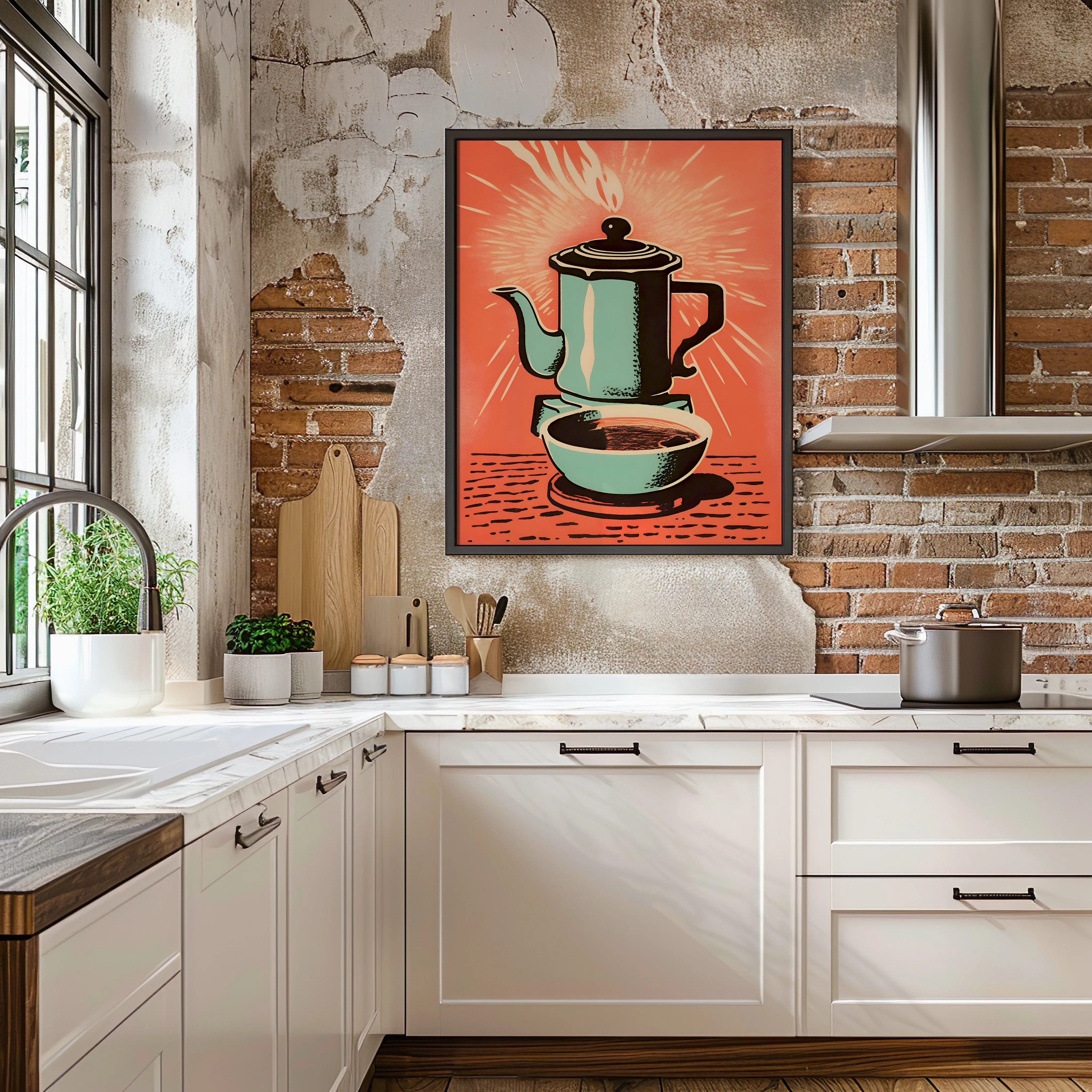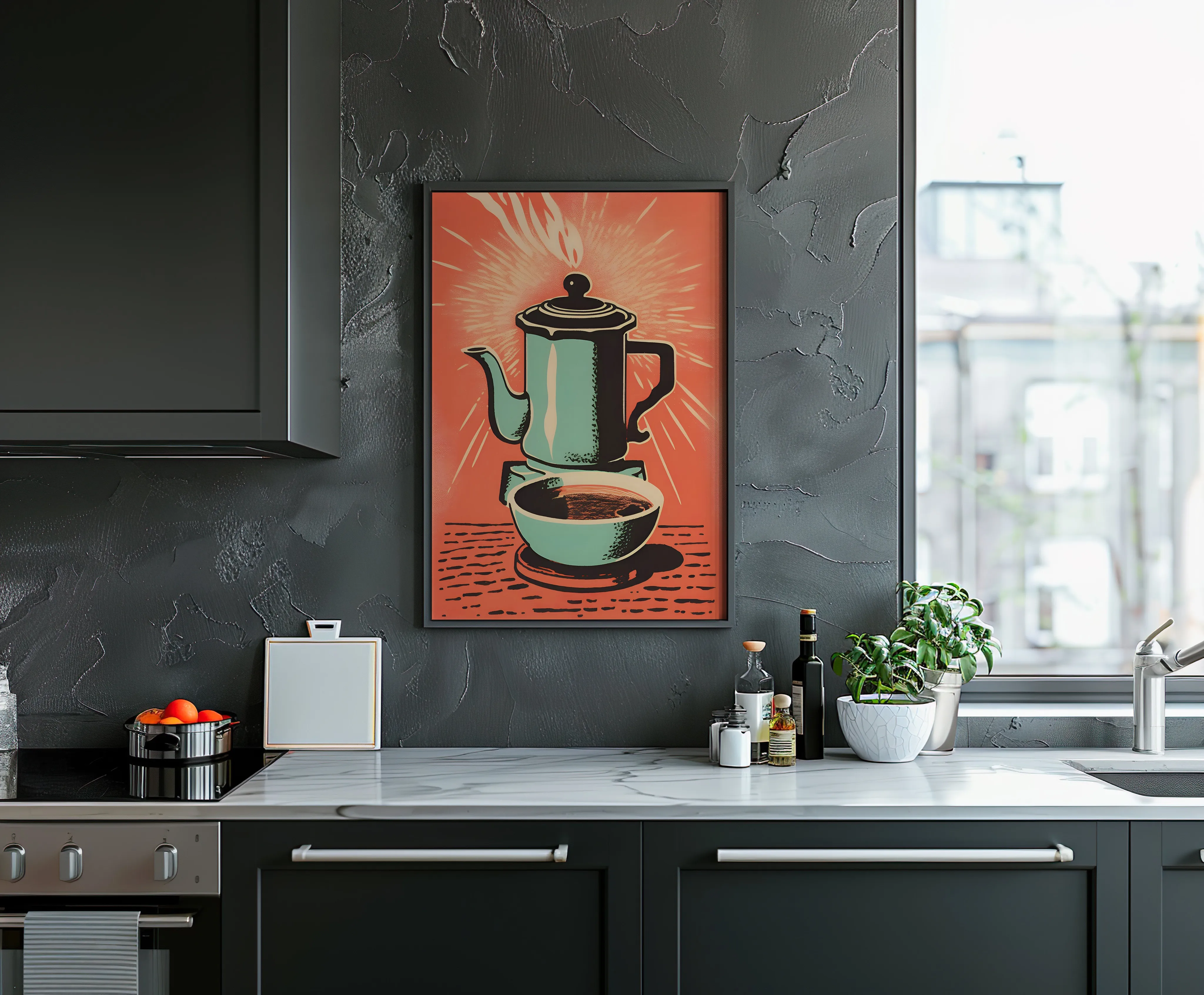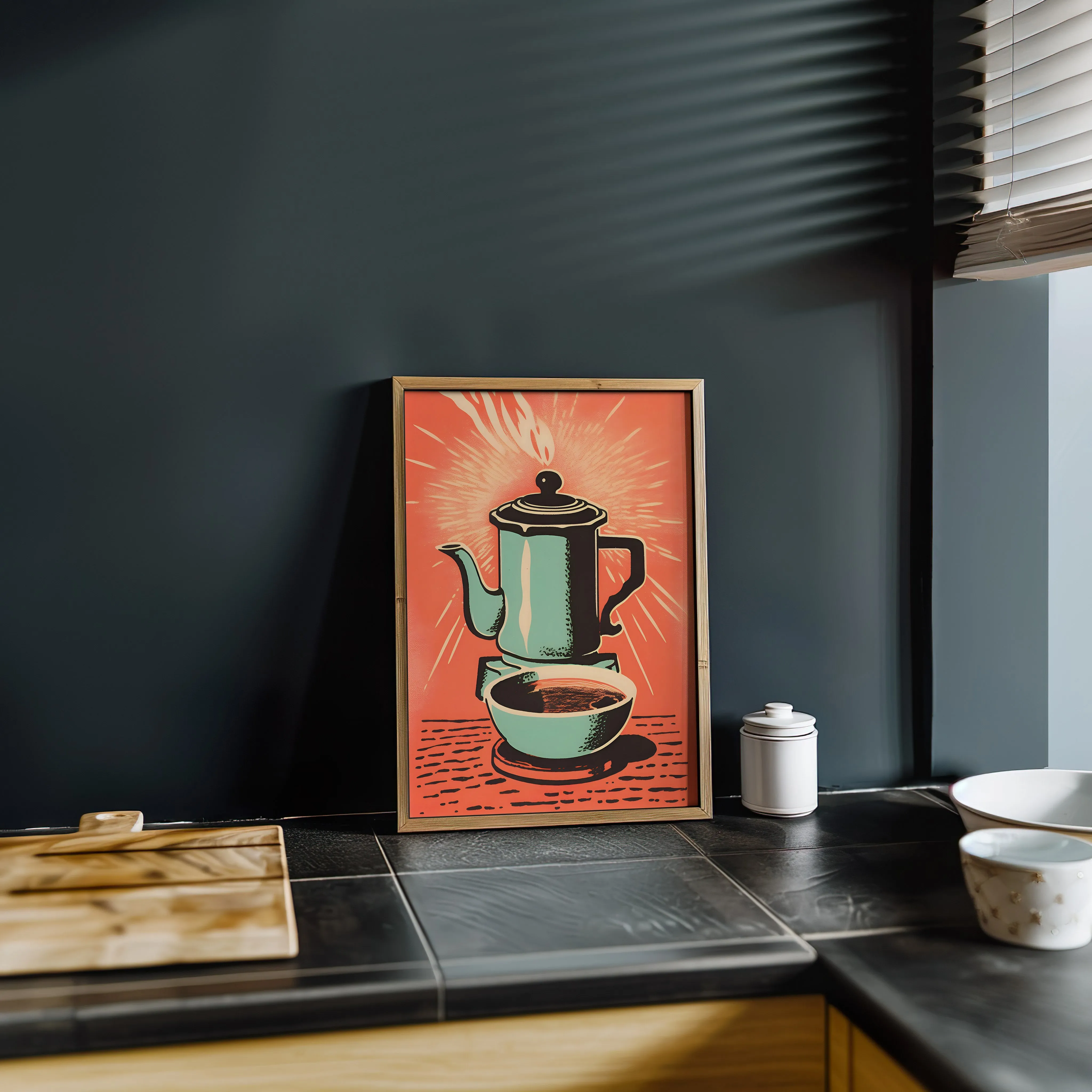 eine kräftige, pop-art-inspirierte Darstellung einer klassischen Kaffeekanne zusammen mit einer großen, gefüllten Kaffeetasse im Vordergrund.