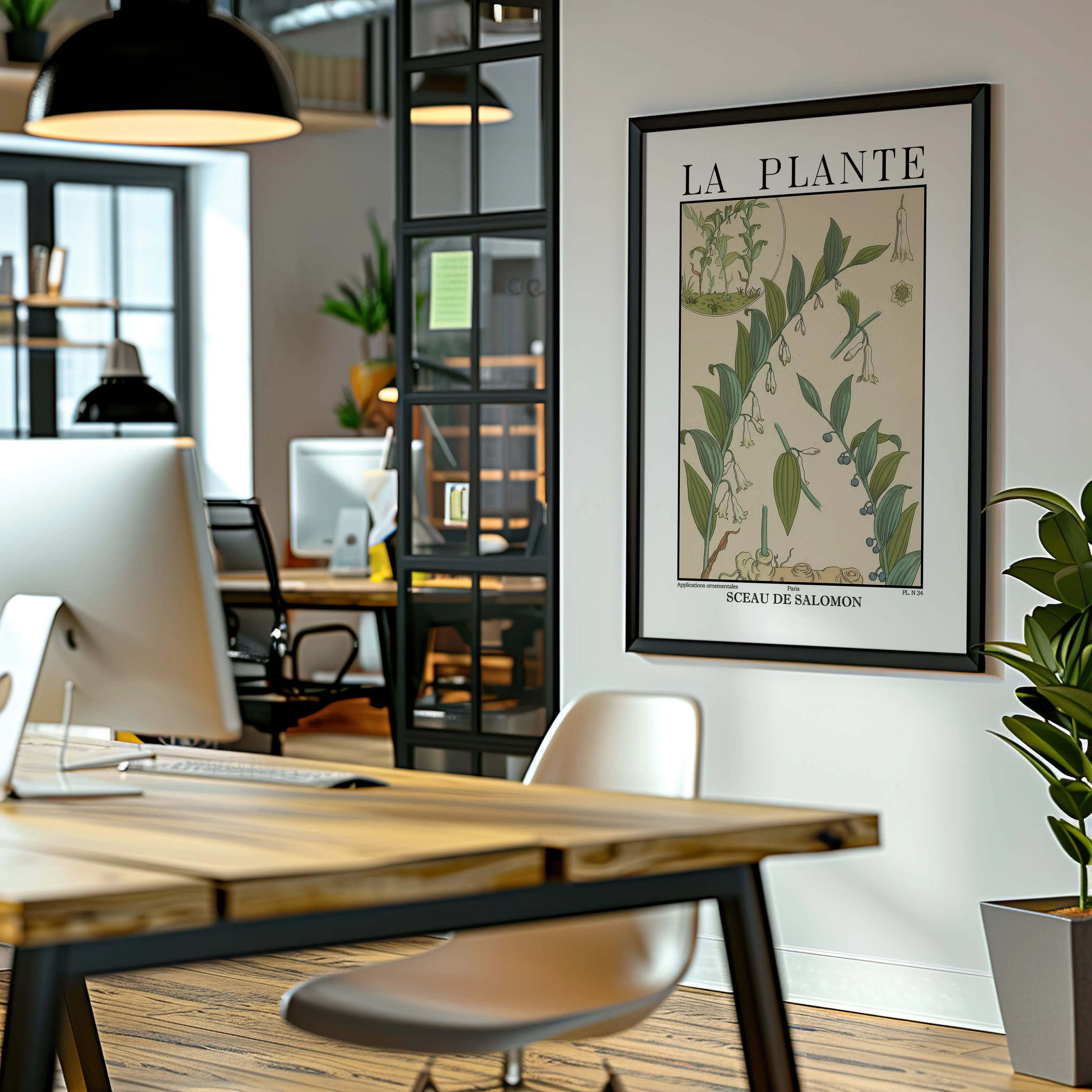 Blatt stammt aus dem Werk La Plante et ses applications ornementales, das 1896 in Paris unter der Leitung von Eugène-Samuel Grasset erschien. Abgebildet ist das Salomonssiegel (Sceau de Salomon, botanisch Polygonatum multiflorum) mit seinen charakteristischen überhängenden Stängeln, länglichen Blättern und weißen glockenförmigen Blüten sowie den dunkelblauen Beeren.