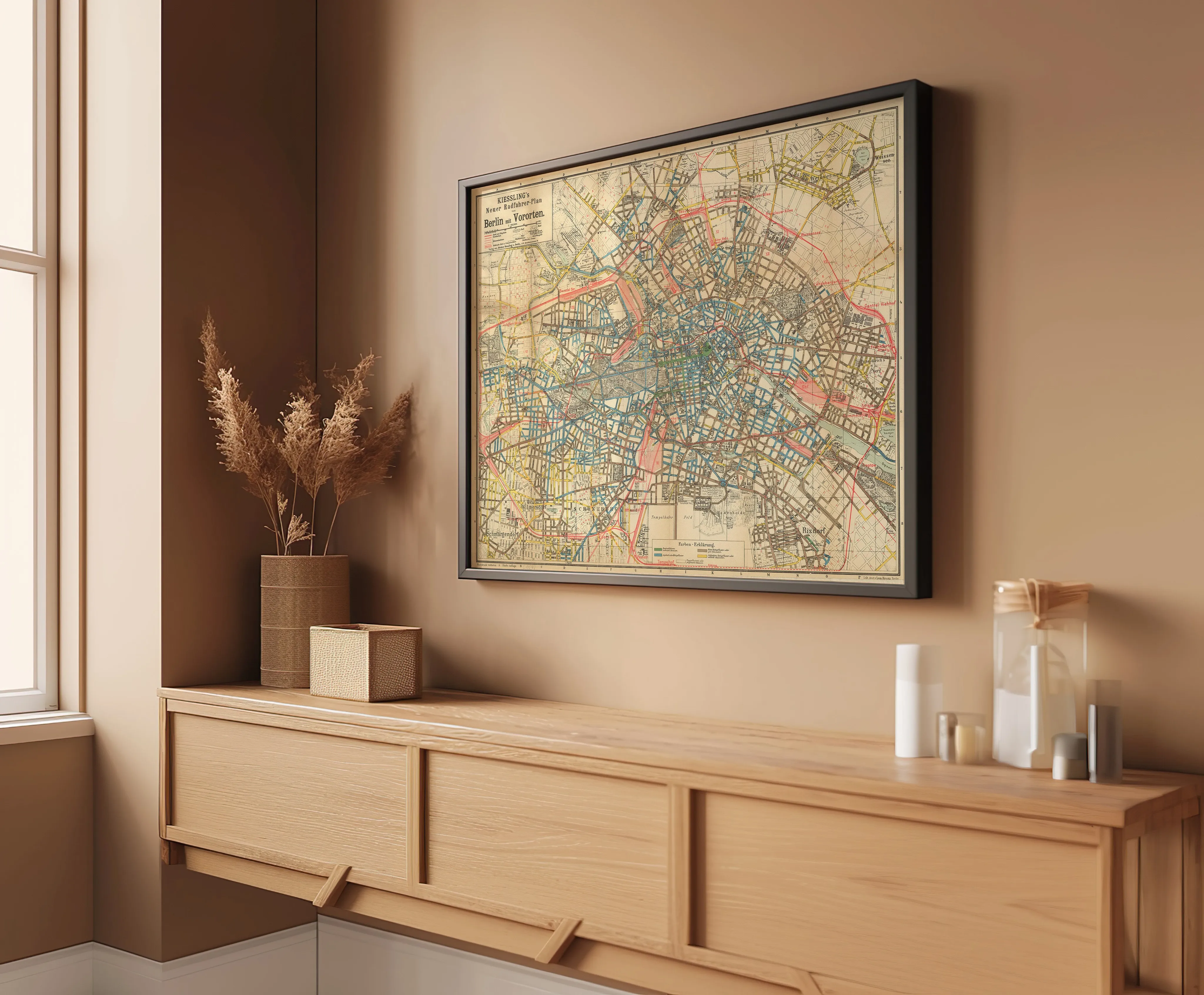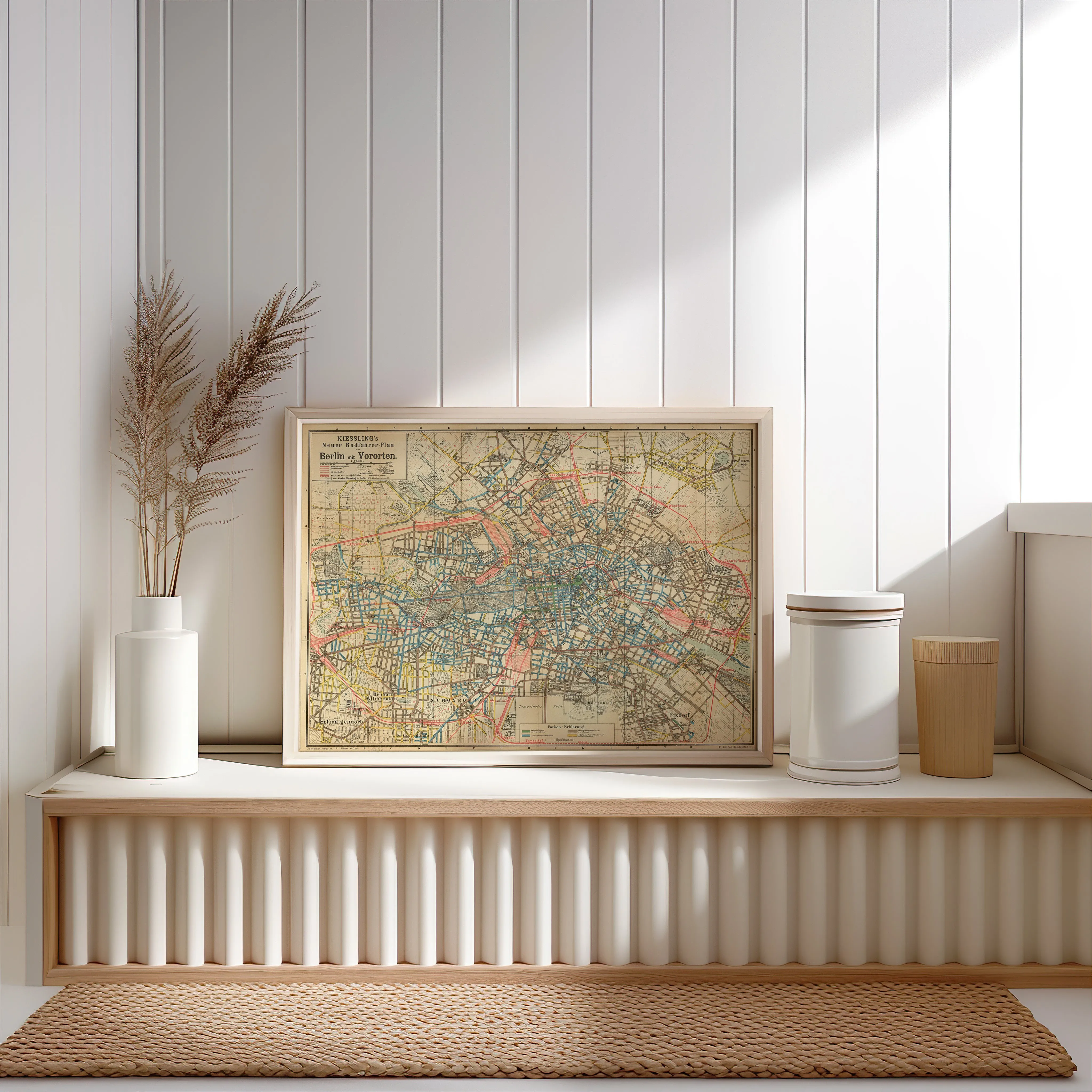 Plan von Berlin und den Vororten aus dem Jahr 1891. Die Karte ist farbig gestaltet und hebt durch unterschiedliche Schattierungen und Linien das Straßennetz, die Wasserläufe und die Grenzen der einzelnen Stadtteile hervor. Besonders auffällig sind die blau und rot markierten Bereiche, die wichtige Verkehrswege sowie unterschiedliche Nutzungszonen kennzeichnen.