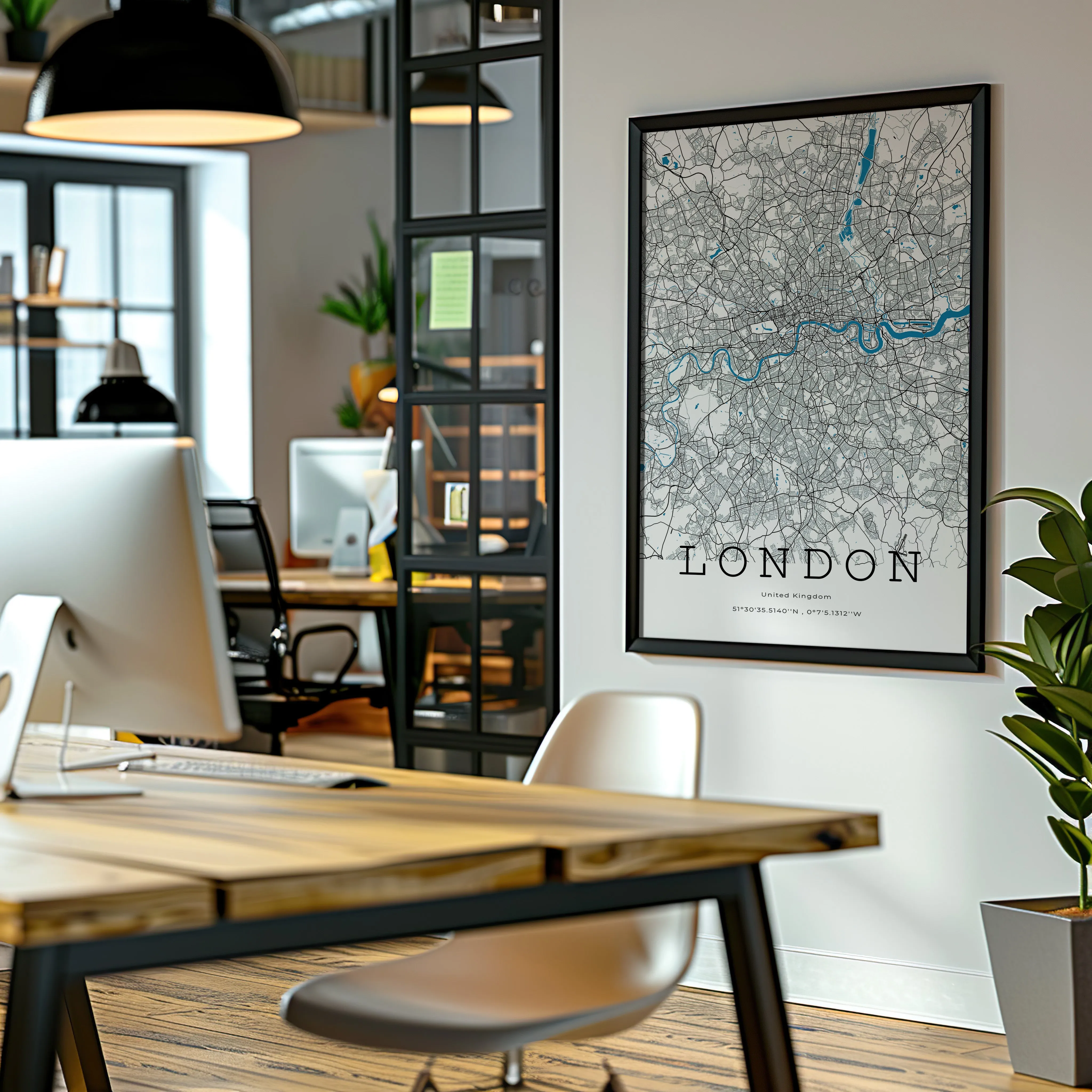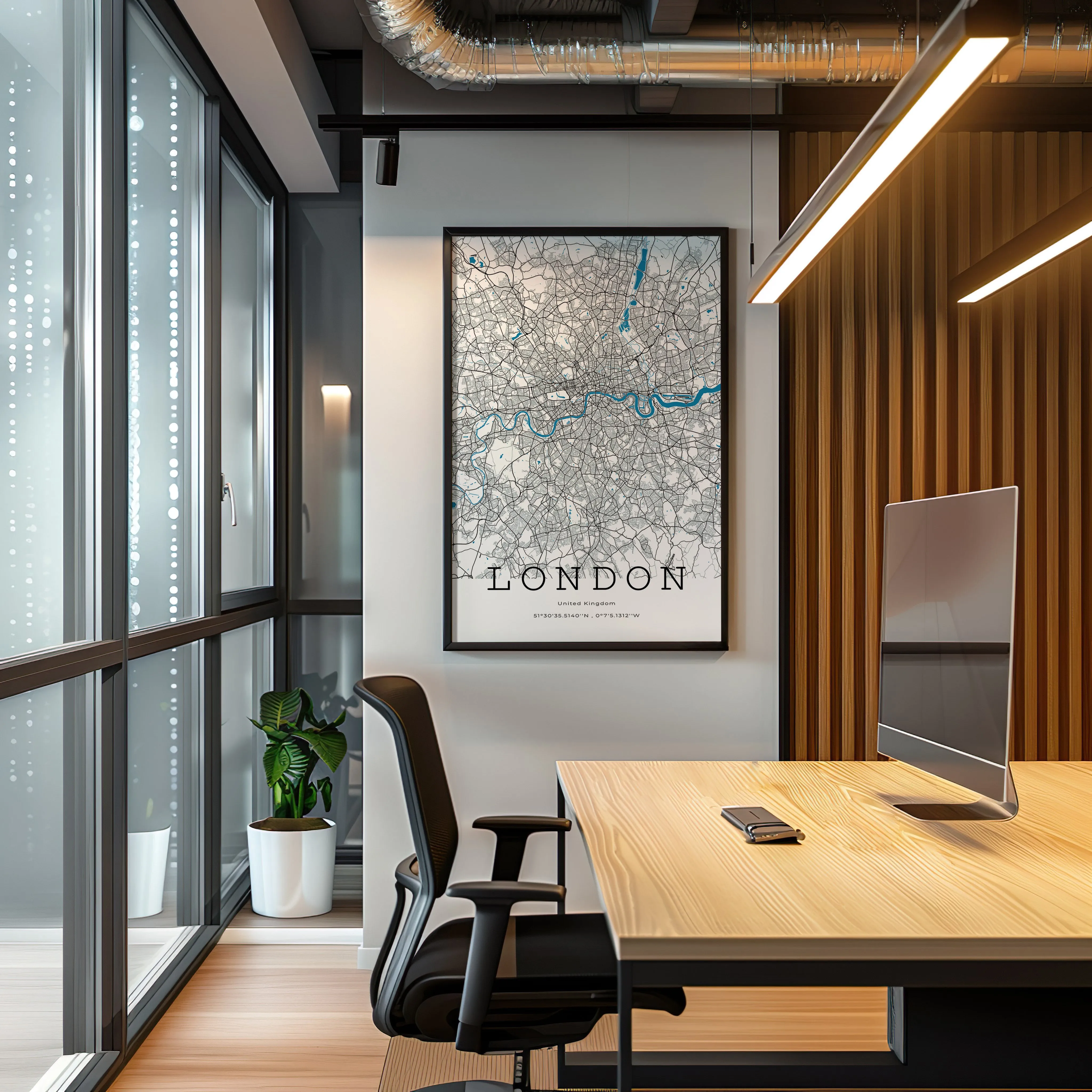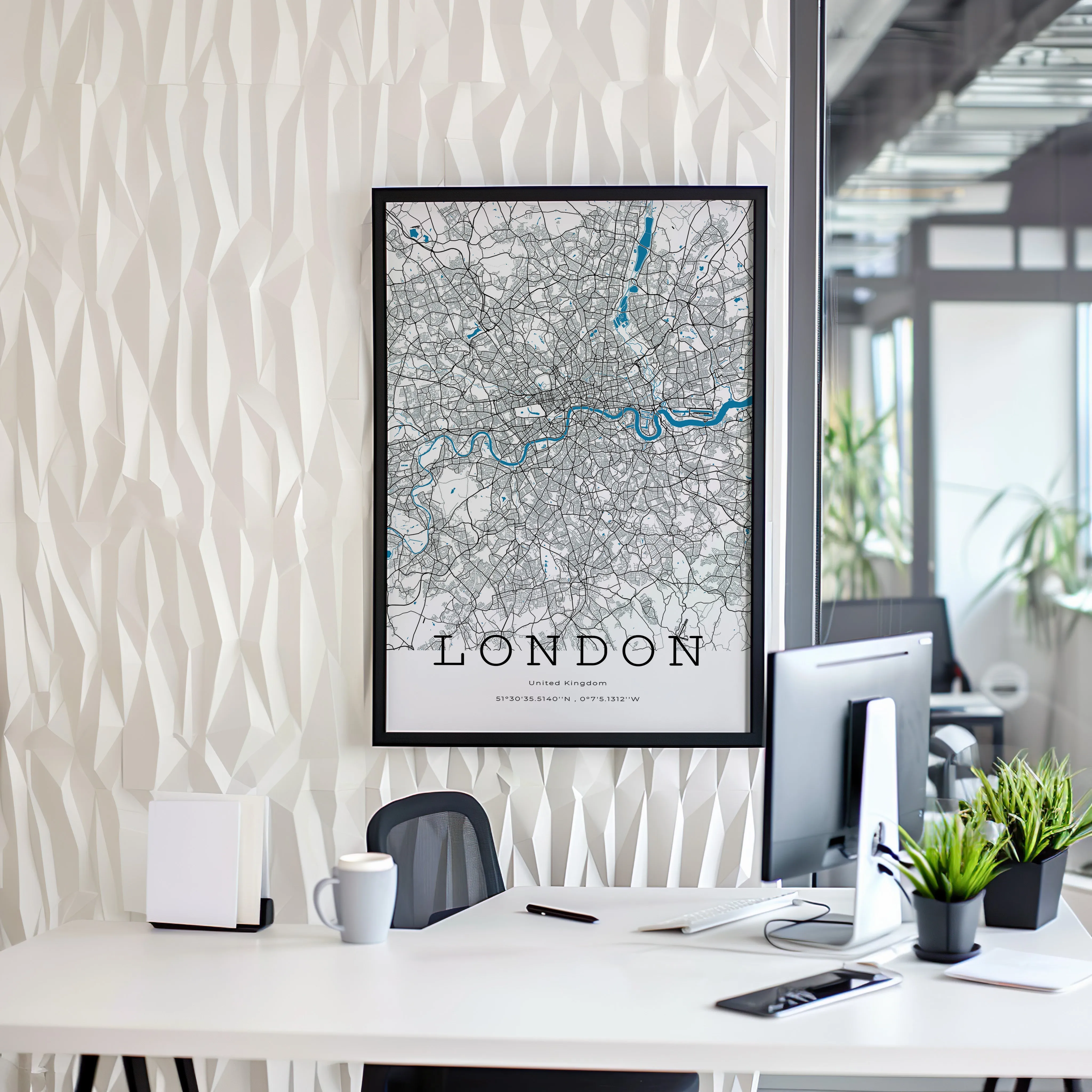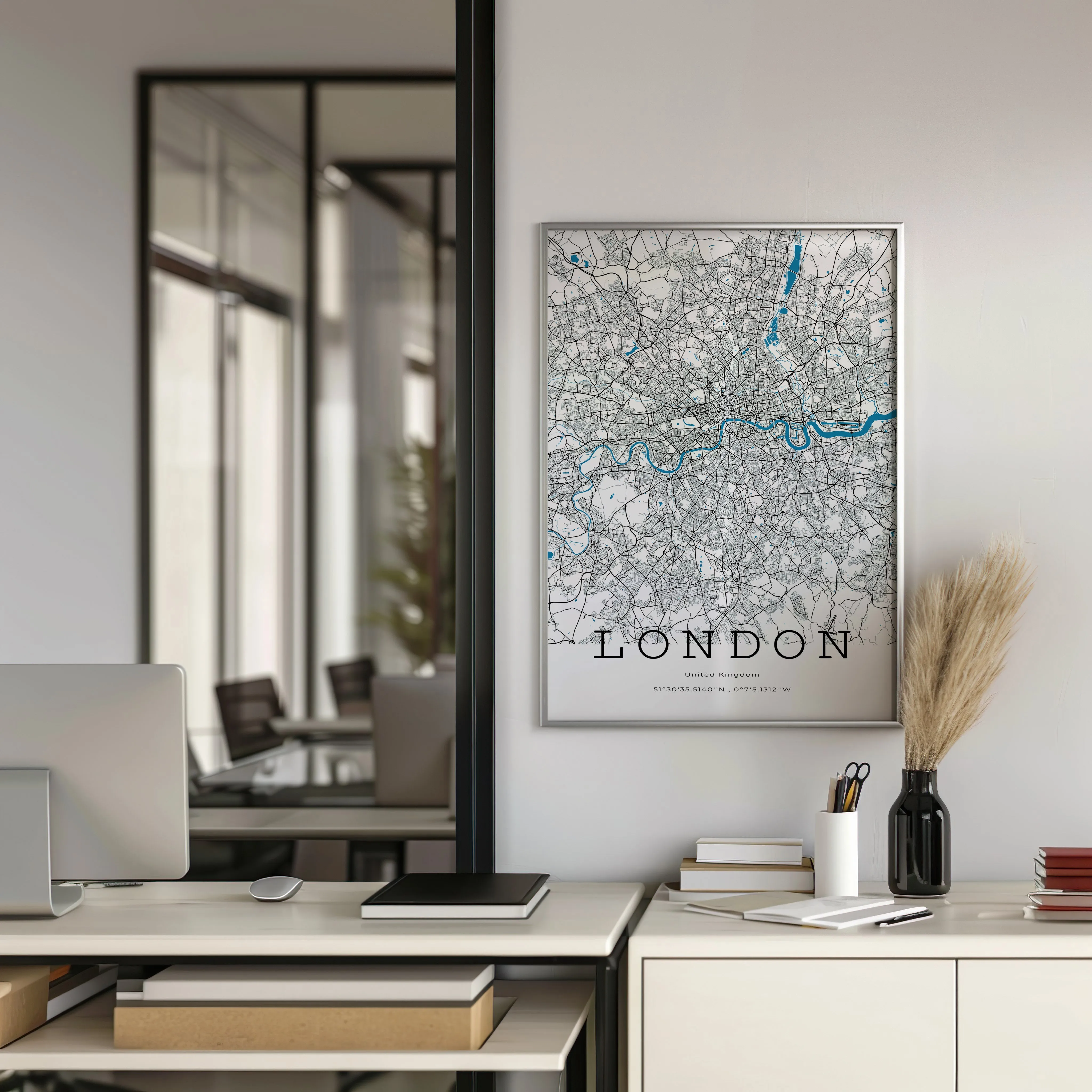ein modernes Stadtplan-Poster von London. Im Mittelpunkt steht das detaillierte Straßennetz der britischen Hauptstadt, während die Themse und weitere Gewässer in Blau hervorgehoben sind.