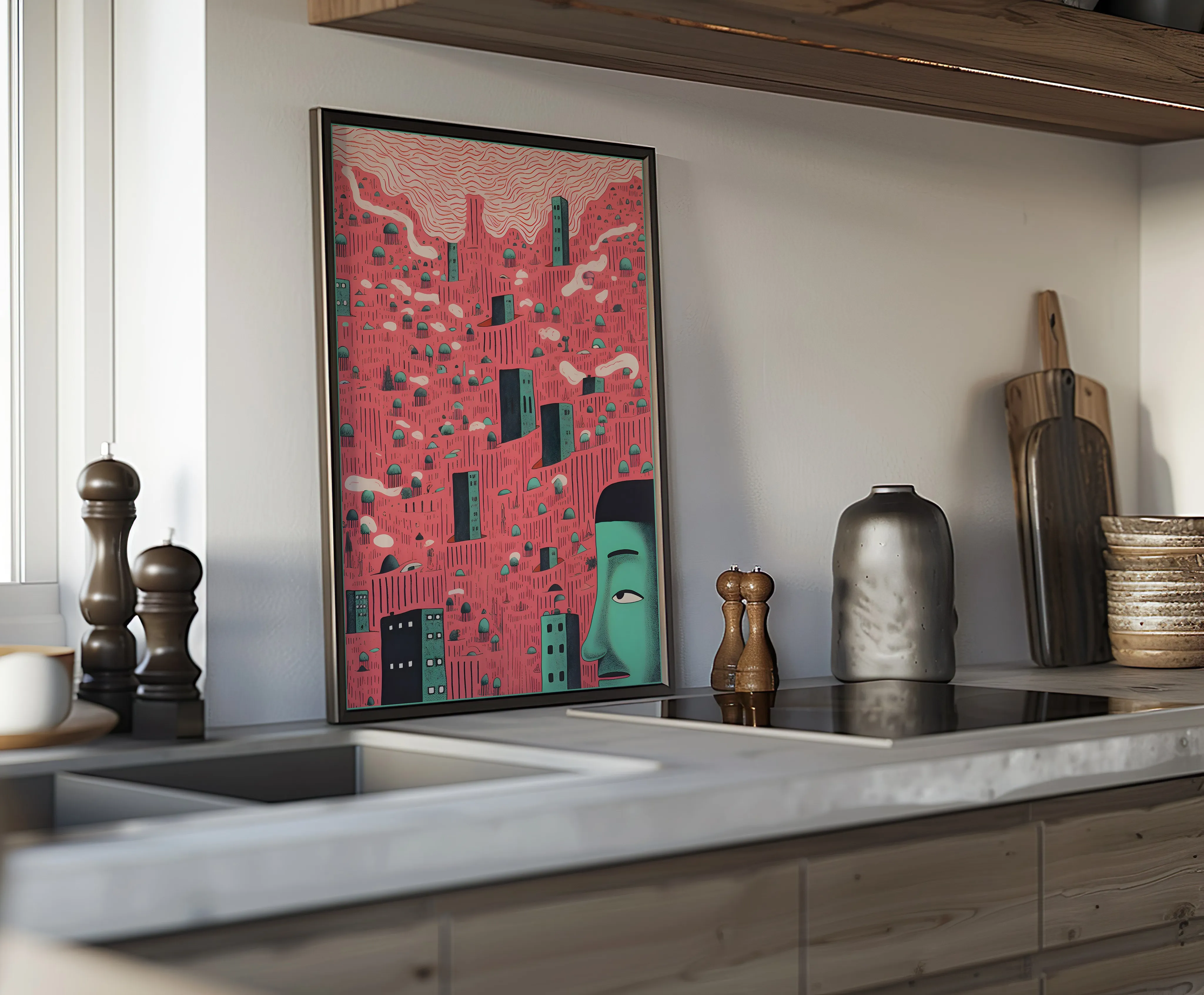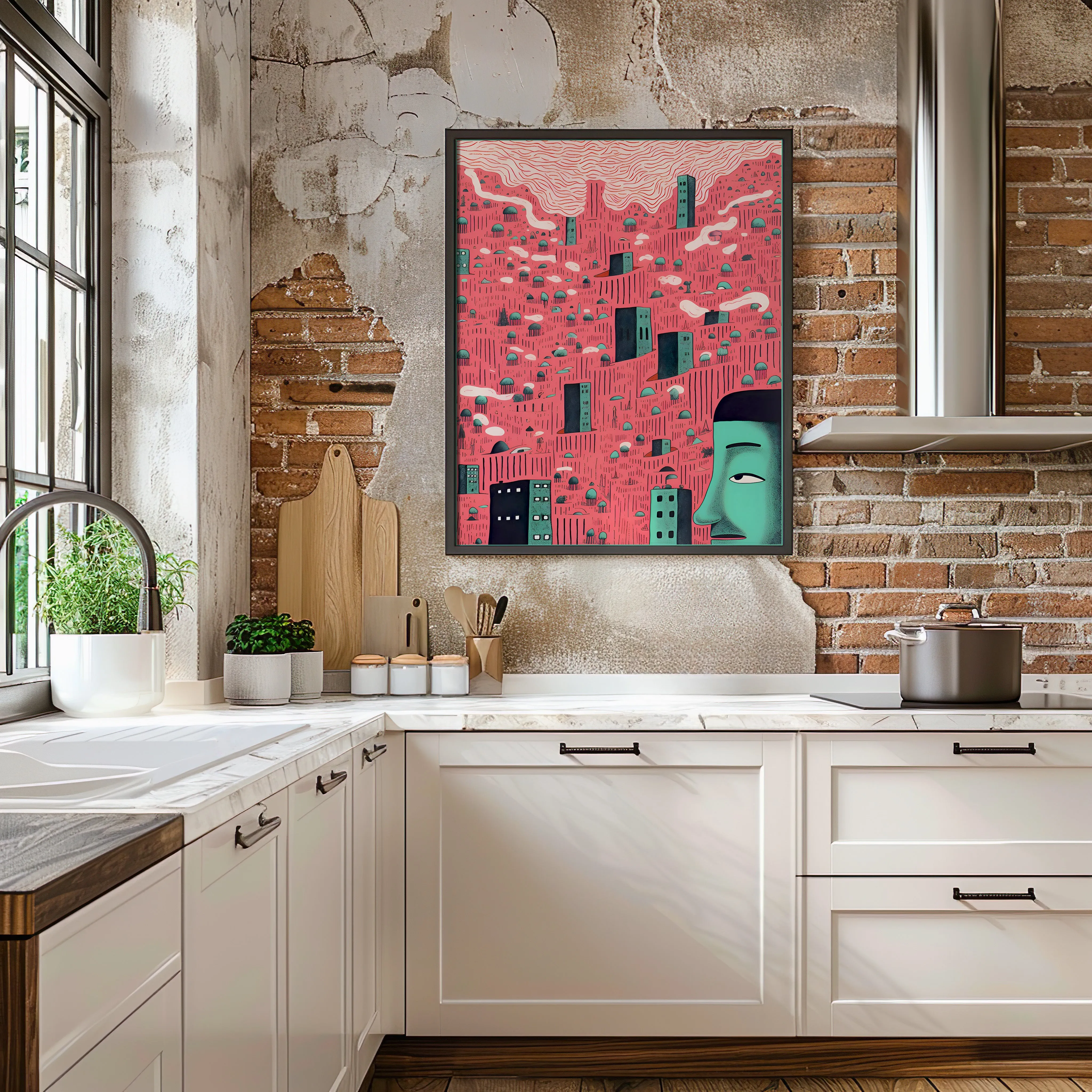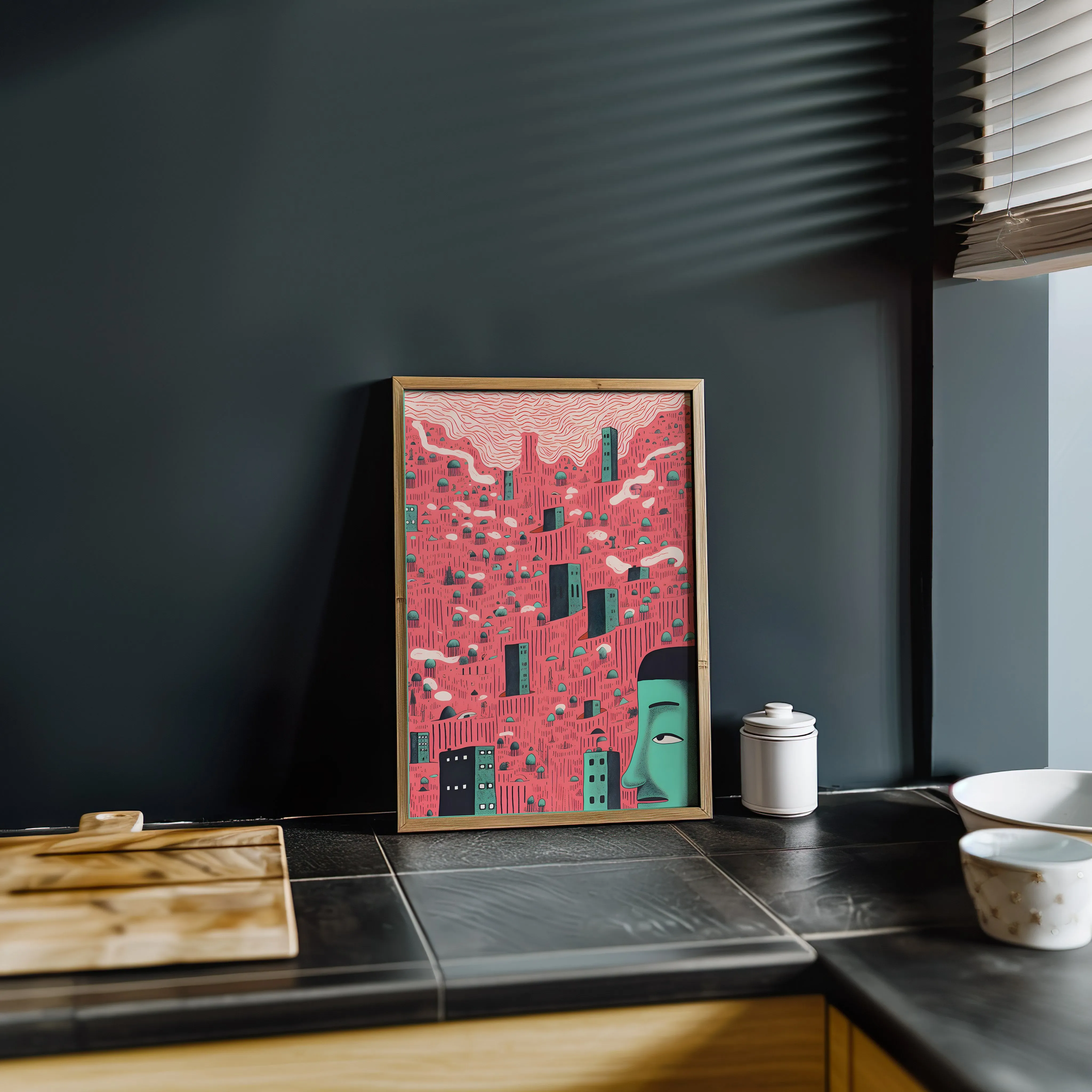 This artwork uses a bold palette of coral pink, teal-green, black, and soft cream, creating strong contrast and a modern visual impact. The subject depicts a surreal city landscape filled with tall buildings, small trees, and winding paths, while a large stylized human face appears in the foreground as if quietly observing the city. The piece appears to be created with digital illustration techniques featuring clean linework, flat color areas, and textured shading, giving it a contemporary and slightly abstract style. Due to its striking colors and urban theme, it would work well in spaces such as a living room, office, hallway, creative studio, or modern workspace, where bold artwork can become a focal point.