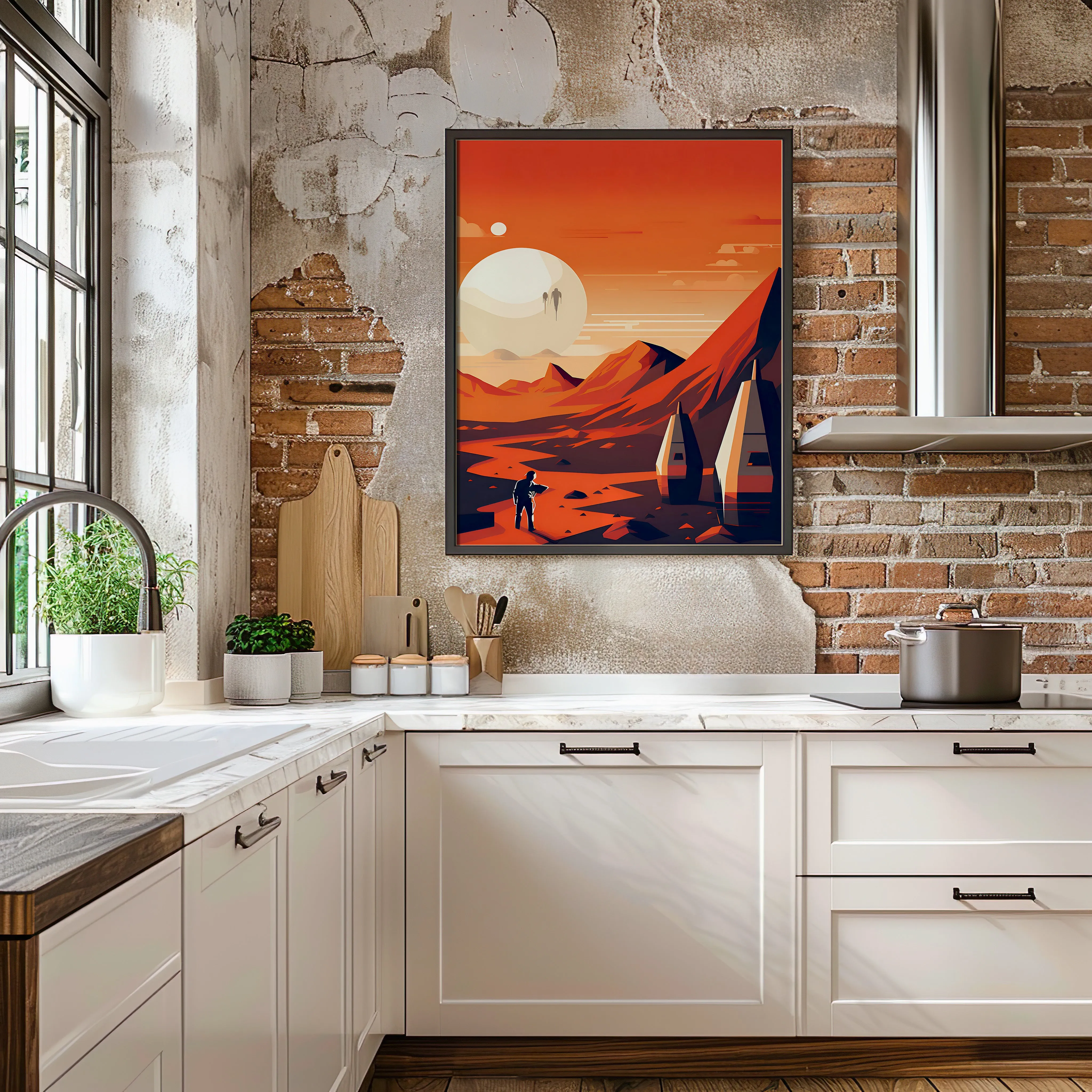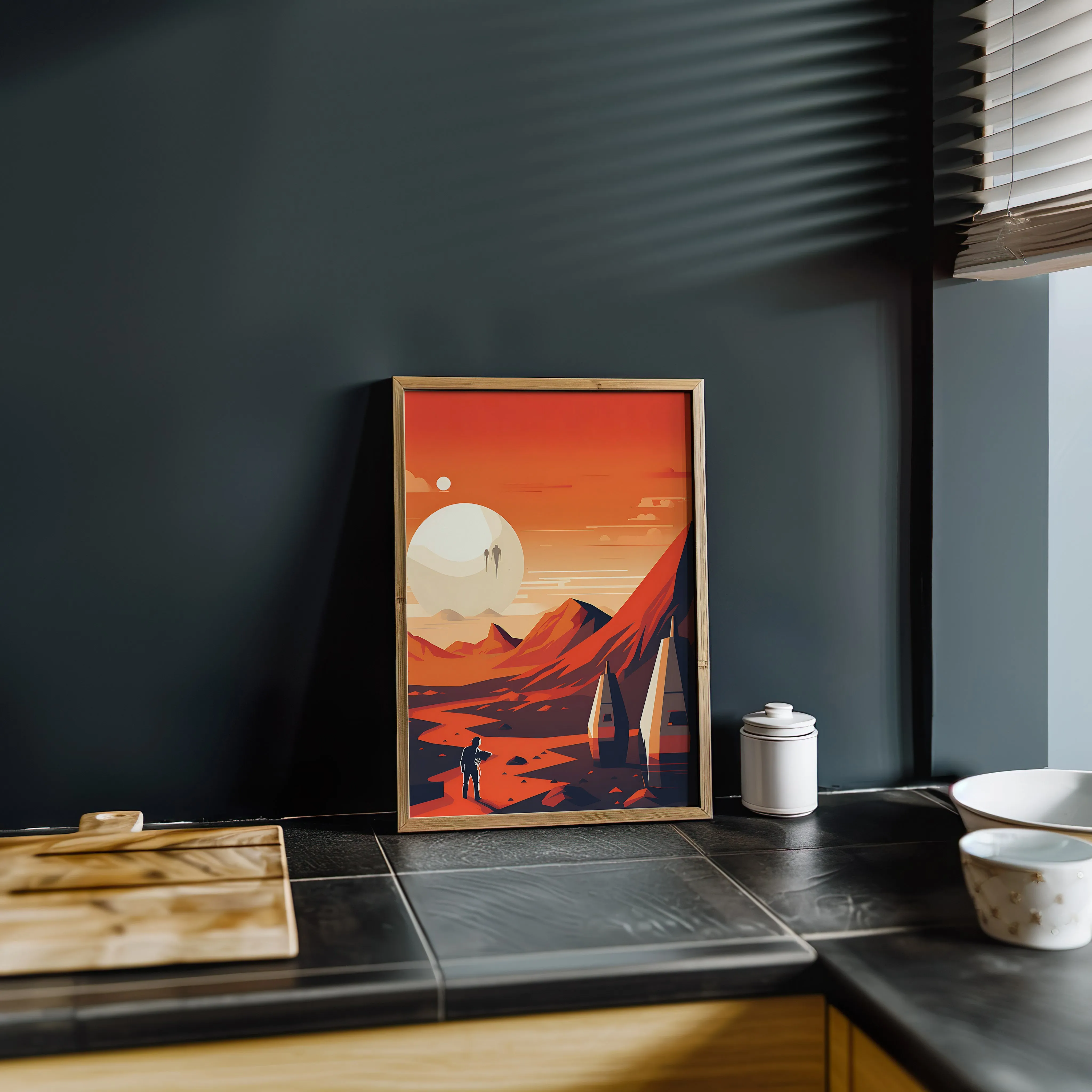 Poster zeigt eine futuristische, außerirdische Landschaft in kräftigen Rot- und Orangetönen.