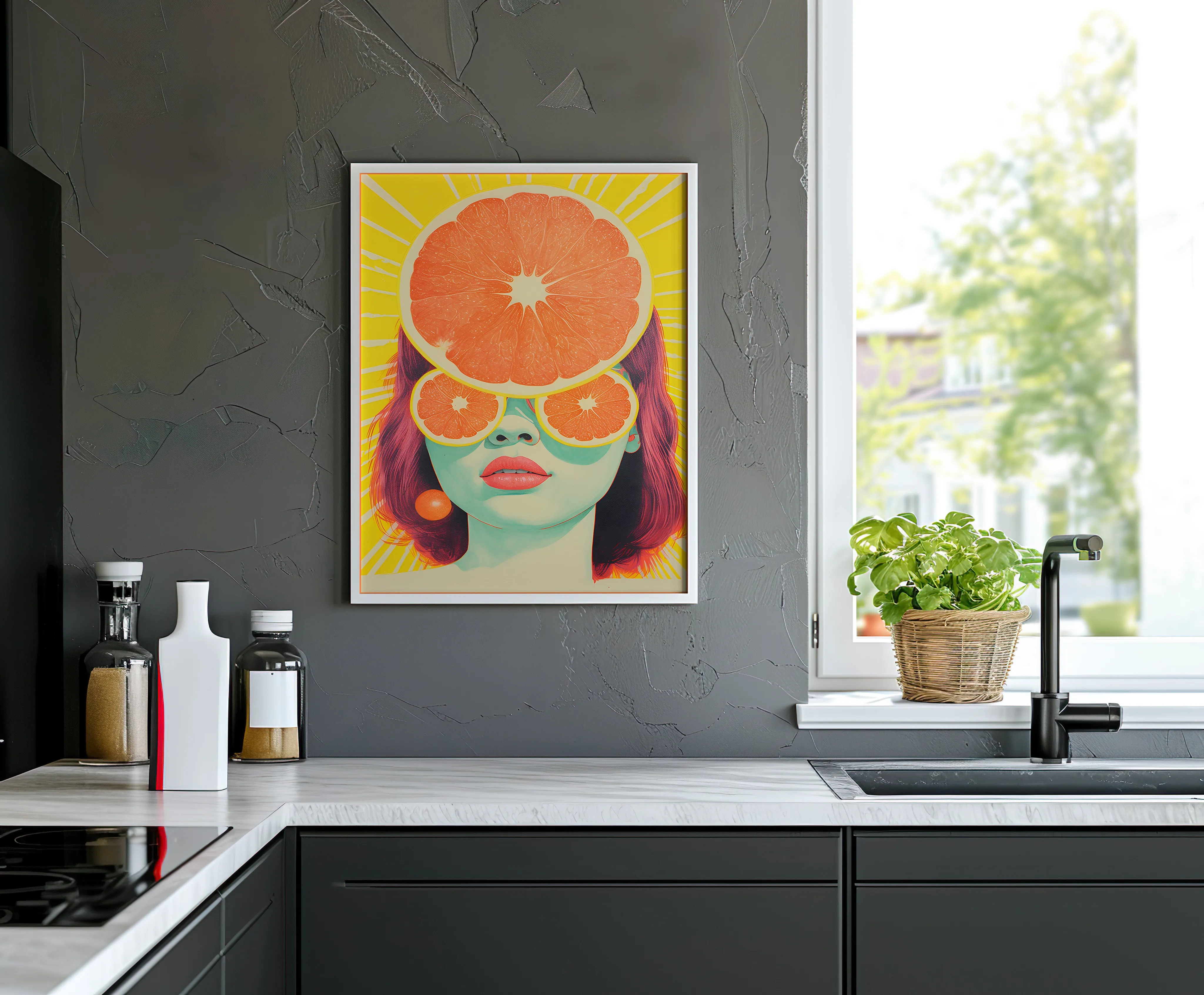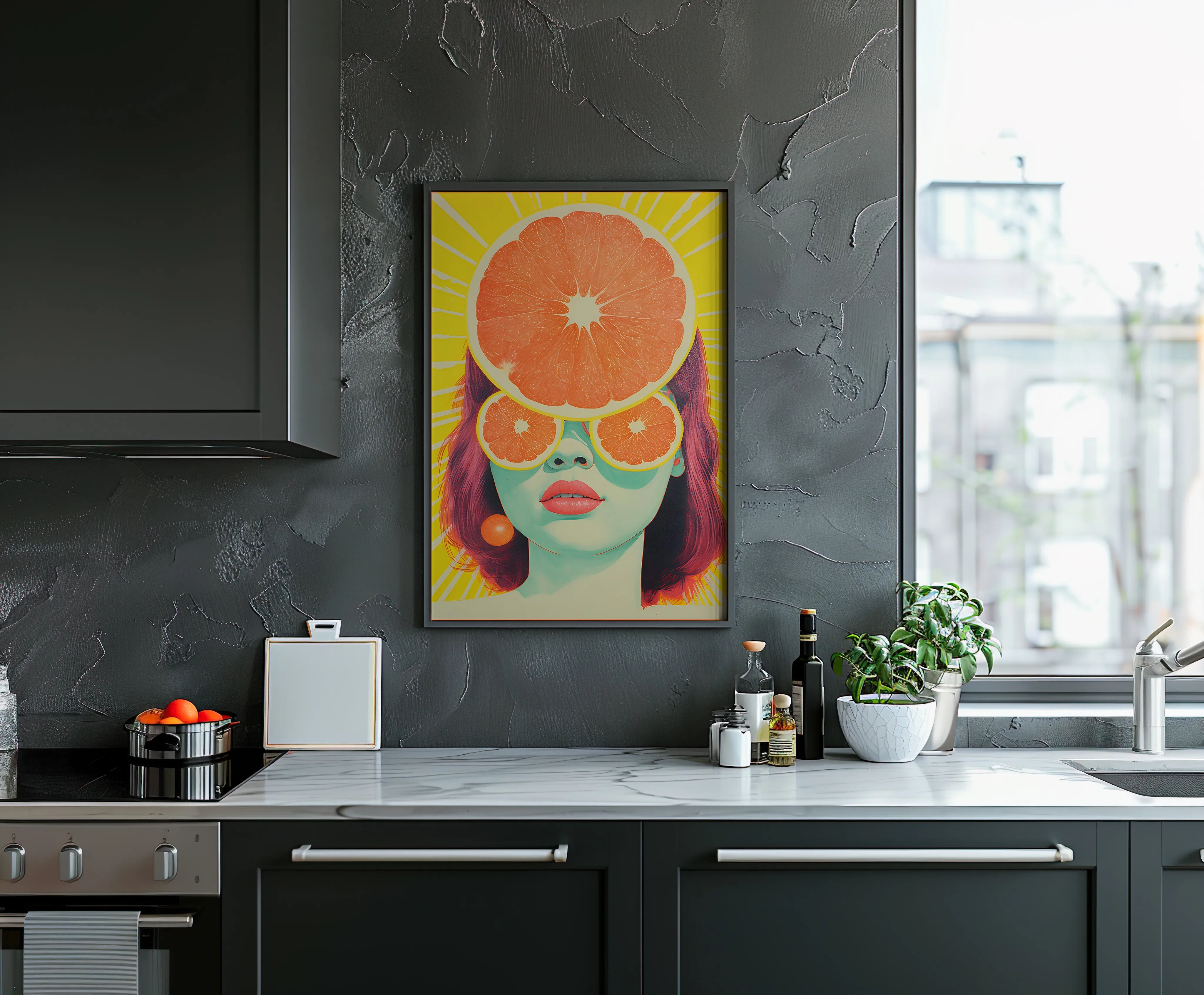 Poster zeigt ein pop-surrealistisches Porträt einer Frau, deren Gesicht von leuchtenden Zitrusfrüchten dominiert wird