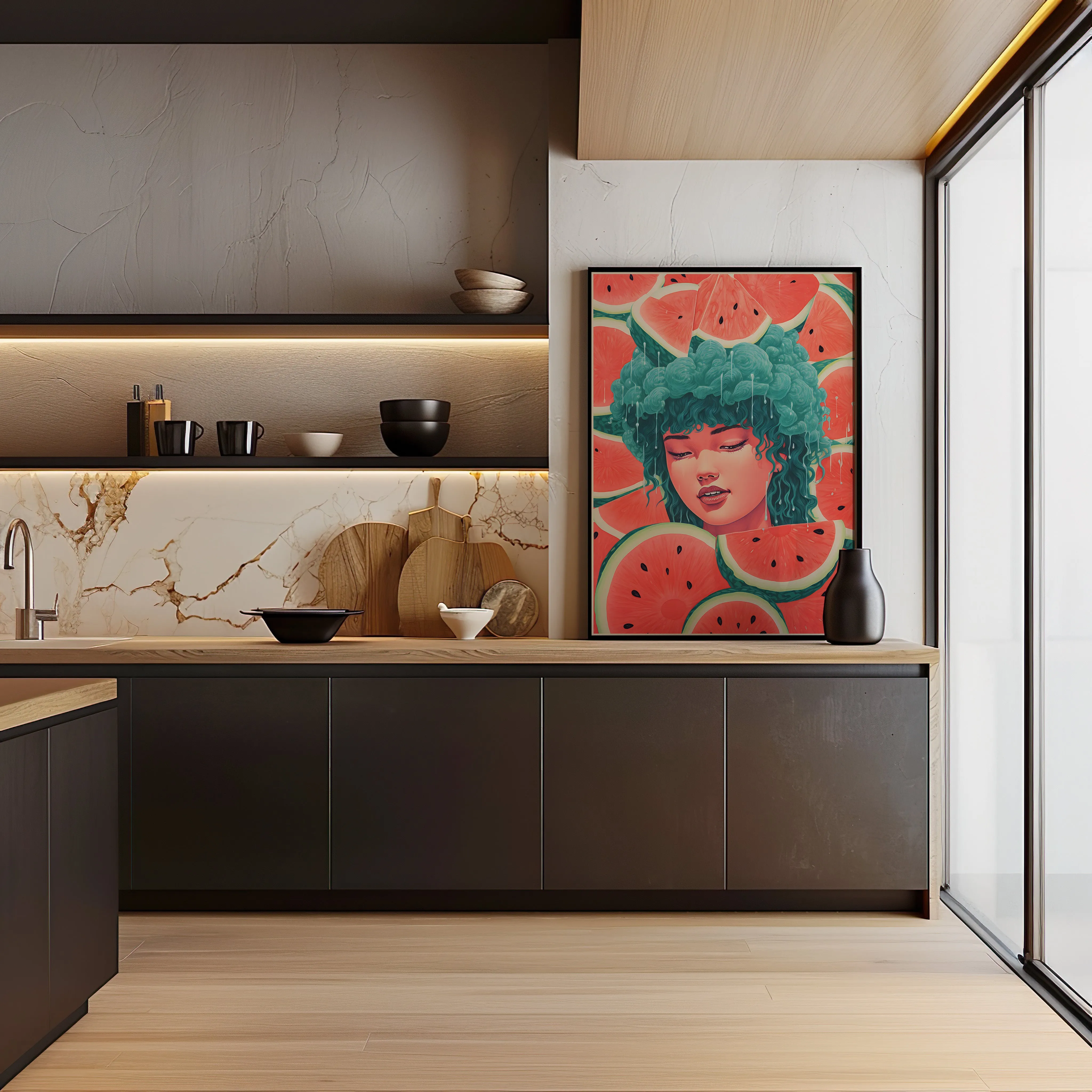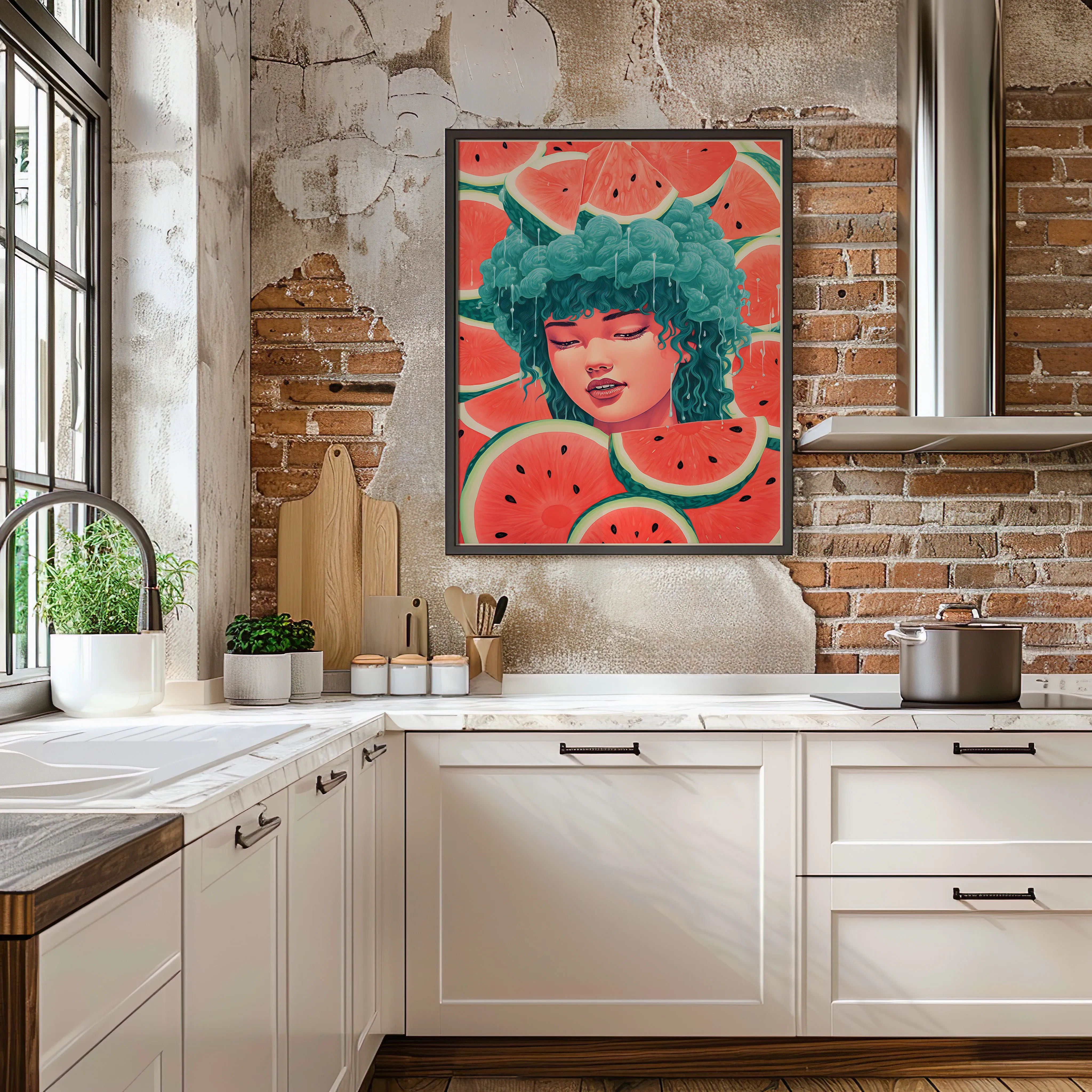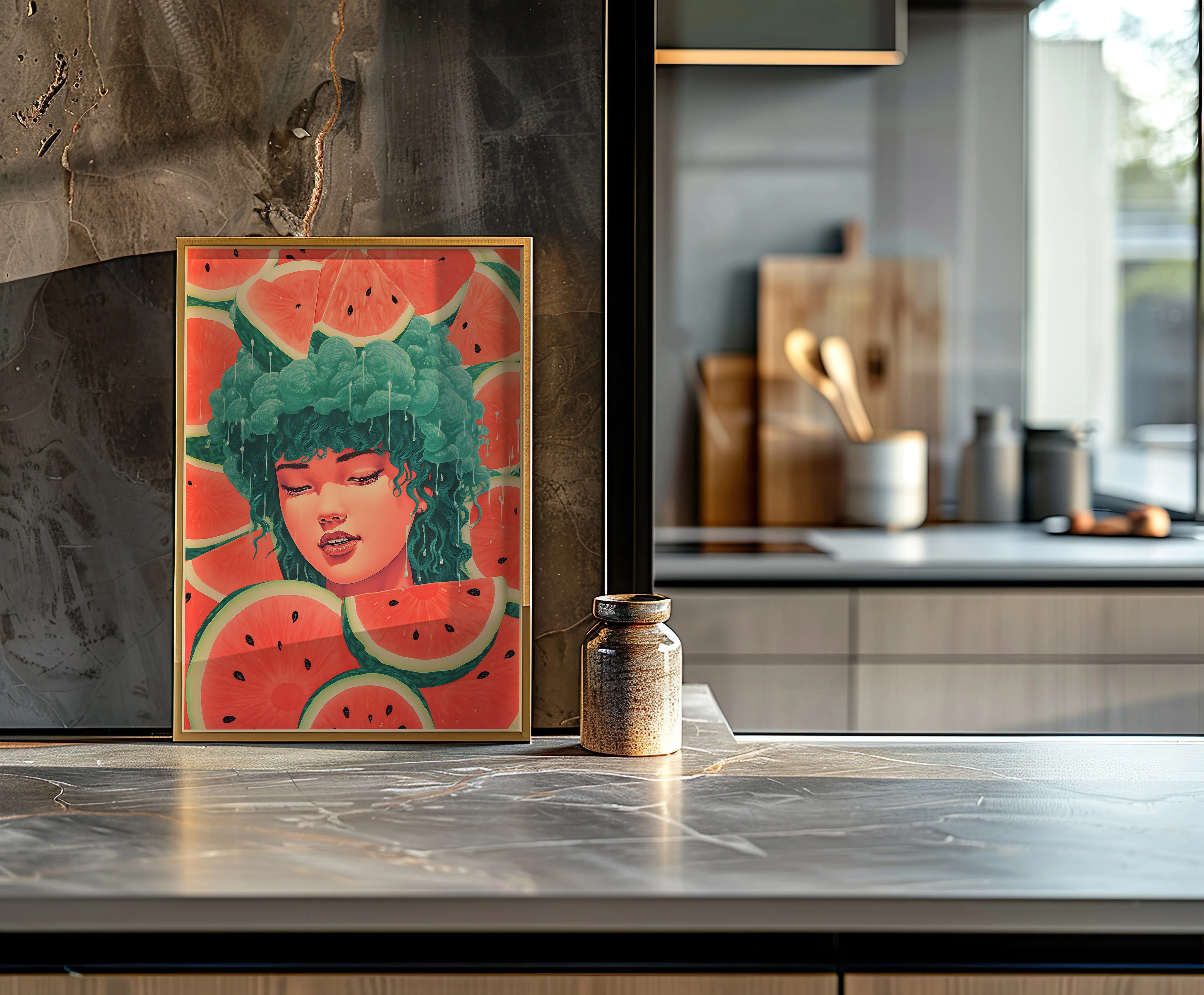 surreales Porträt einer Frau, deren Haarpracht in saftigen, tropfenden Wellen wie eine Mischung aus Wolken und Wassermelonen wirkt